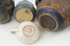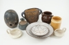 Sparbössa i form av uggla, Breglin. Vas med hänklar, AJ Höganäs, höjd 15 cm. Vas, Klase, Höganäs. Små skålar, 2 st, Åke Warnstad. Krus, 2 st. Skålar, 2 st, Yrma Yourstone (den lilla skålen med nagg).