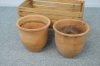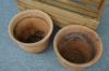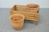 Längd på låda 72 cm. Krukornas diameter 34, höjd 33 cm. Jordrester. En kruka med spricka.