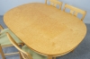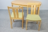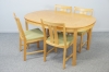 Etikettmärkt Skaraborgs möbelindustri AB. Bordets bredd 140, djup 100, höjd 72 cm. Stolarnas höjd 83, sitthöjd 44 cm. Två iläggsskivor á 50 cm.