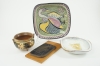 Fat, Laholm, diameter 25 cm, höjd 6,5 cm. Skål och fat, Upsala-Ekeby. Väggrelief, Bäckahästen, Carsten Ström.