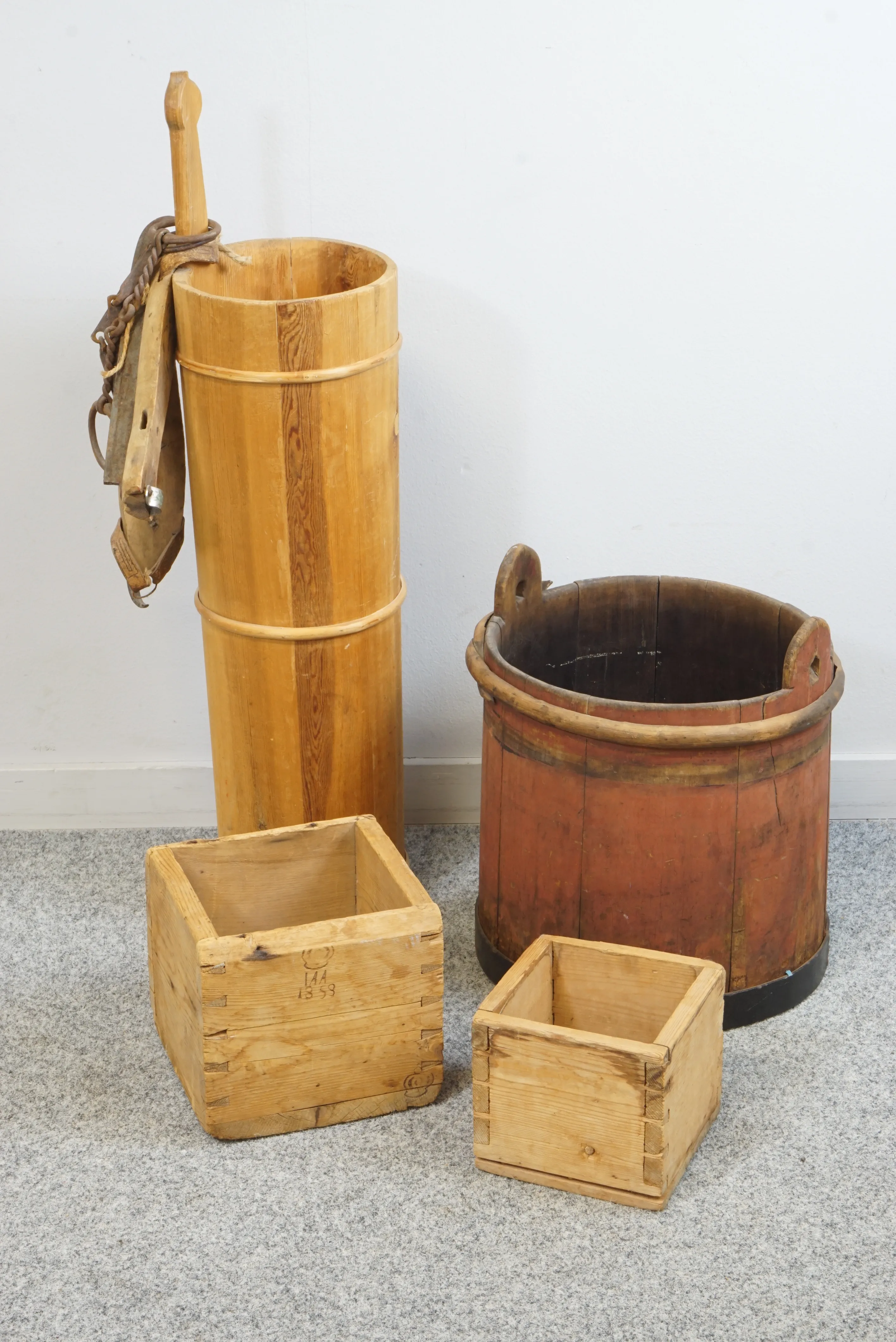 Två trämått daterad, ett daterad 1858, äldre skridskor m.m