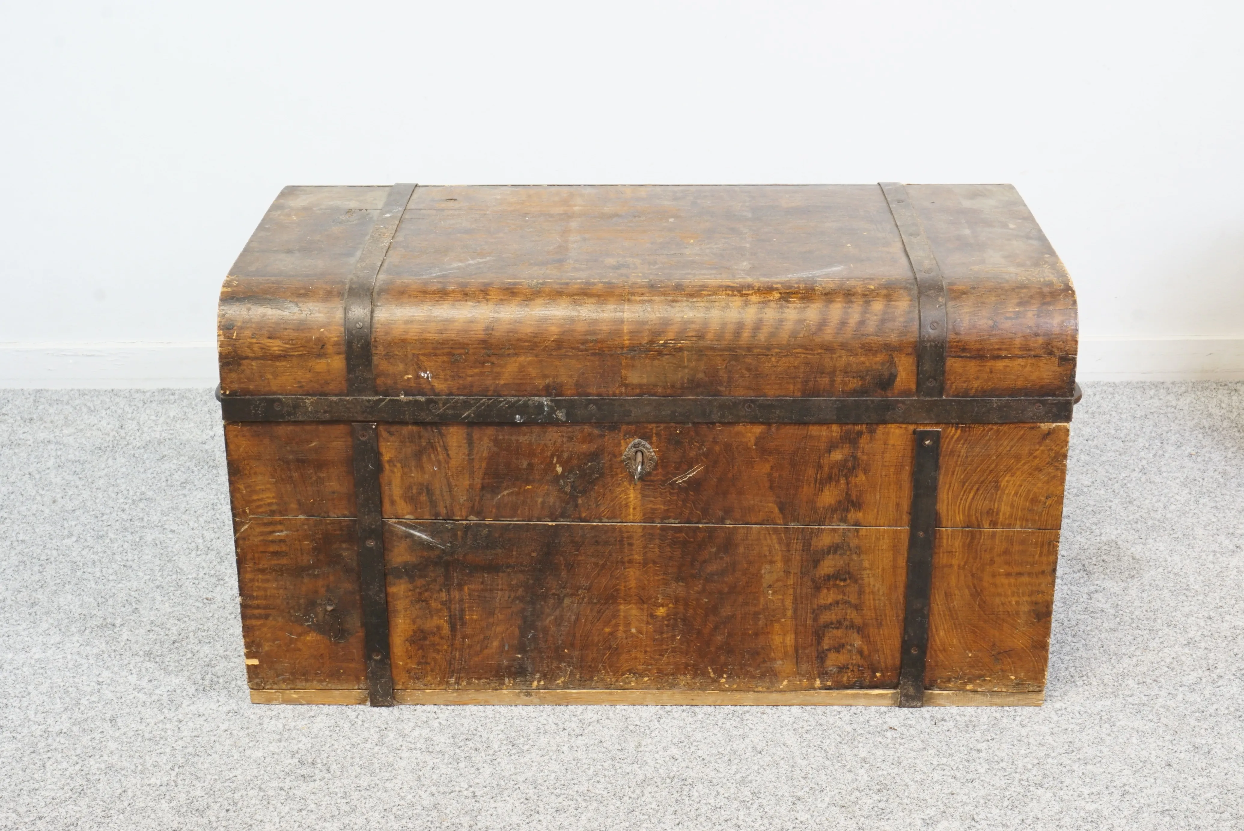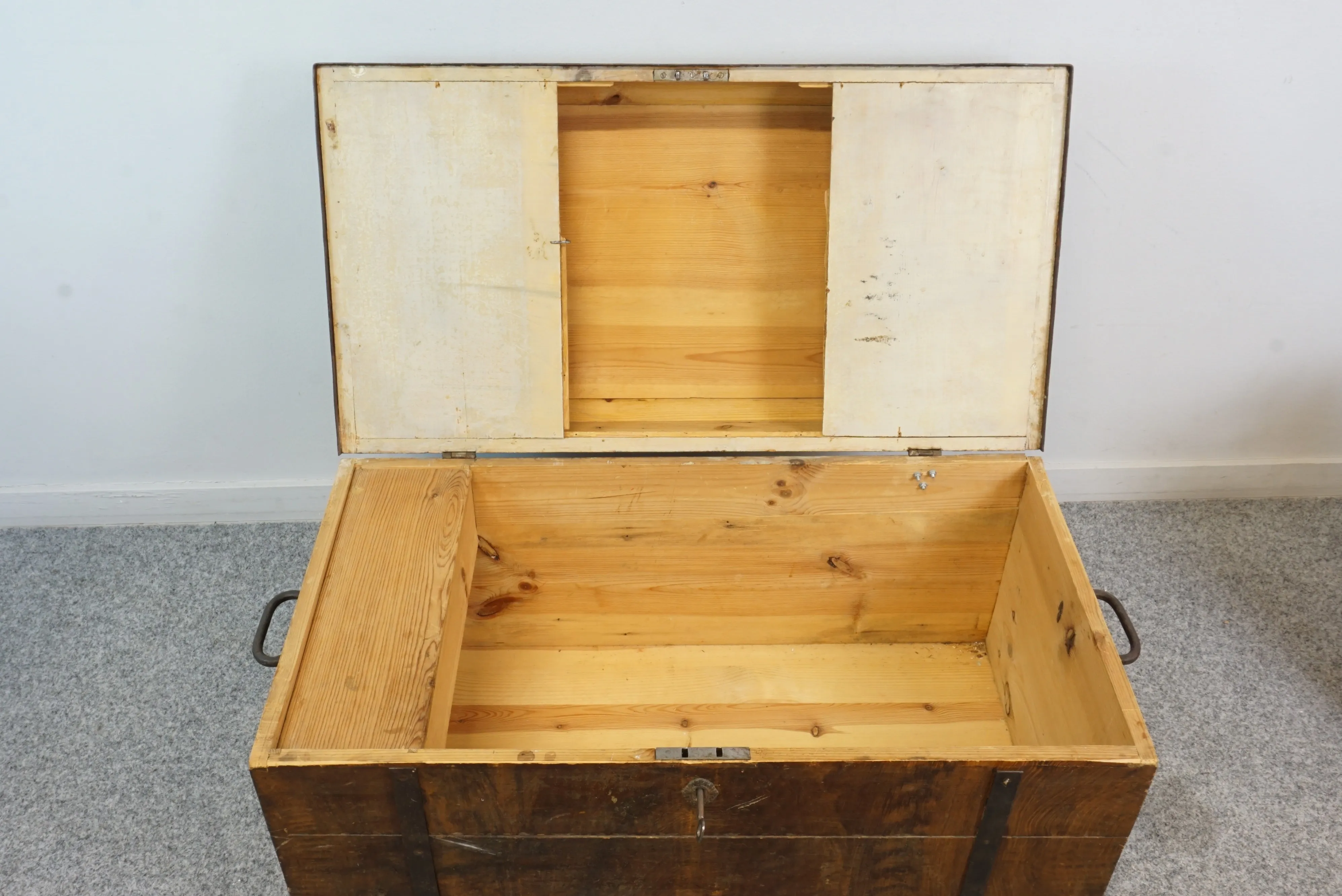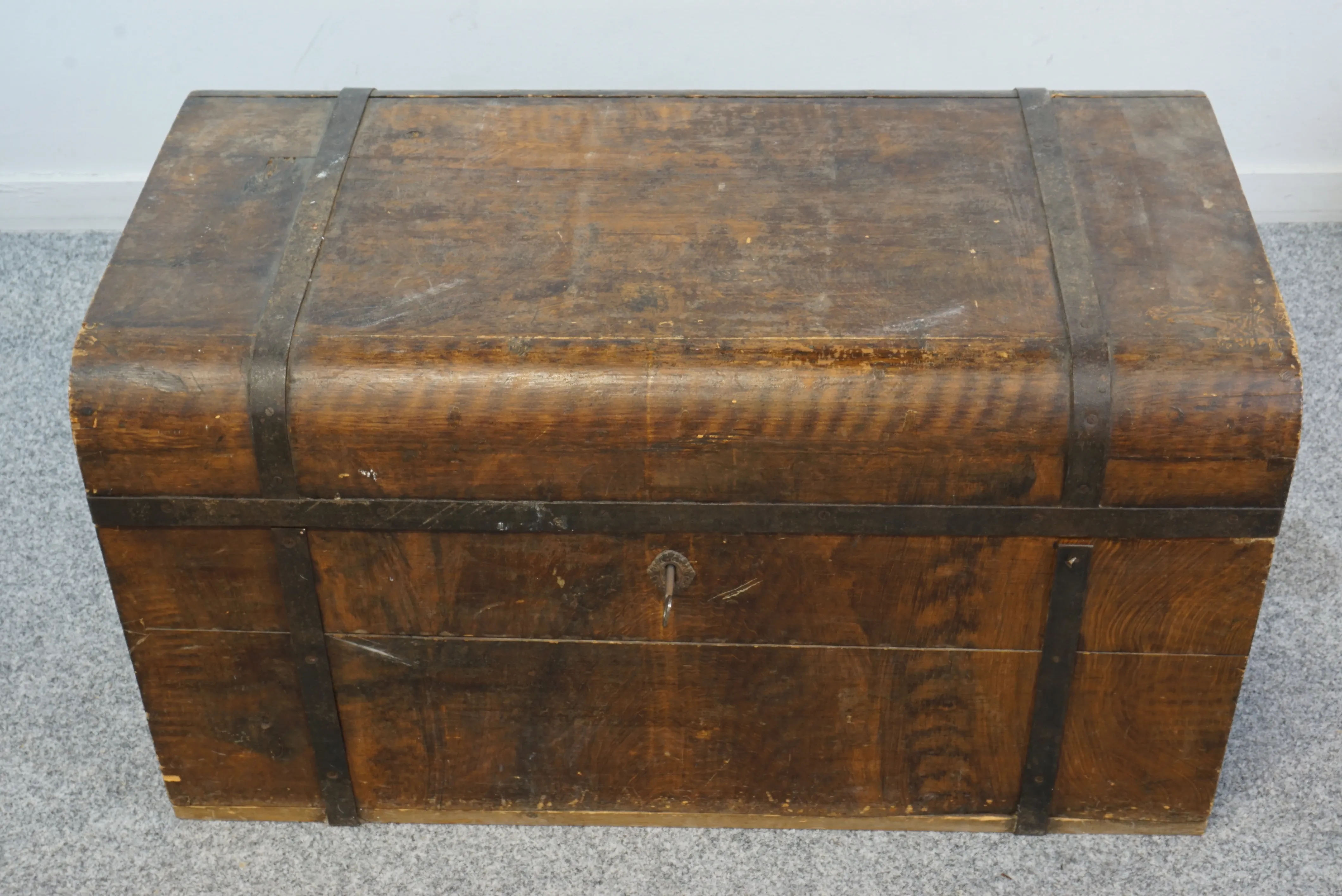 Träkista med järnbeslag och handtag. Nyckel finns. B: 45 cm L: 84 cm H: 46 cm