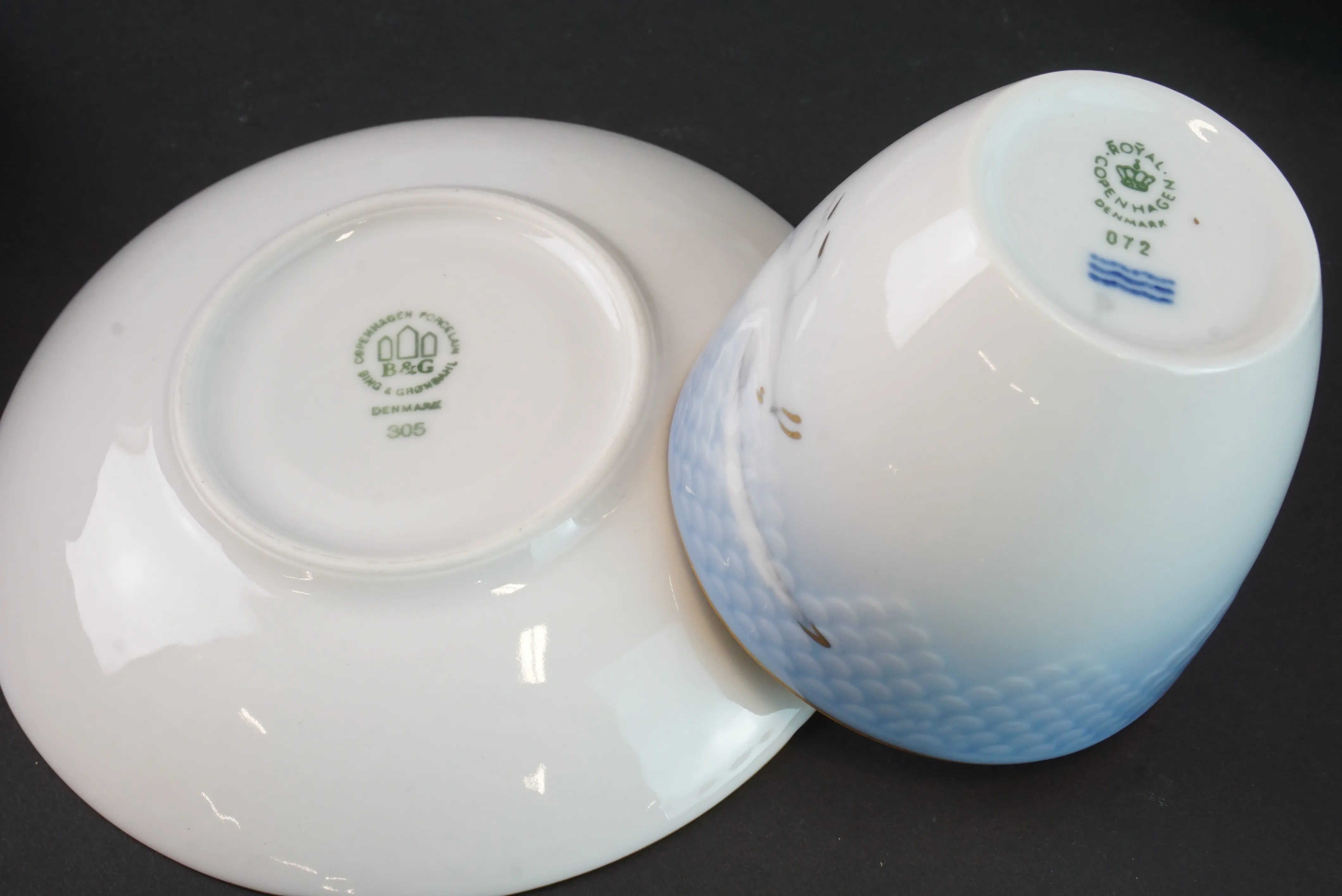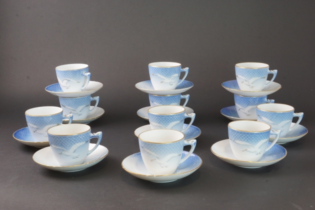 Kaffeservis om 12 koppar med fat. Tillverkare Bing & Gröndahl samt Royal Copenhagen. 7 st koppar märkta 305 5 koppar märkta 072