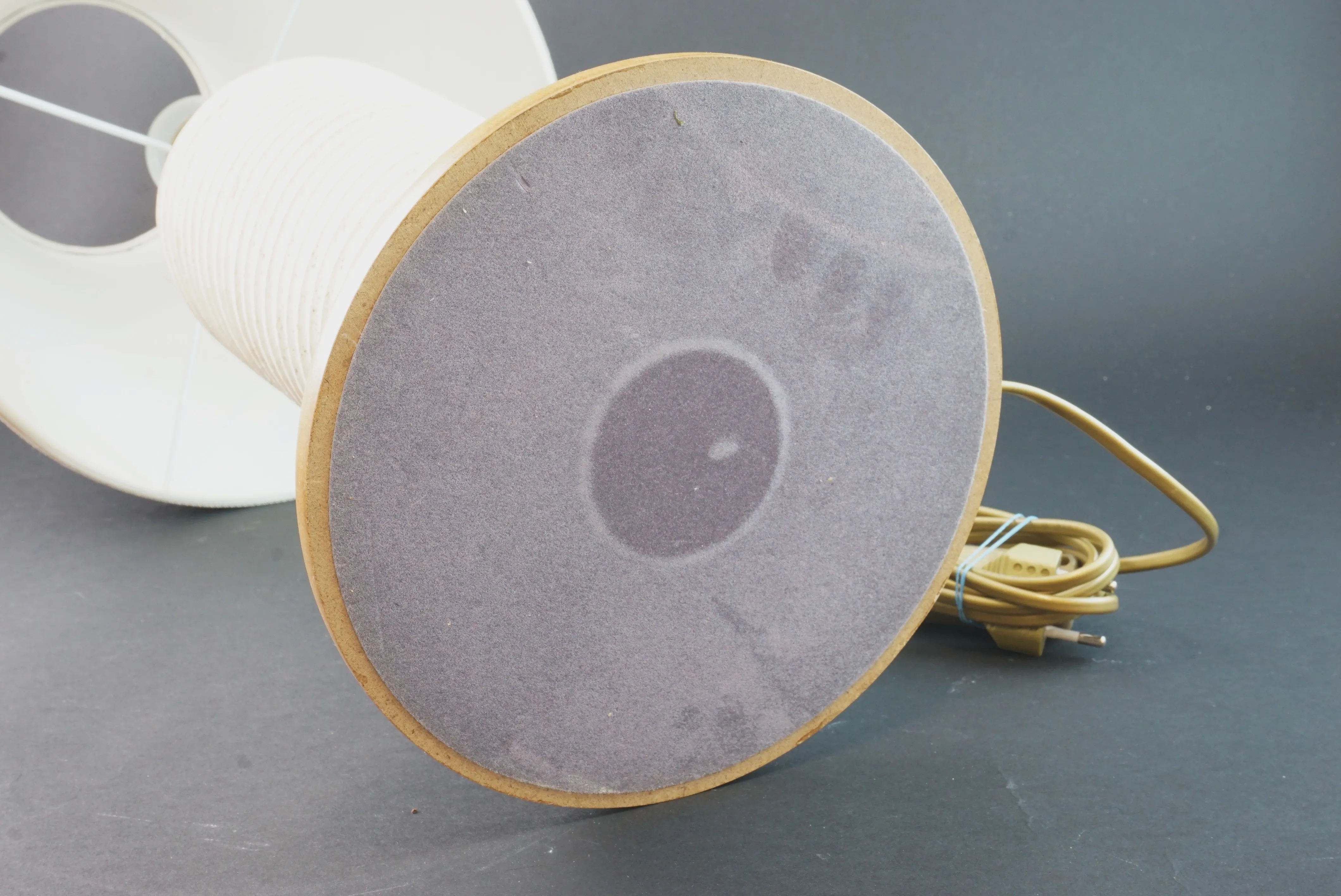 Bordslampa i keramik med träfot och tygskärm. höjd:73 cm skärm diameter:30 cm liten fläck på skärmen