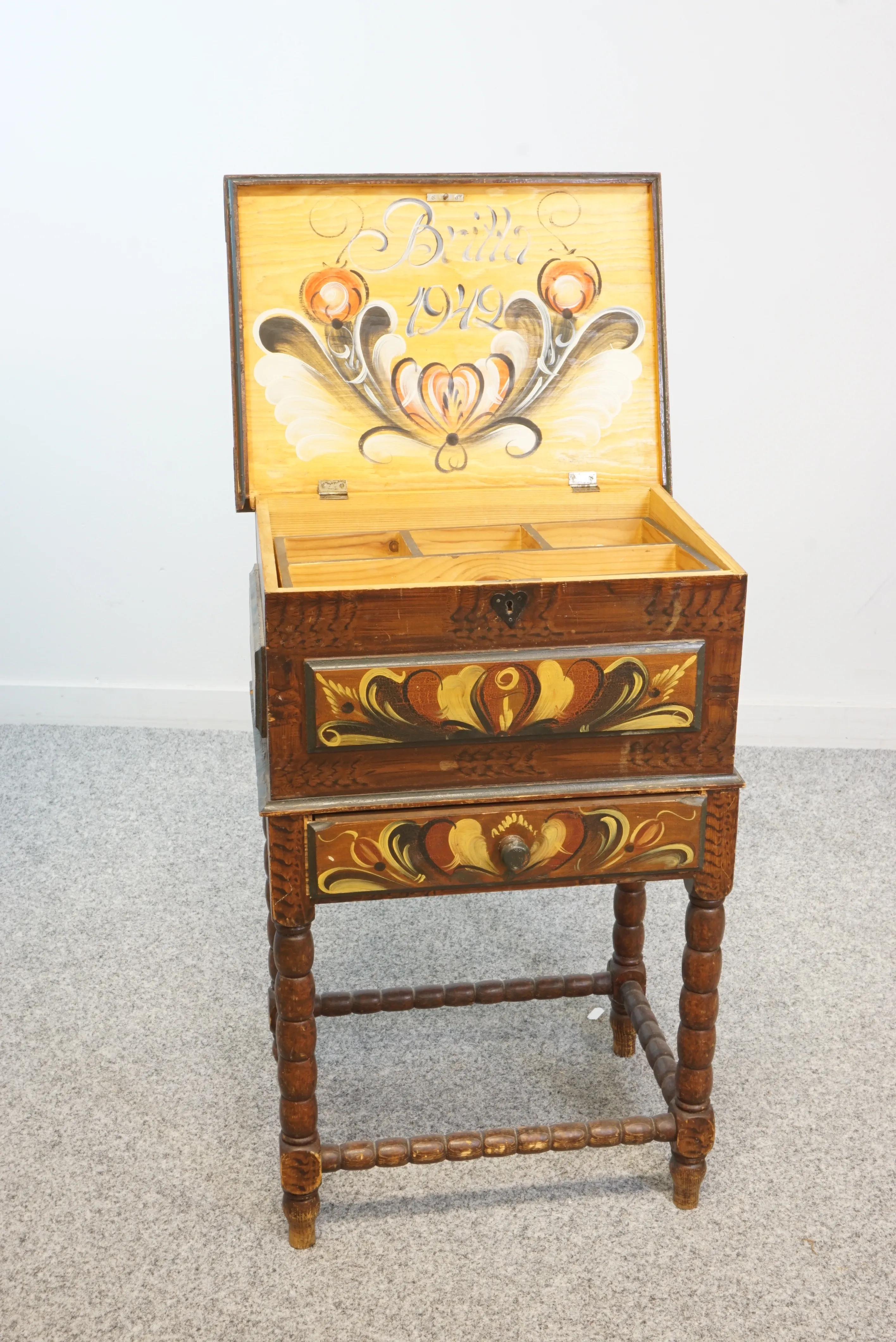 Syskrin med kurbitsmålning. Bruksslitage. Nyckel finns. H: 61cm B: 40cm D: 30 cm