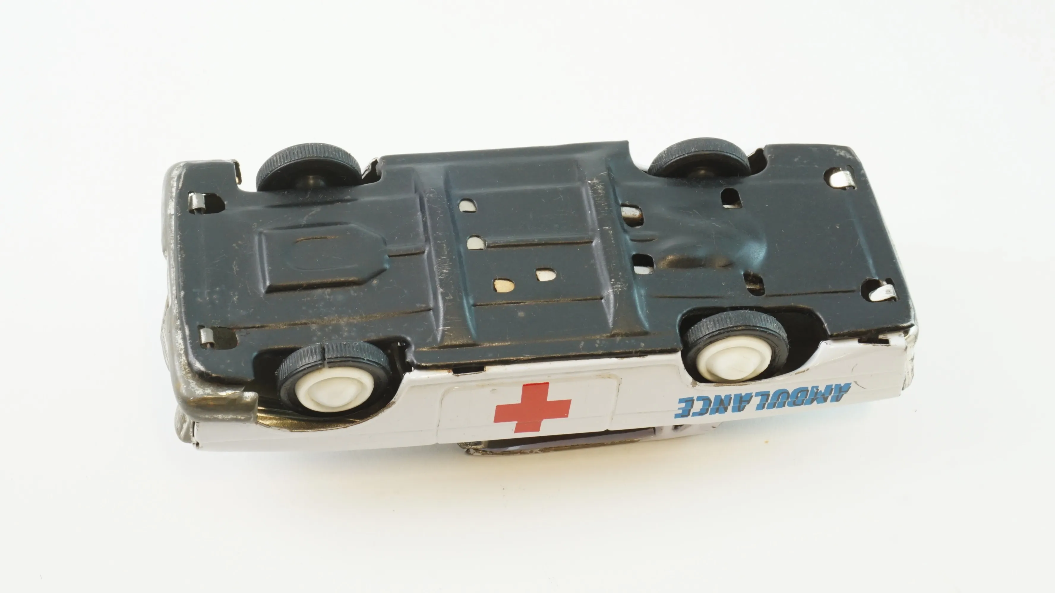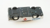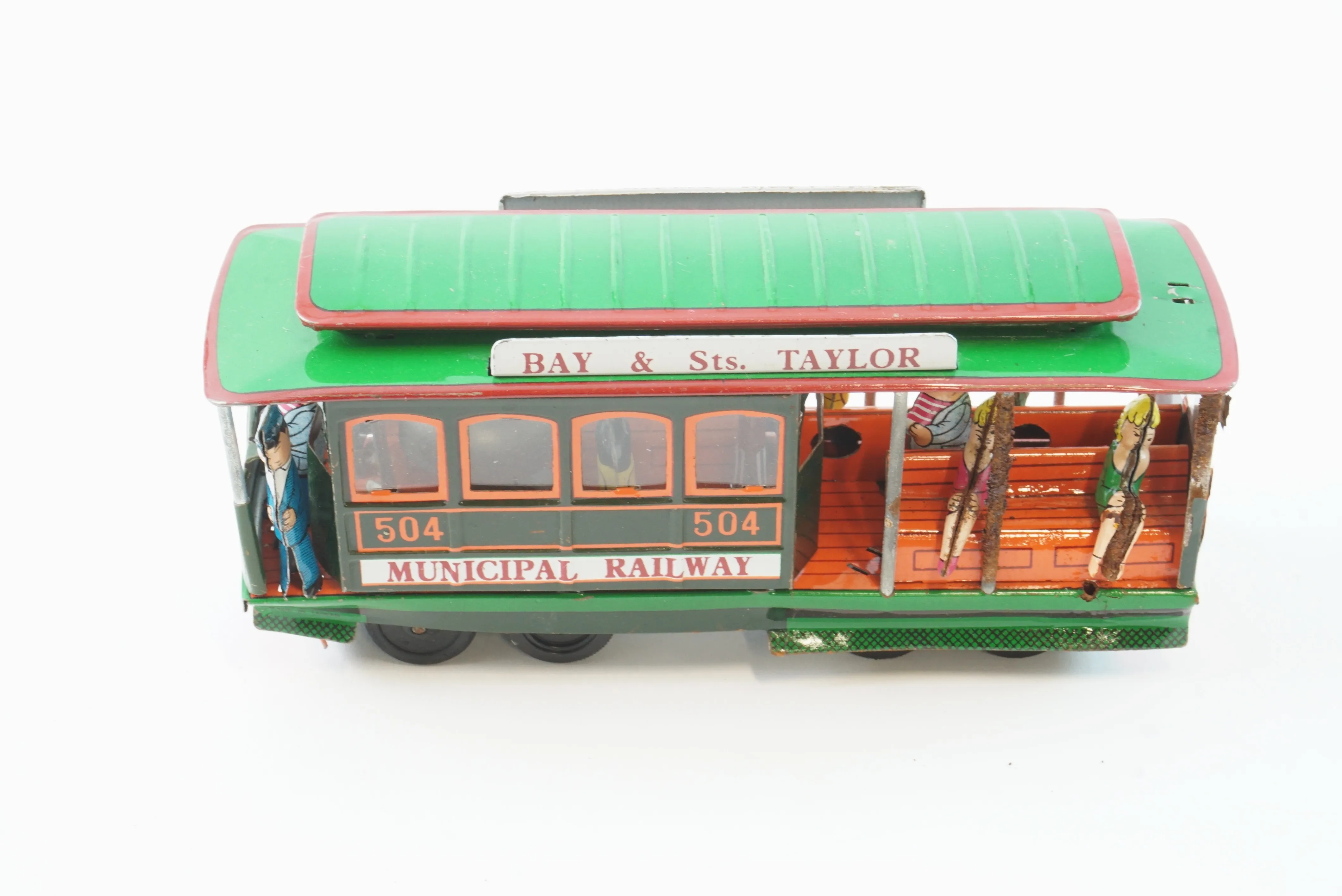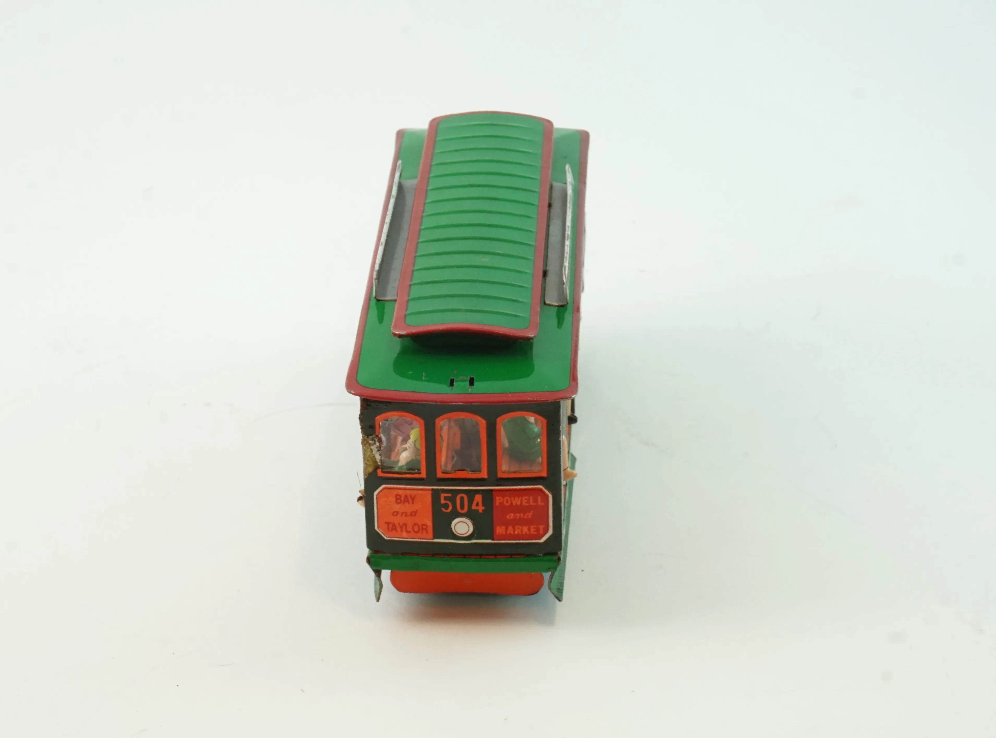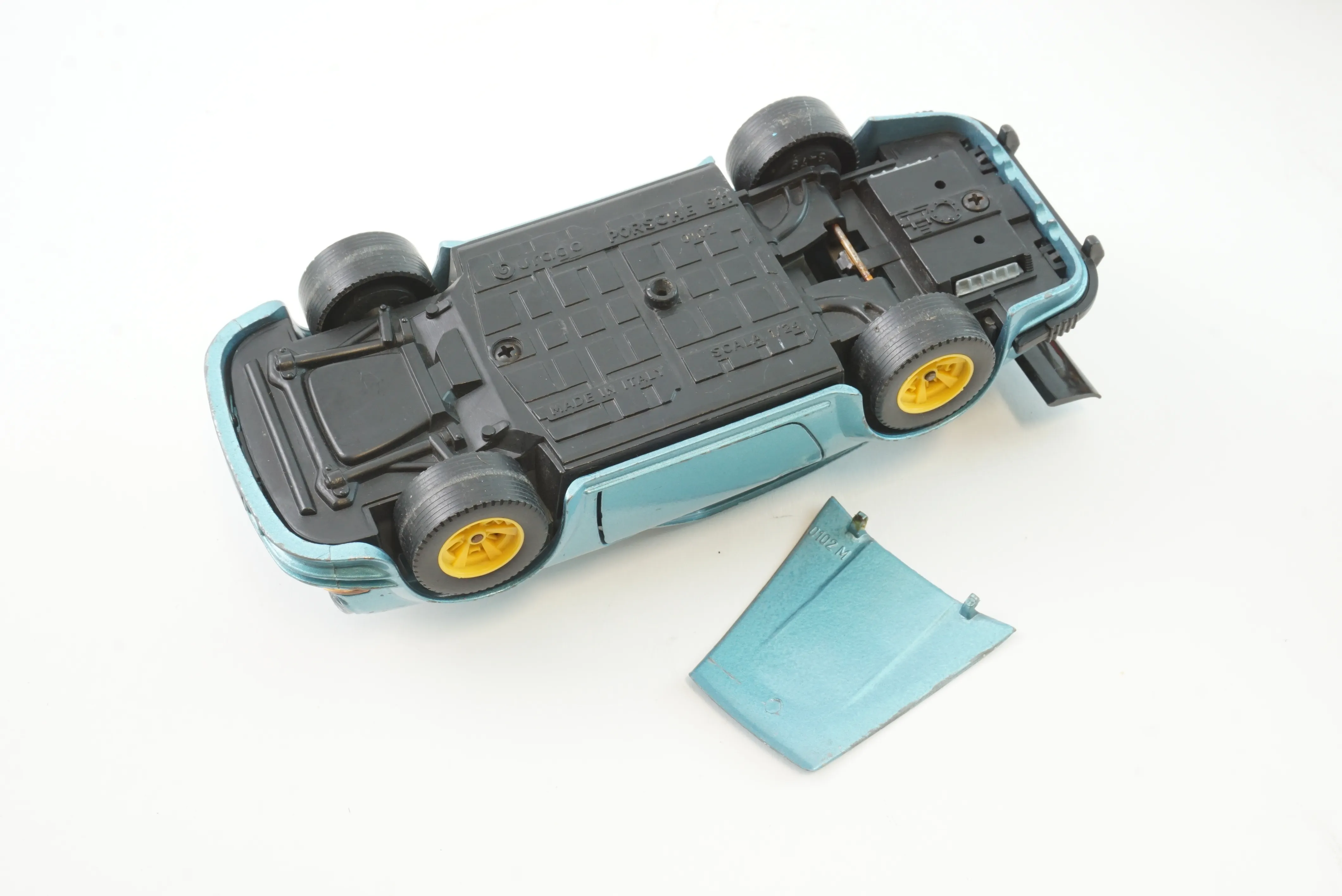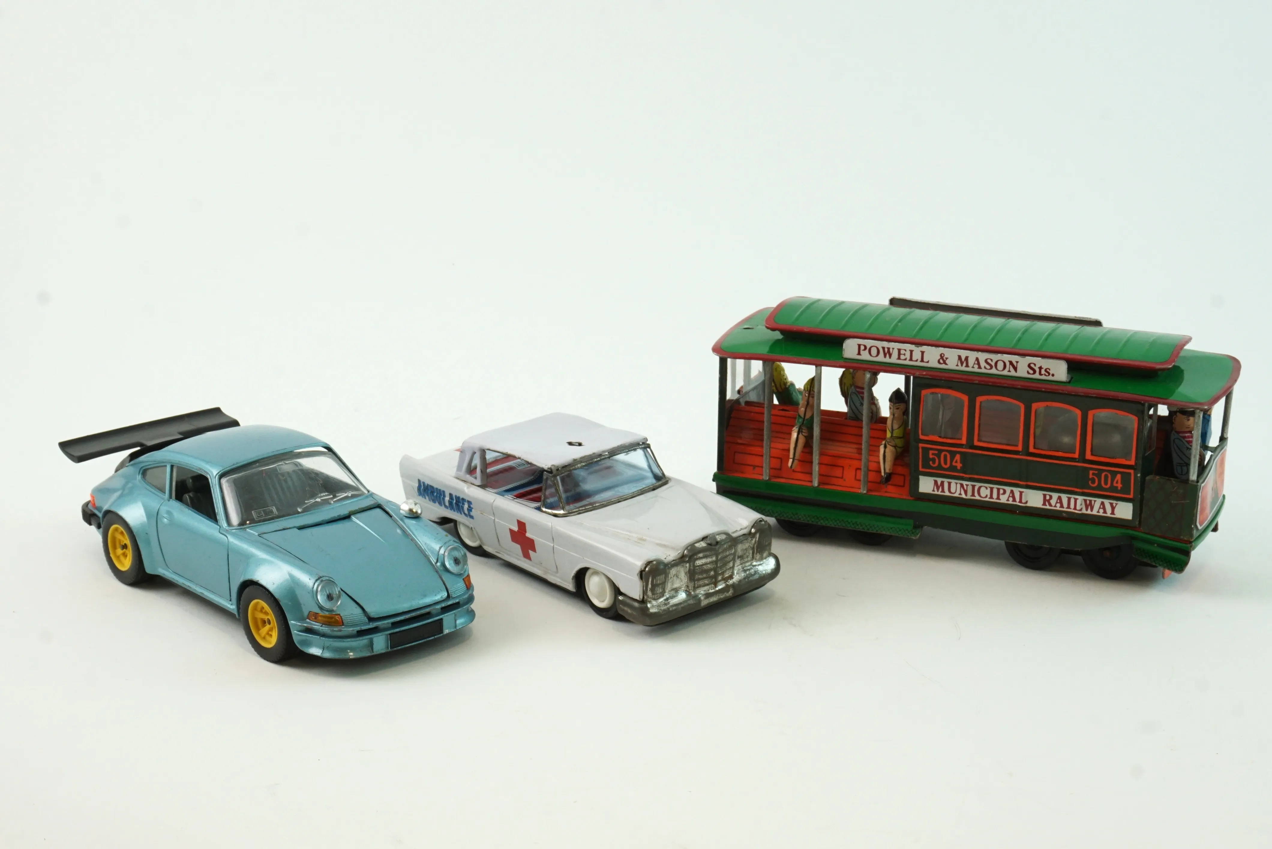 Färg bortfallen på spårvagn i plåt. Porsche är skadad, lös motorhuv och sprickor, allmänt slitage.