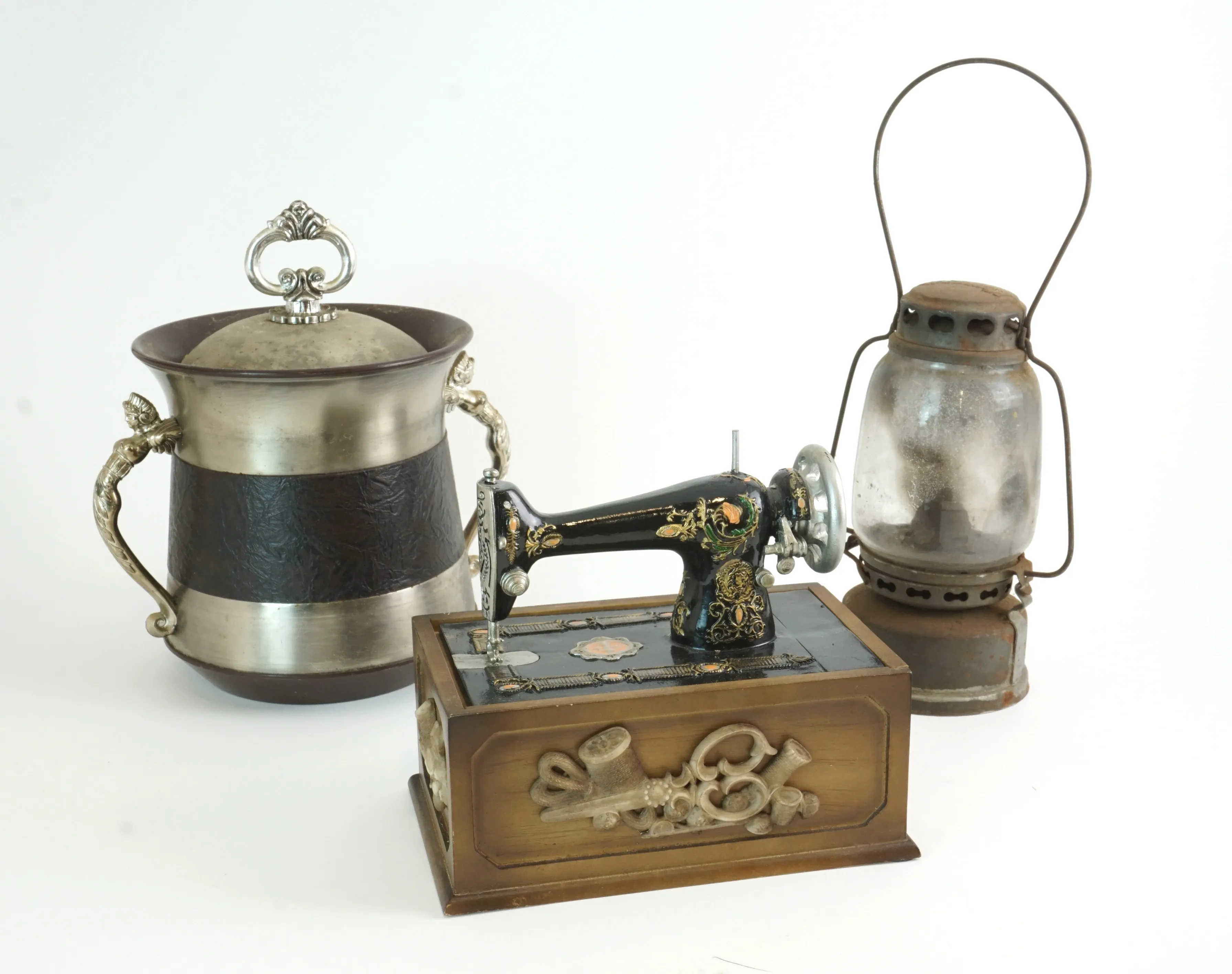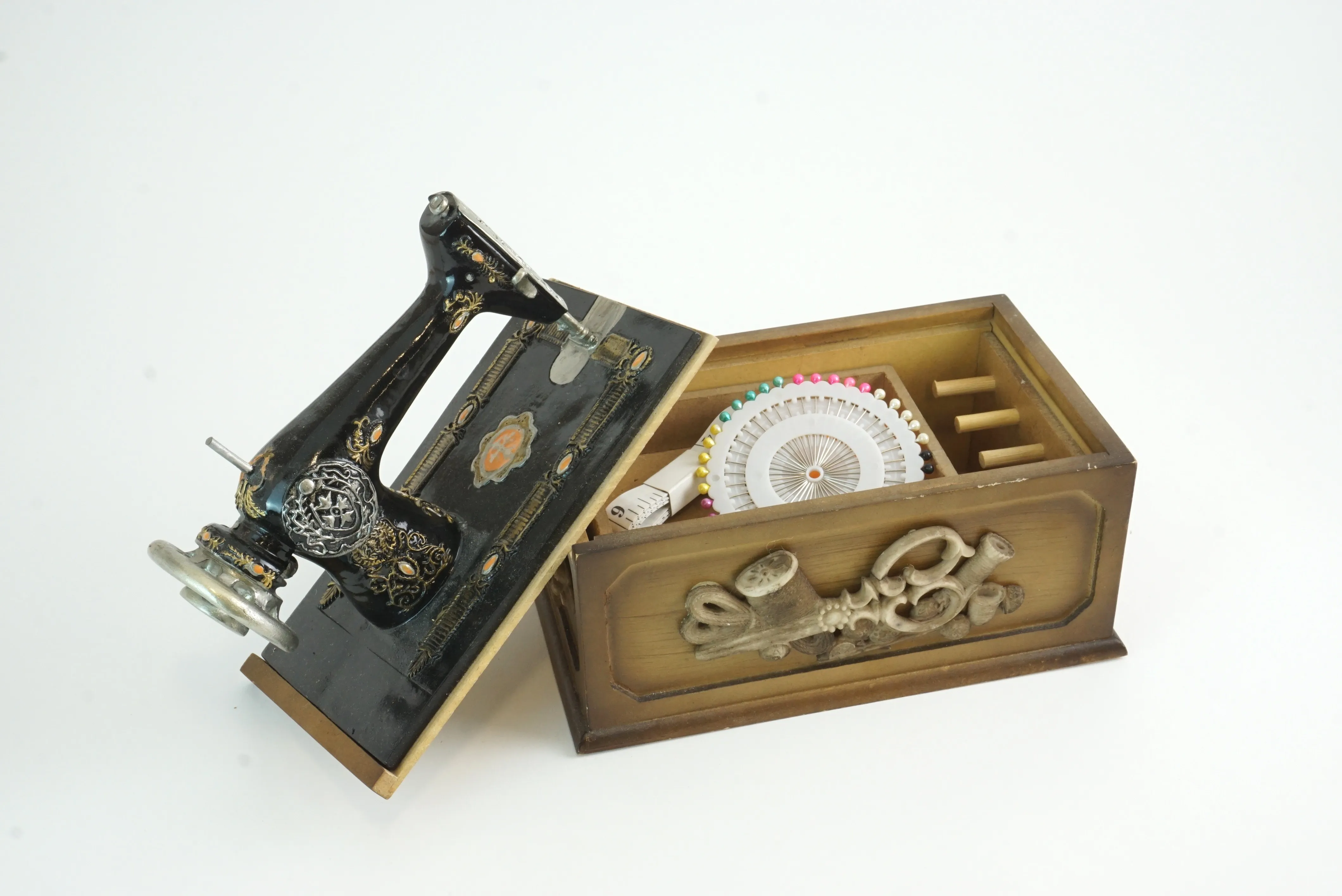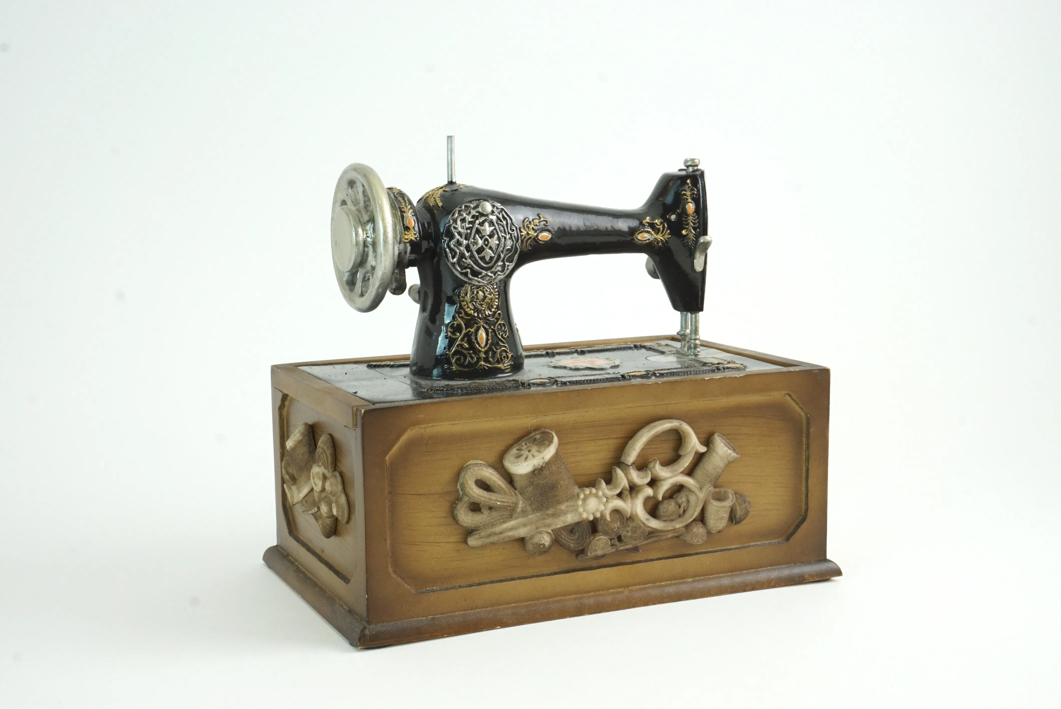 Litet syskrin i form av en gammal symaskin. Längd: 19 cm, höjd: 17 cm
