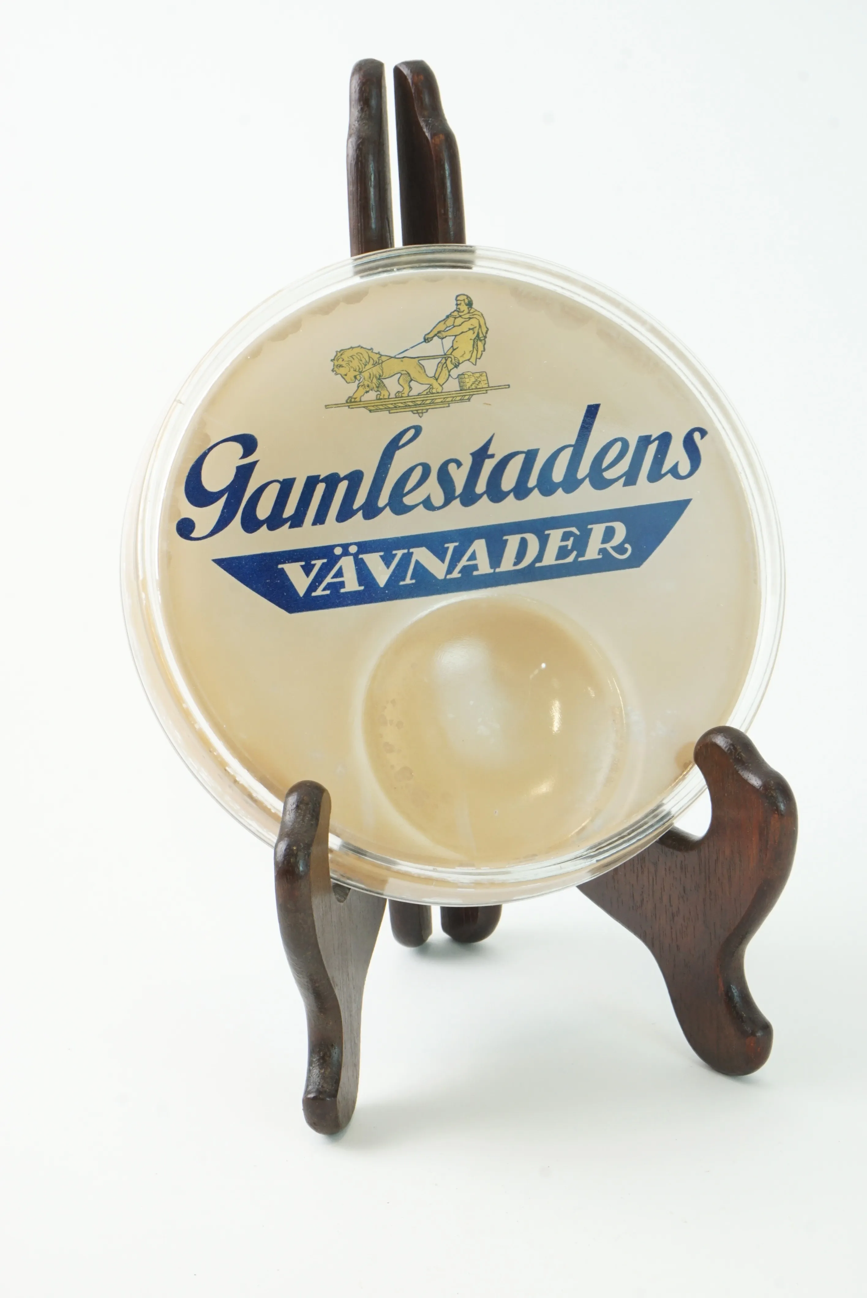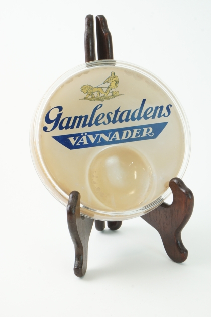 Bricka alternativt lock med reklam för Gamlestadens Vävnader. Färgsläpp förekommer.