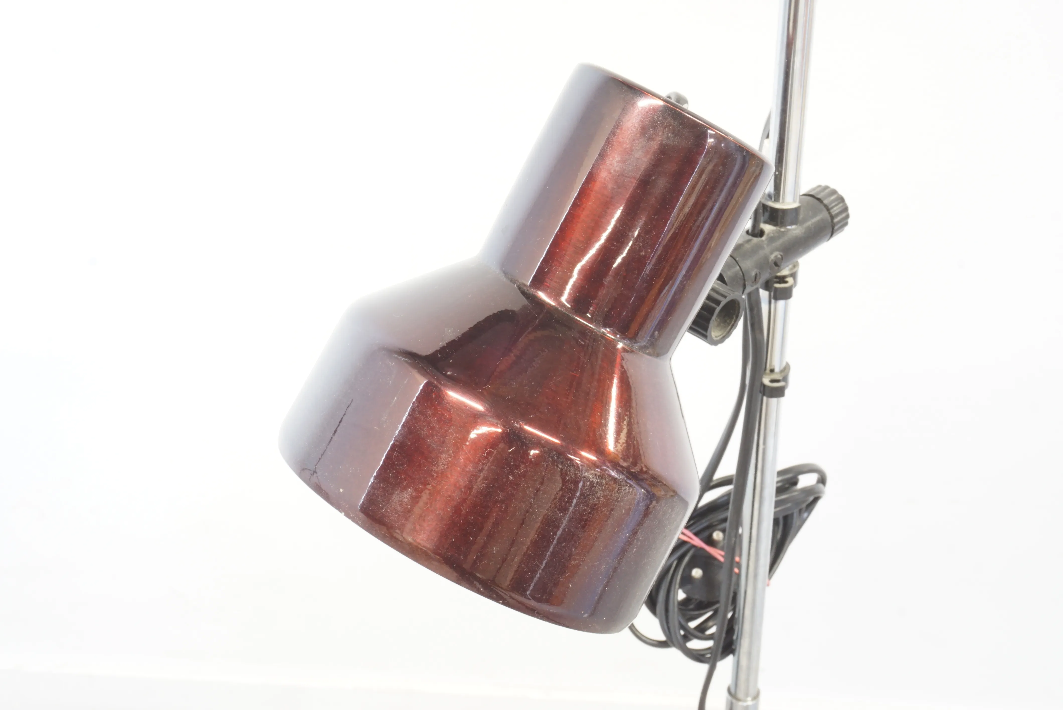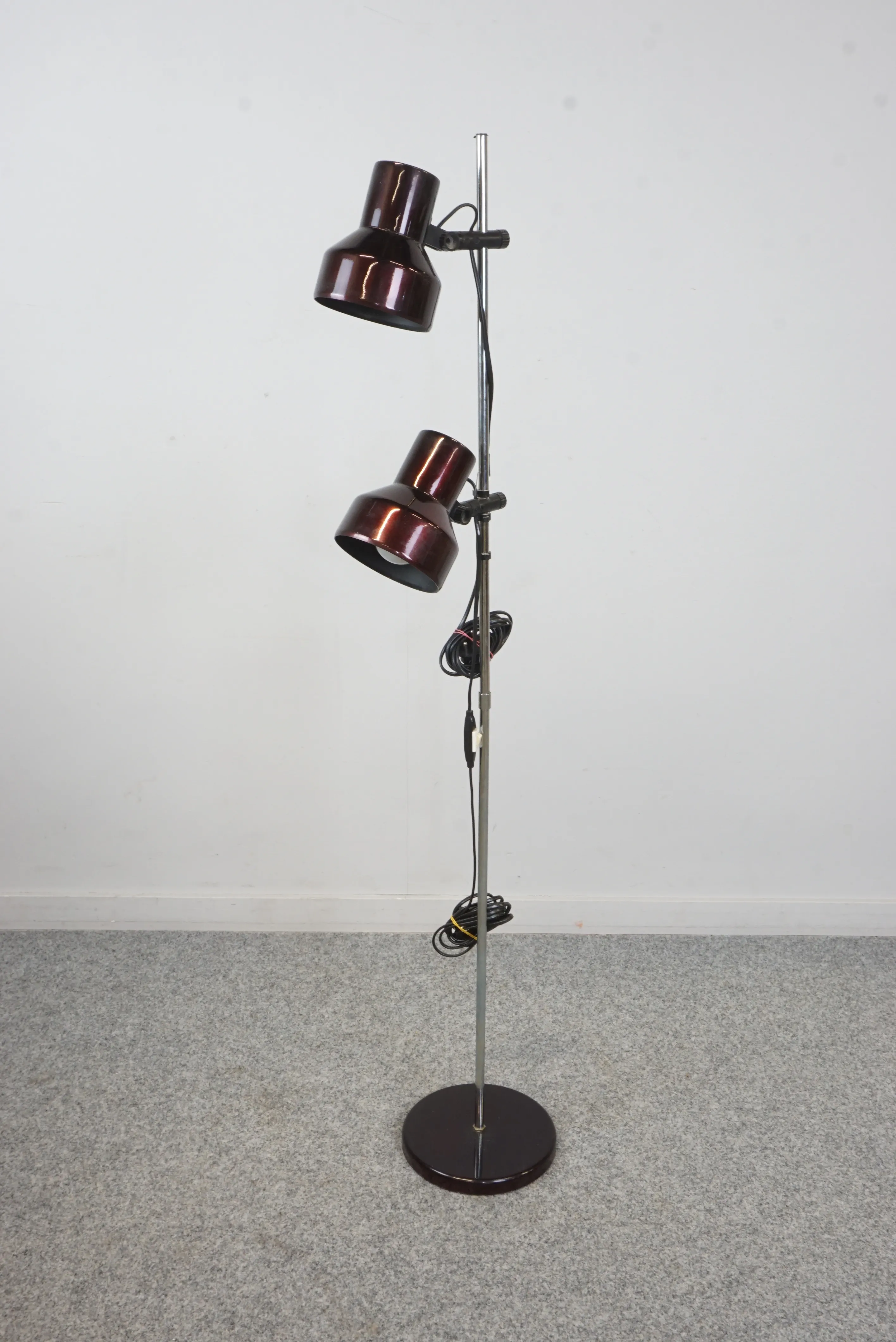 Golvlampa med två ljuskällor från AB Belid. Höj- och sänkbara skärmar i vinröd/lila metalliclack. Höjd 130 cm.