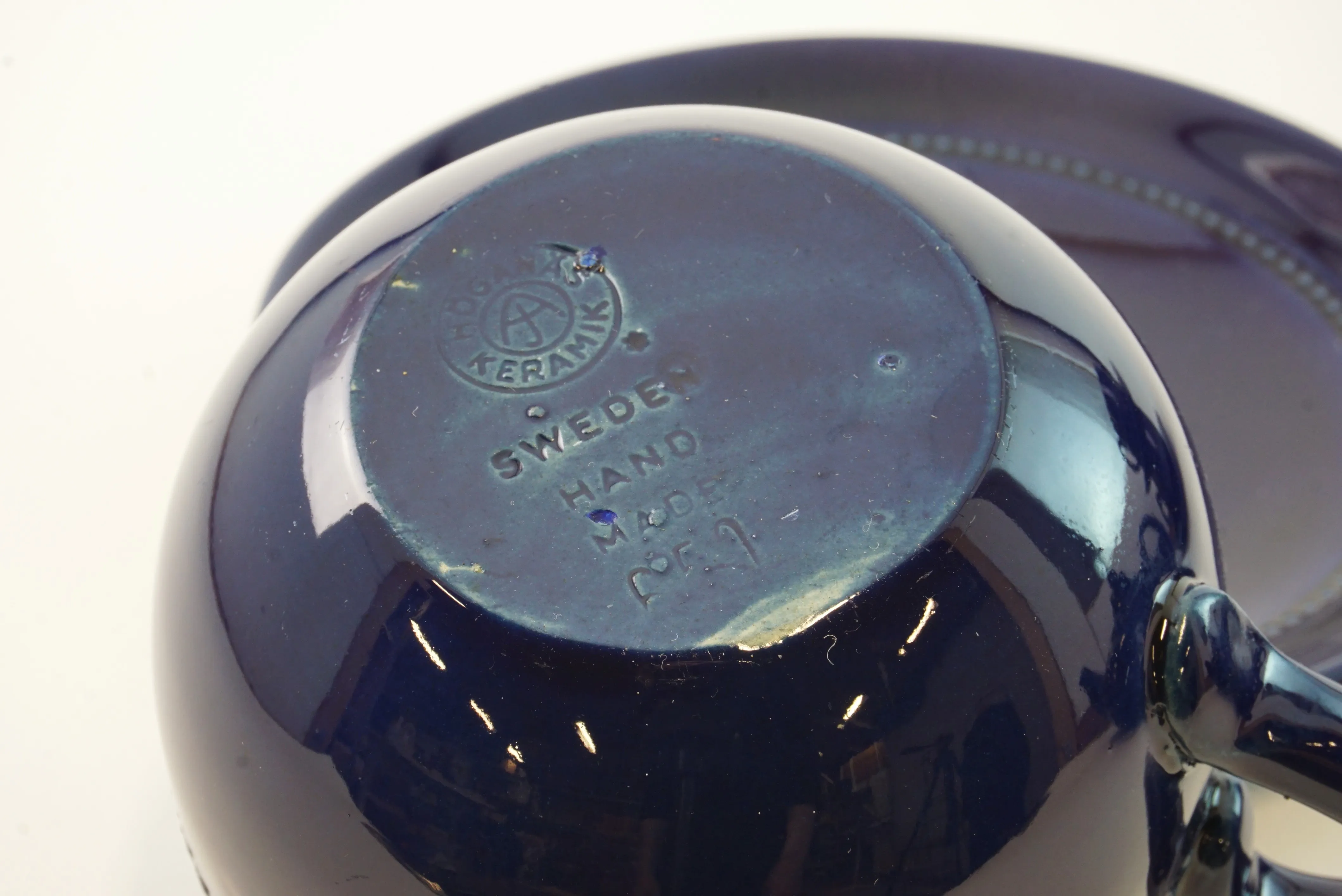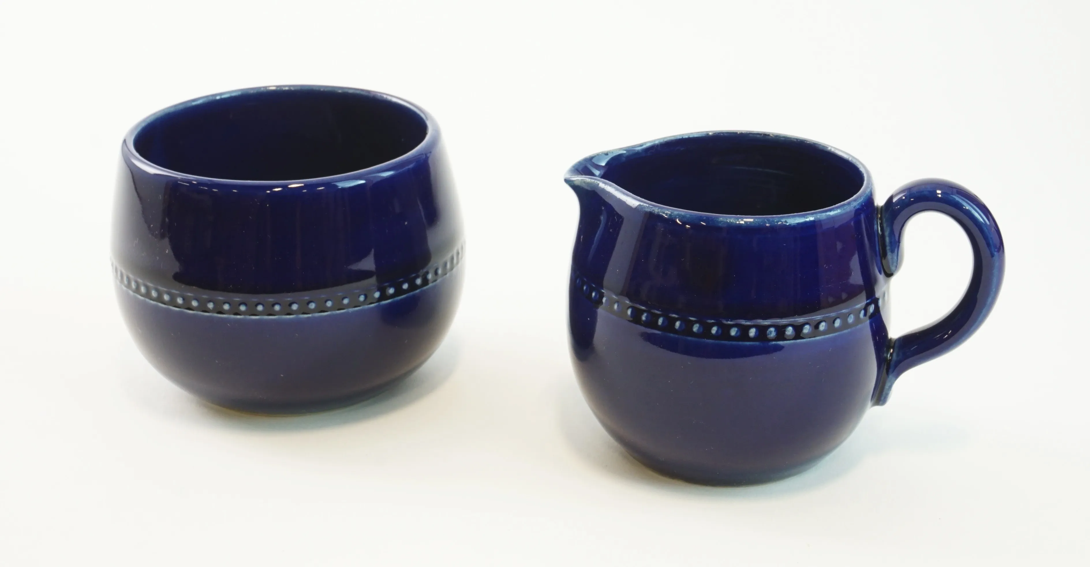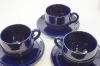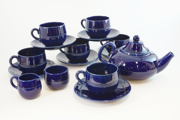 Tekanna, gräddkanna och sockerskål i fint skick. 6 st koppar med fat, bruksskick, 3 av kopparna har nagg upptill.