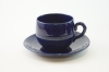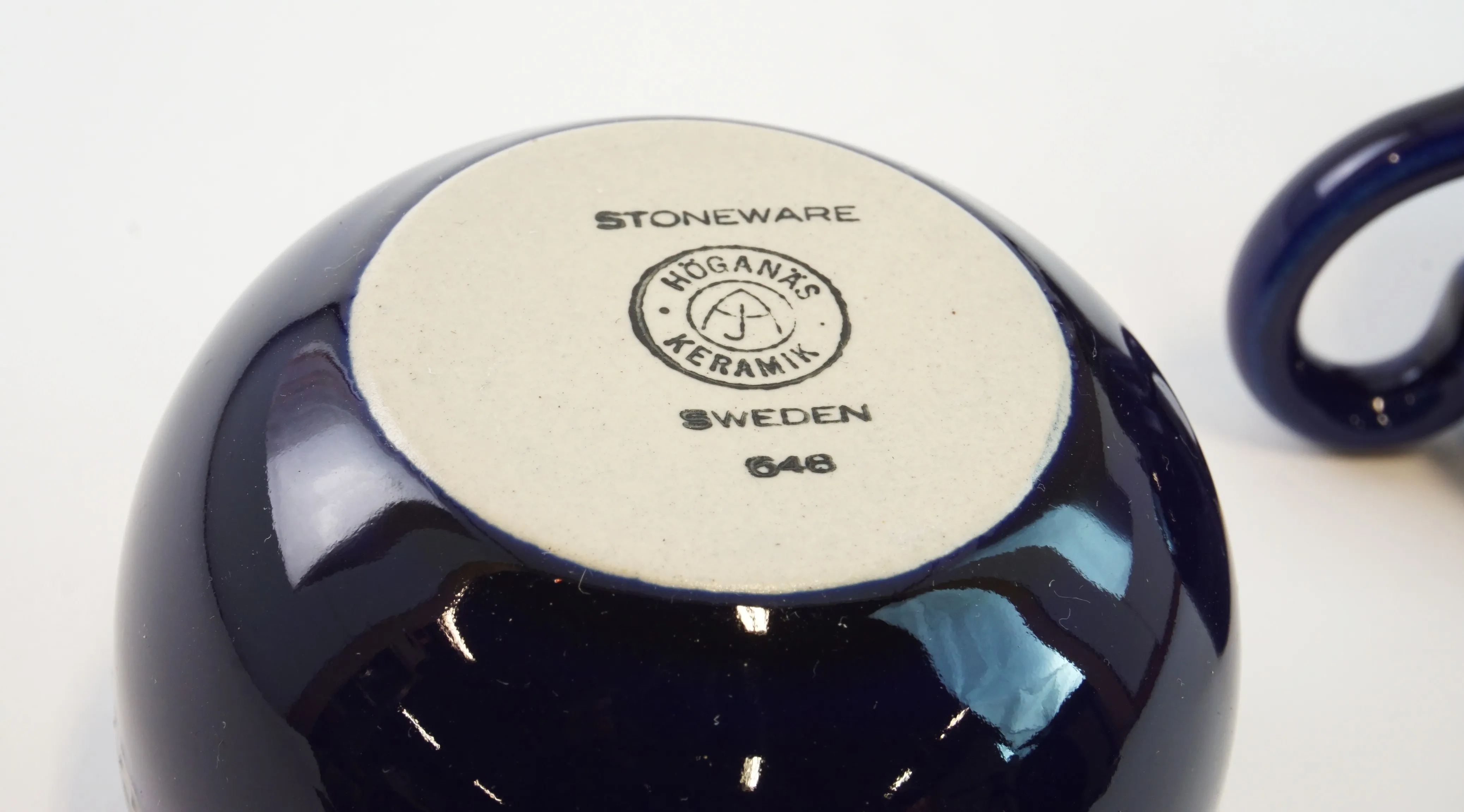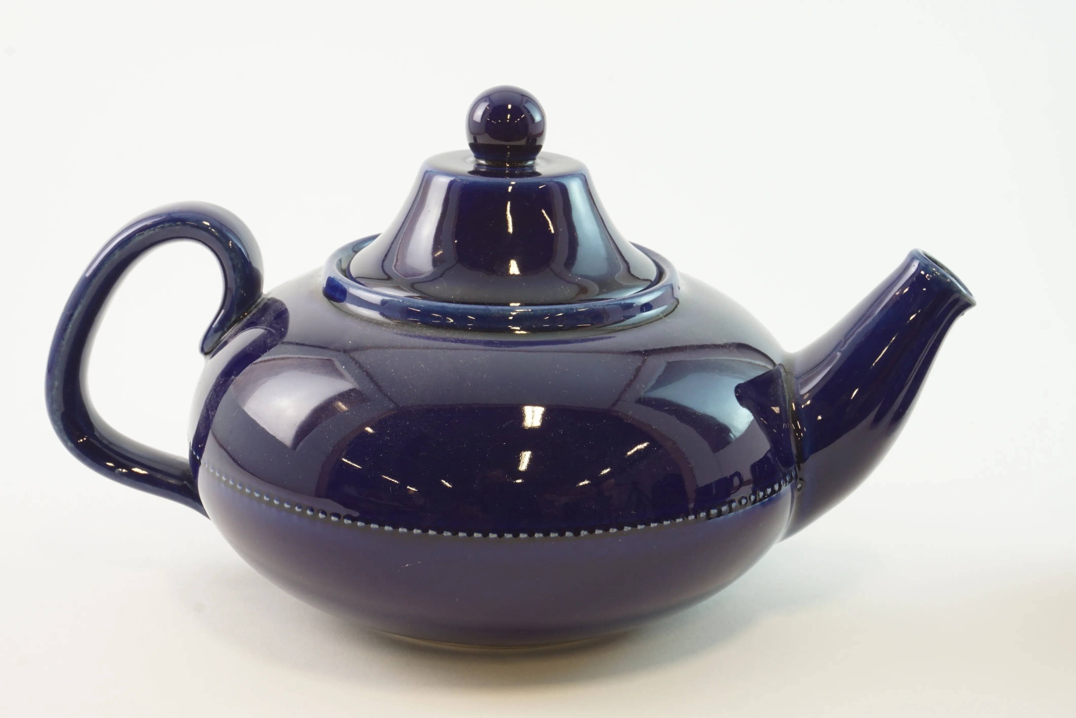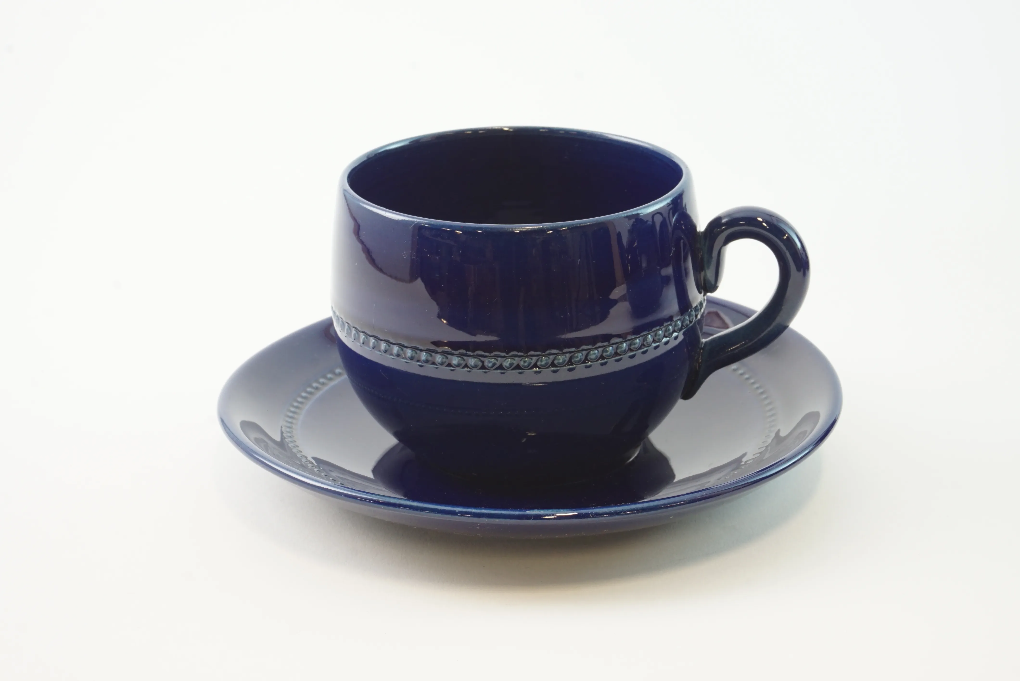 Tekanna, gräddkanna och sockerskål i fint skick. 6 st koppar med fat, bruksskick, 3 av kopparna har nagg upptill.