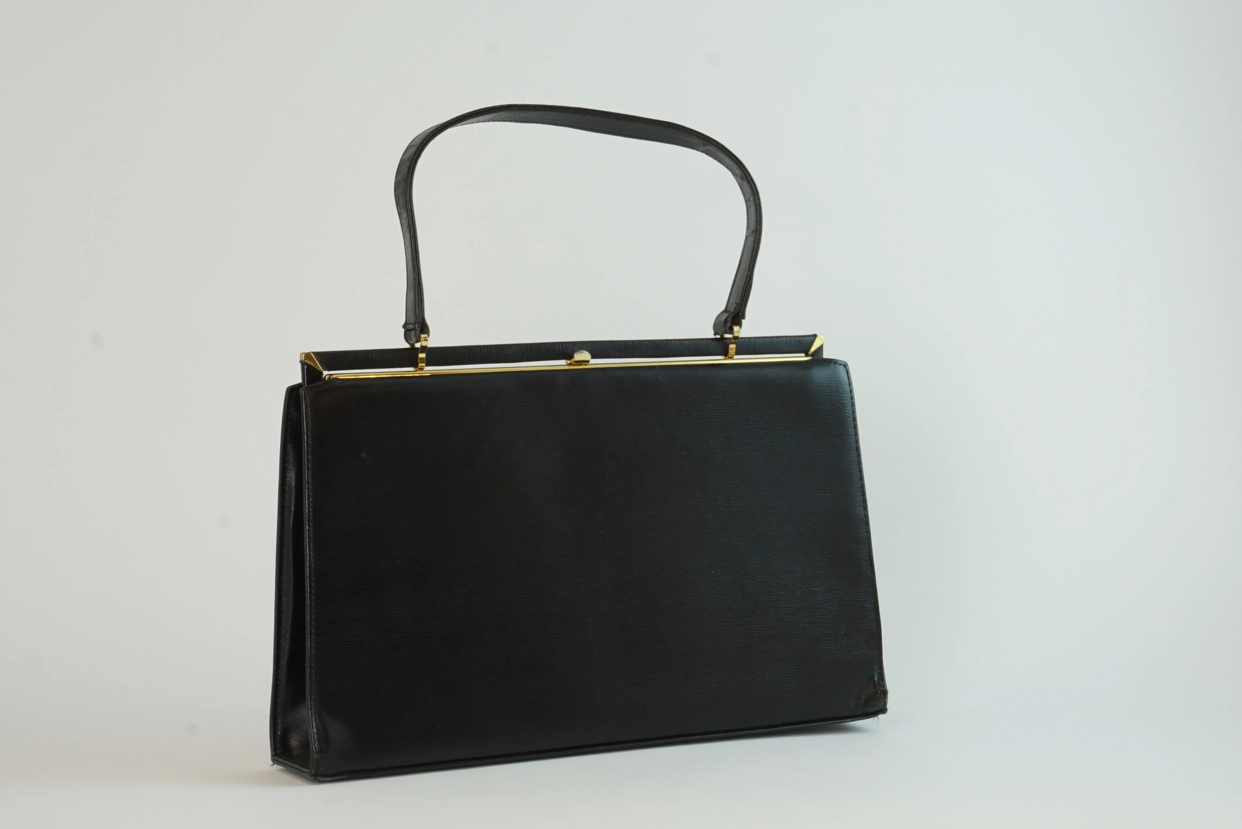 Vintage handväska i svart skinn från Gahms i fint skick. Höjd: 20 cm Bredd: 32 cm Djup: 7 cm