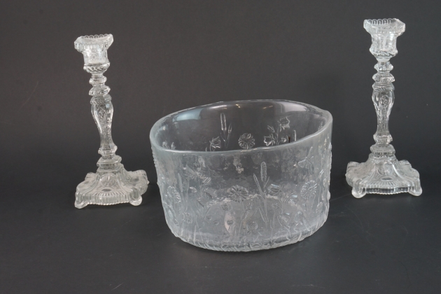 Skål, höjd: 12 cm, diameter: 20 cm Ljusstakar, höjd: 21 cm