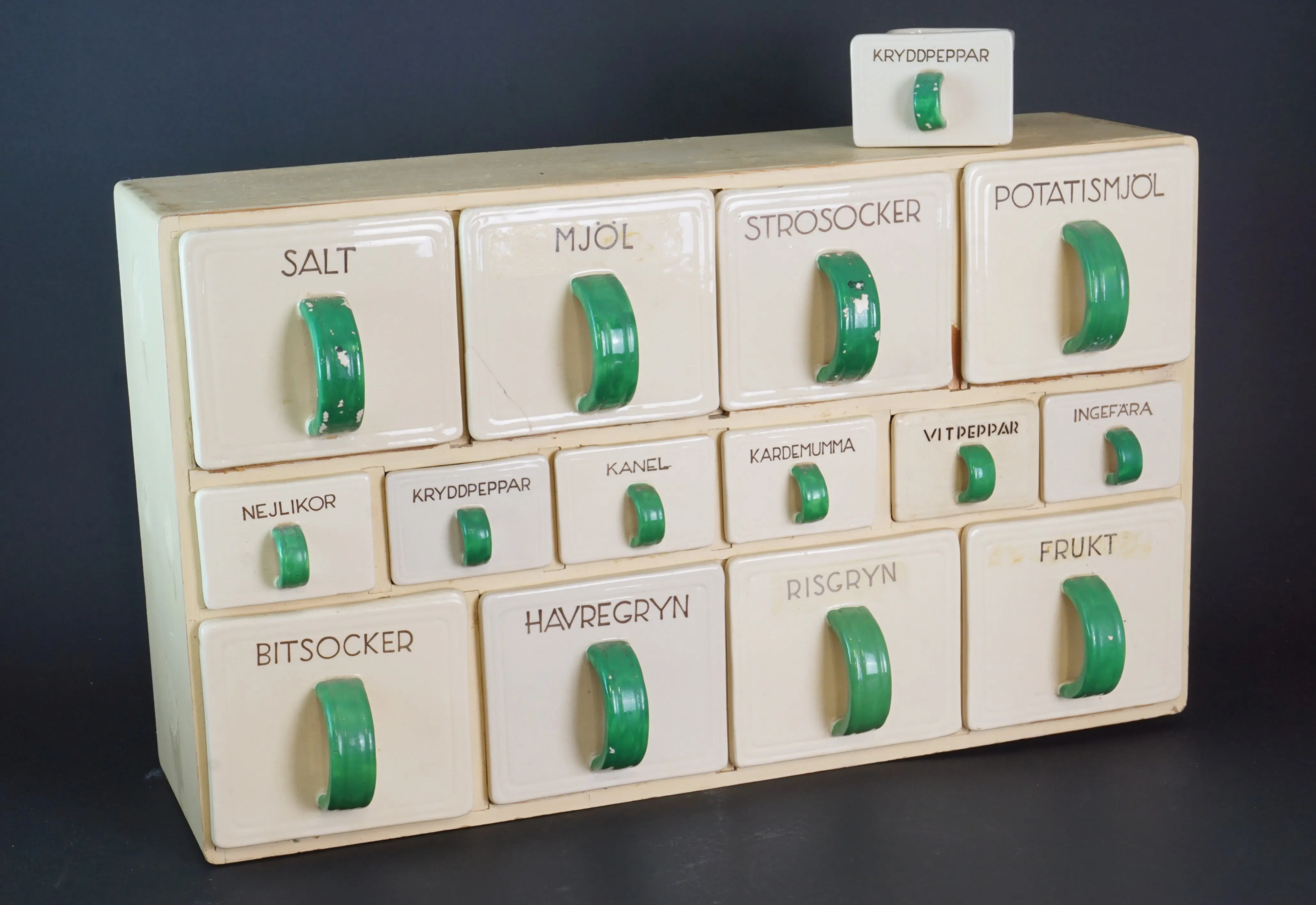 Mått: Längd 54cm bredd 14cm höjd 32cm 15 lådor en extra kryddpeppar. Färgskav. Nagg och lagningar förekommmer.