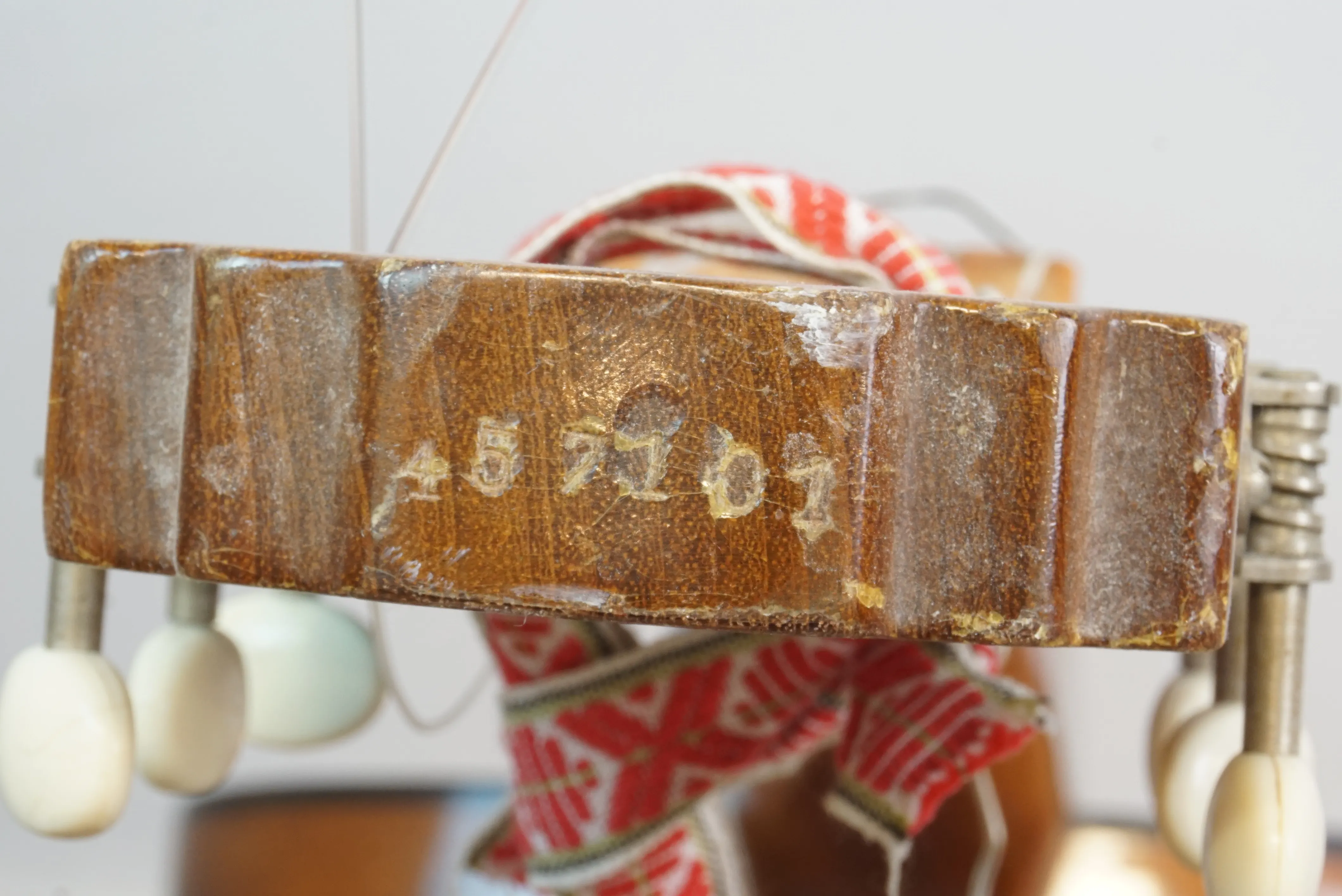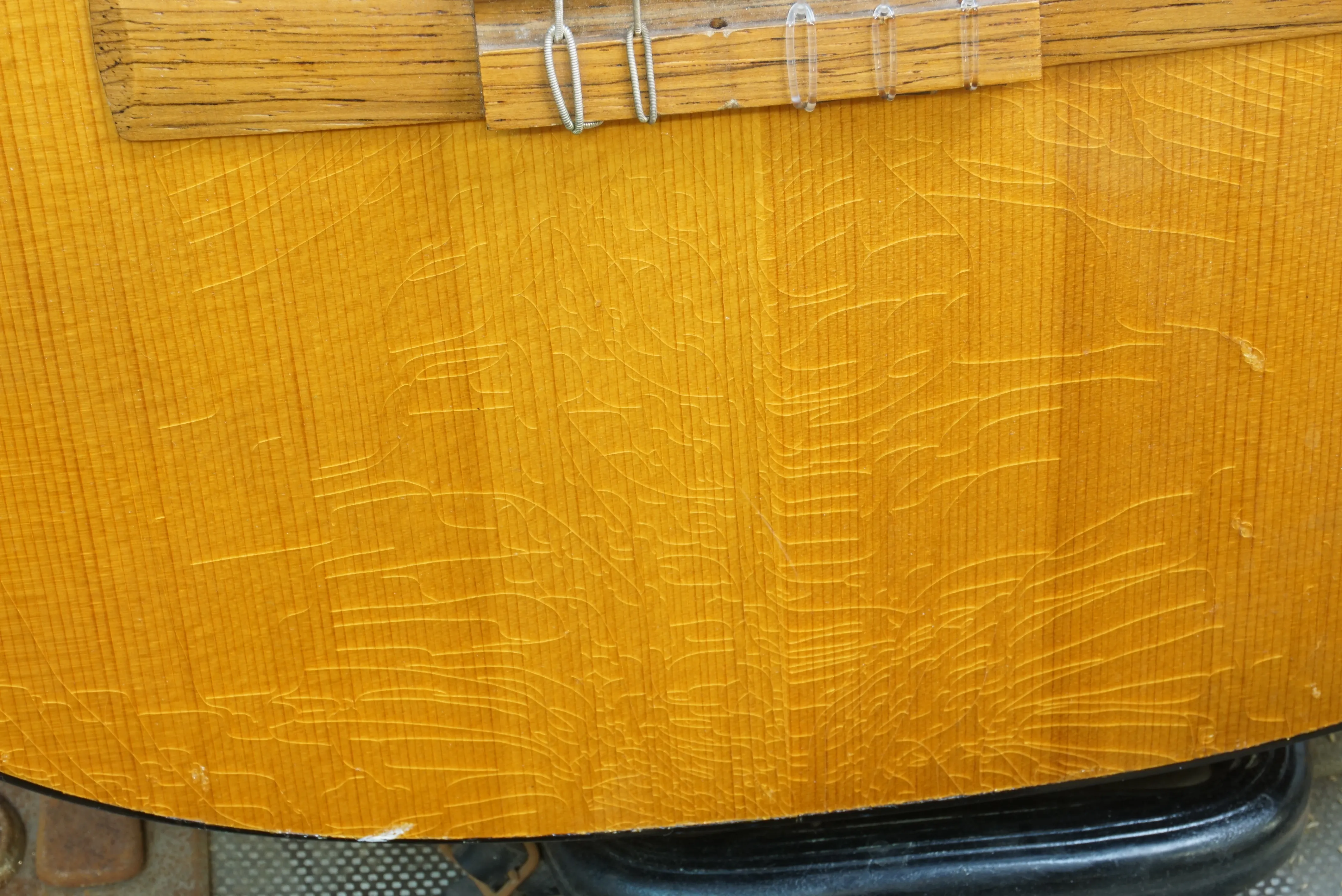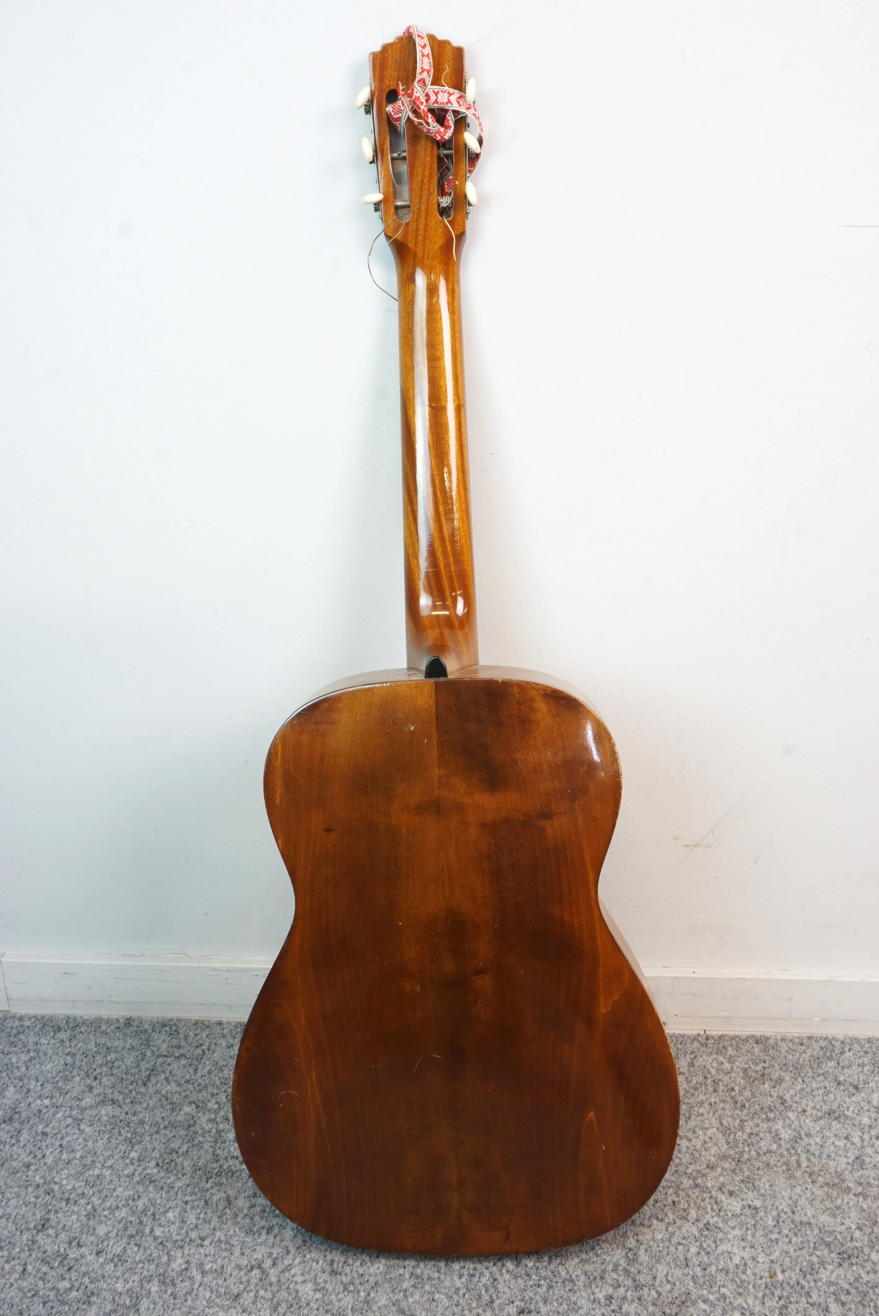 Bruksslitage, hack, krackelerad lack, en sträng saknas. Ett spänne är trasigt på gitarrfodralet.