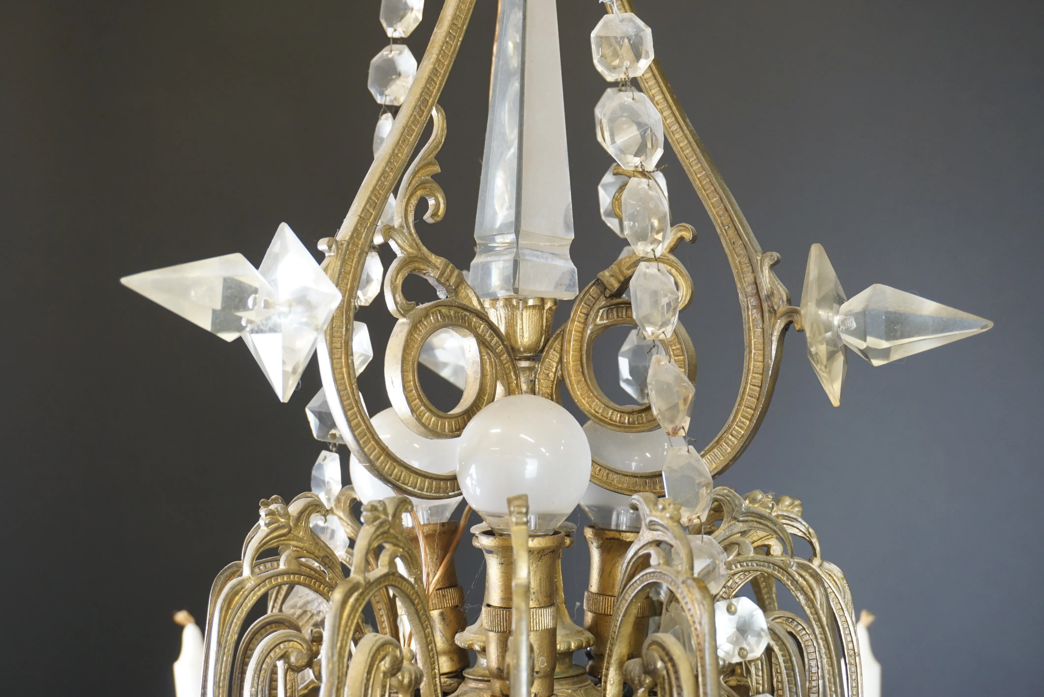 16790. Ljuskrona Oscariansk, gjutjärn och prismor