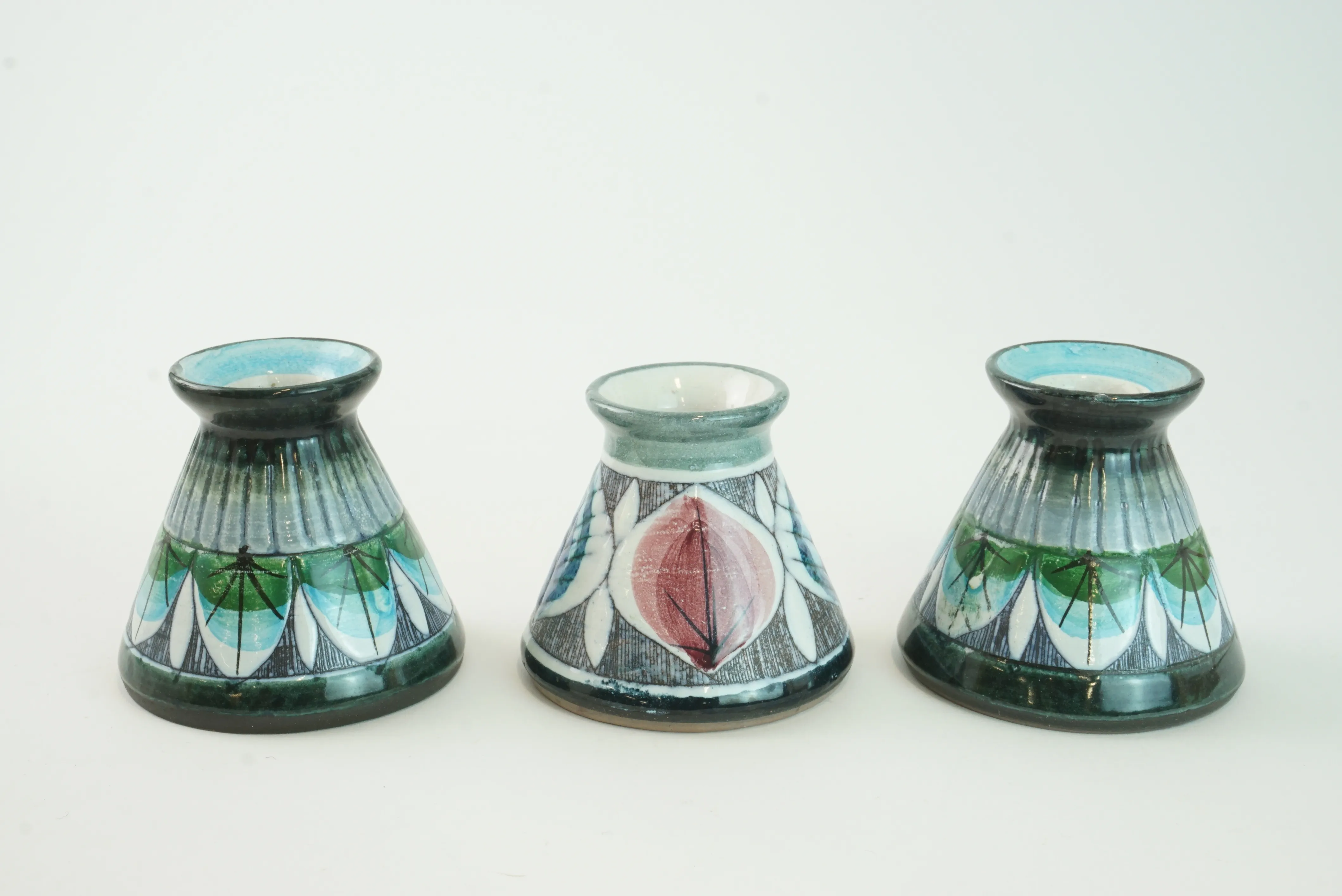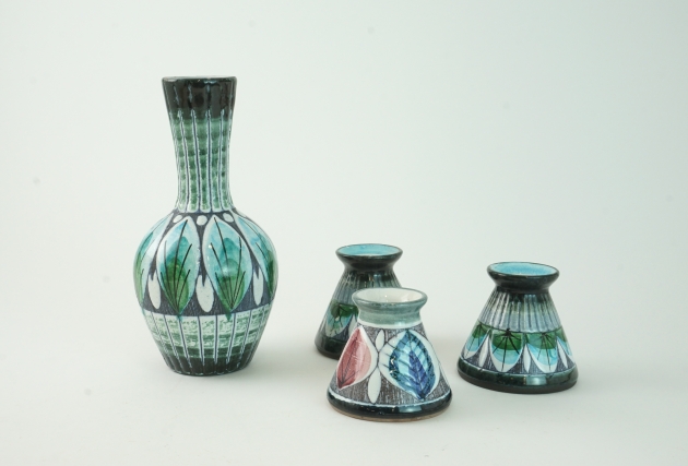 Två vaser samt tre ljusstakar av Tilgman. Mindre nagg förekommer på två stycken.