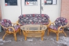 Sittgrupp i bambu och rotting med flockstoppade dynor. 3-sitssoffa, två fåtöljer och bord med glasskiva. Normalt bruksslitage, litet nagg i glasskiva och något solblekta dynor samt trådsläpp. Soffa, HxBxD, ca: 80cm x 178cm x 78cm Bord, HxBxL, ca: 55cm x 71cm x 120 cm