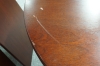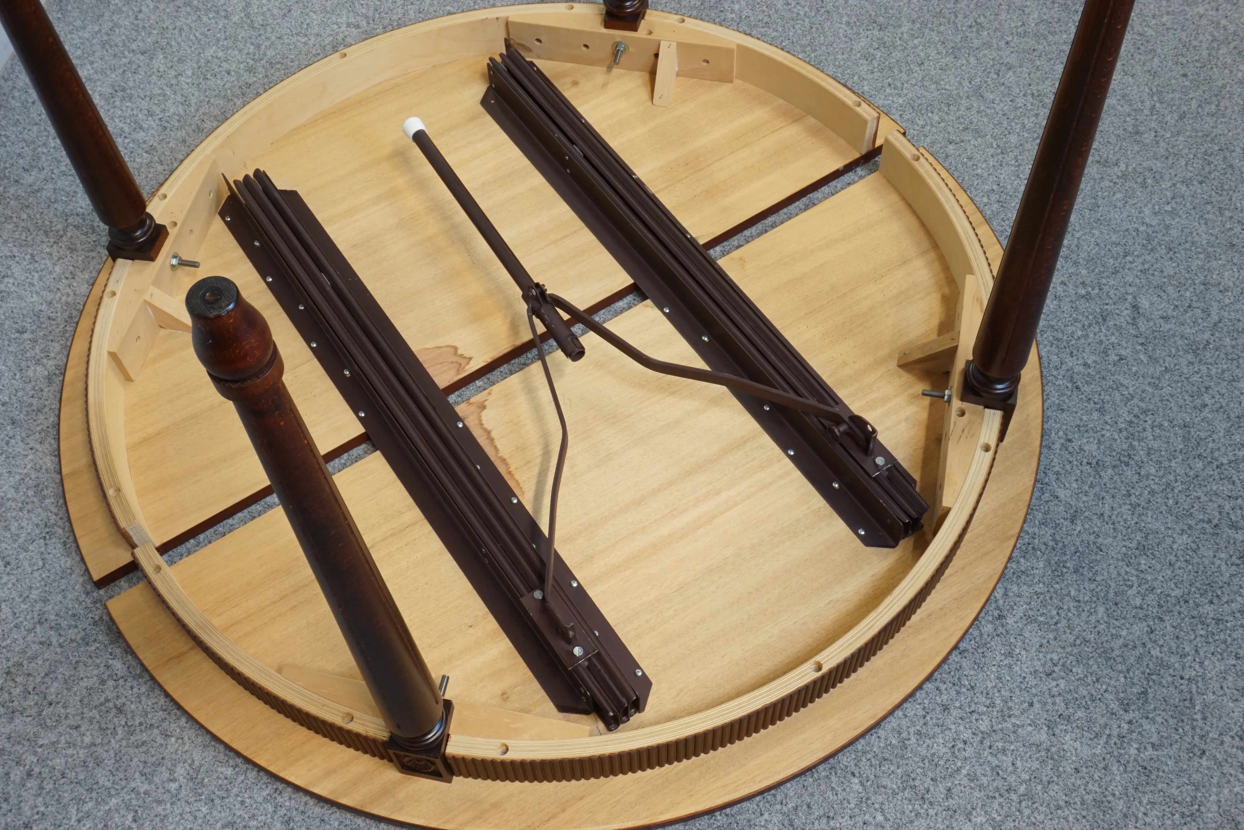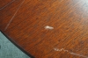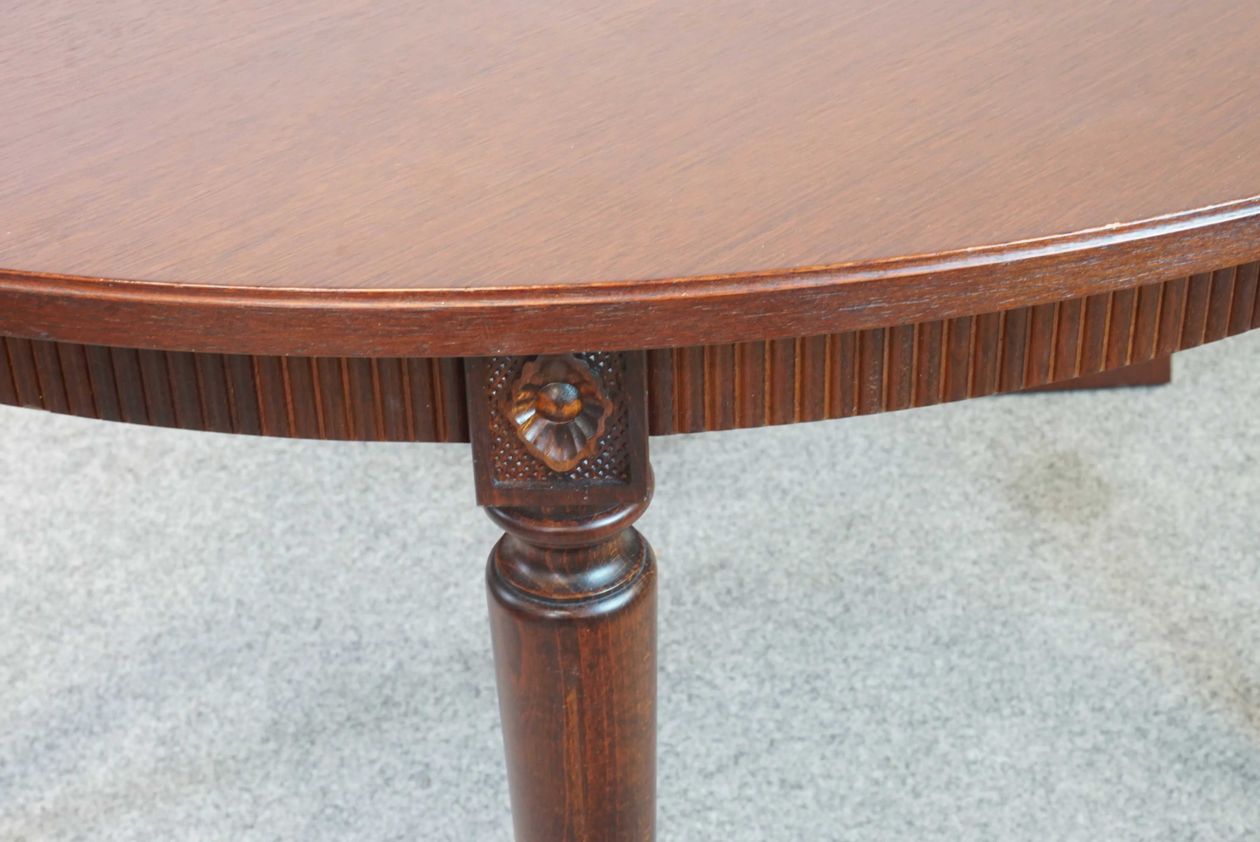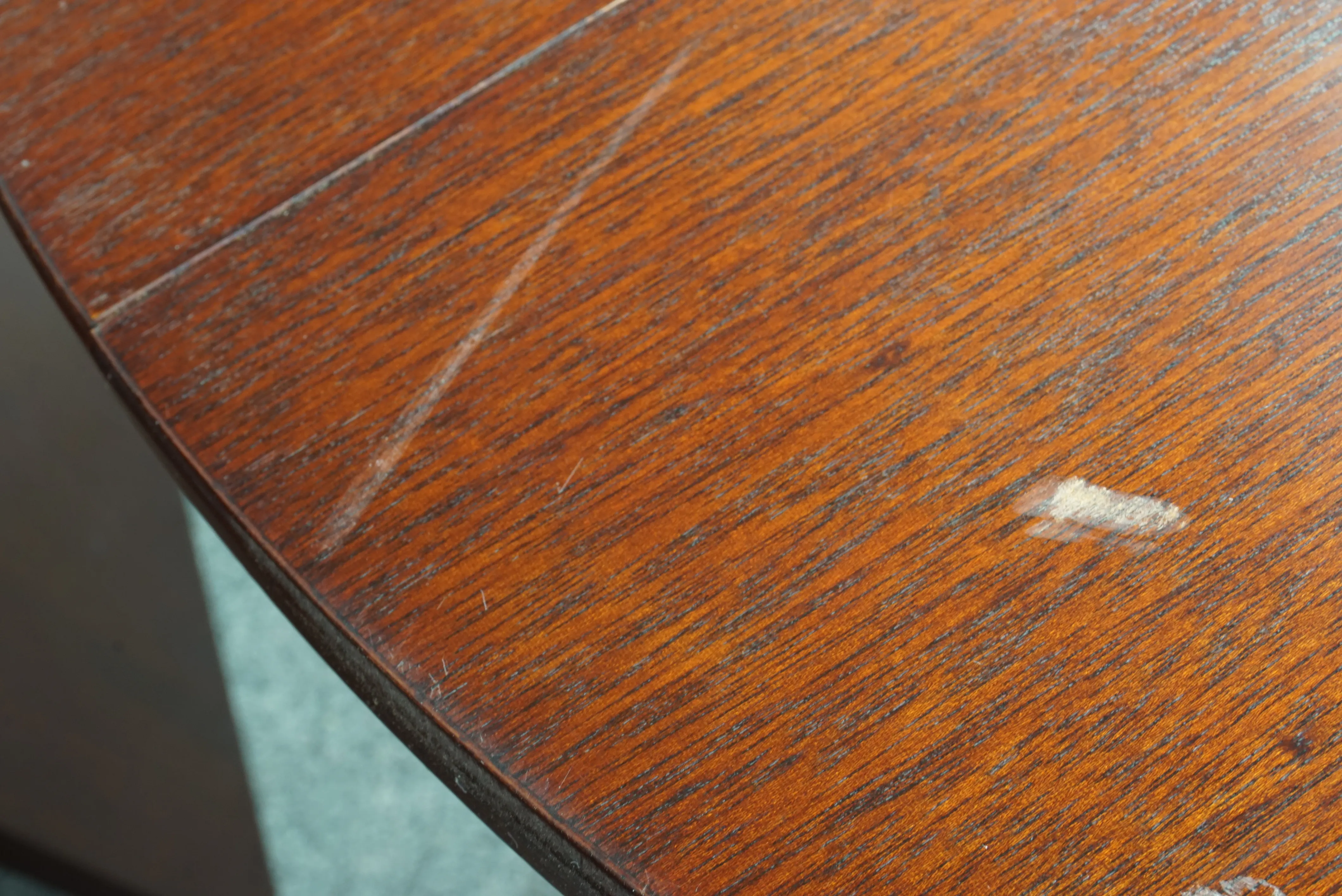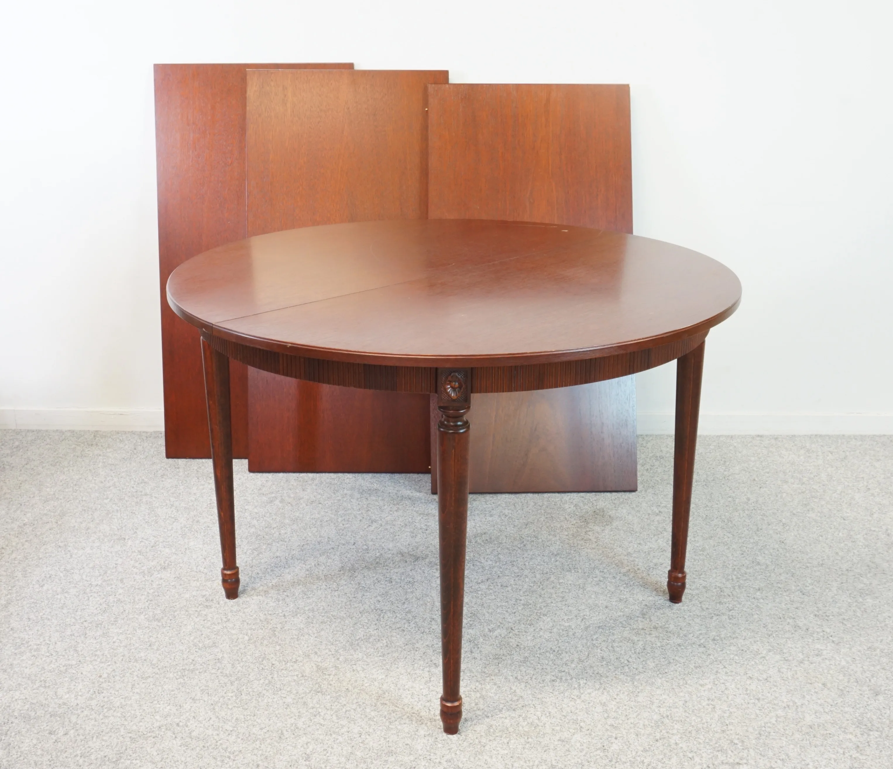 Bord med tillhörande illäggsskivor. Repor, skador på bordsskiva. D: ca 110cm, illäggsskivor 55 cm x 3 5 st stolar. Bruksslitage, hack förekommer. H: 94 cm