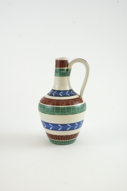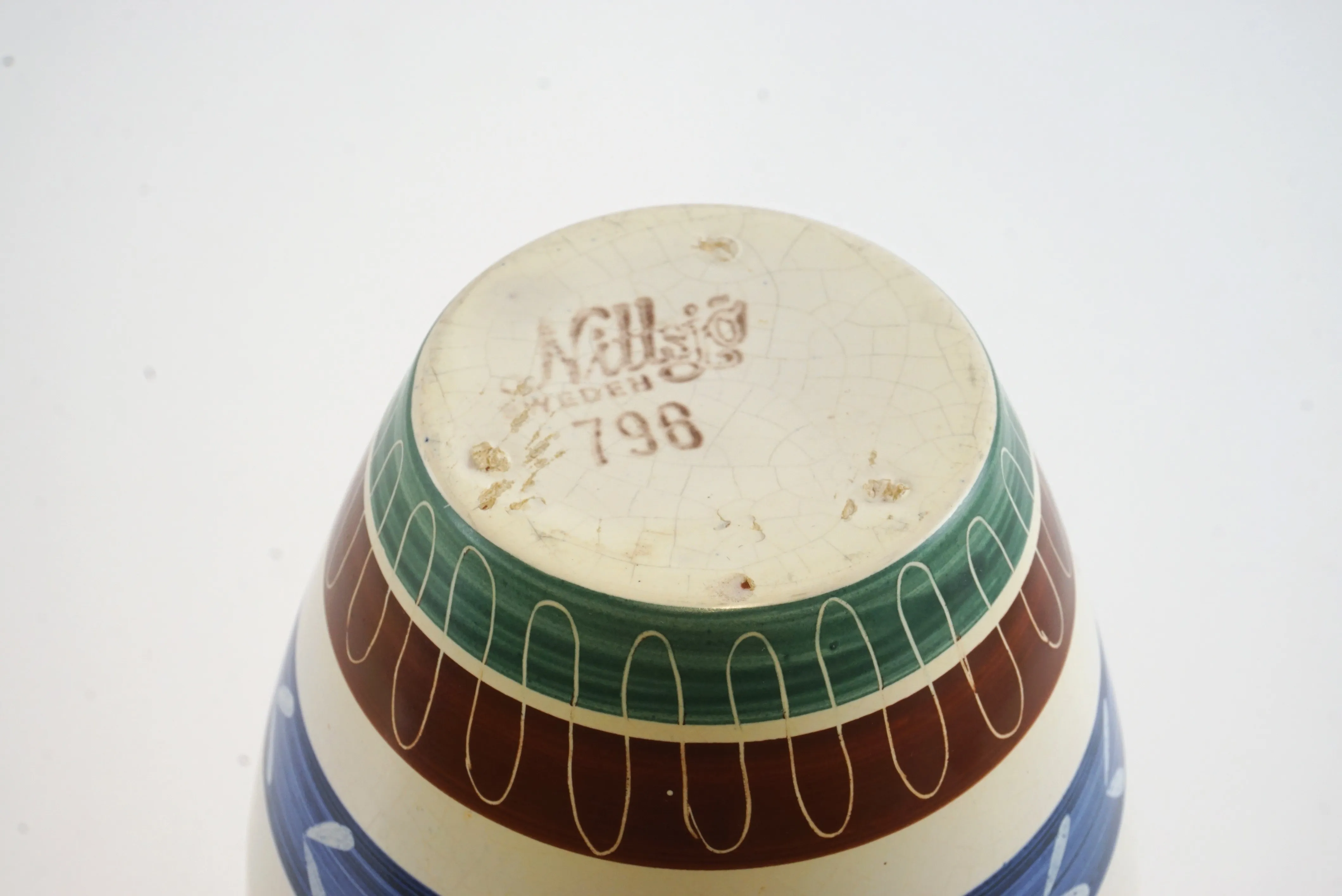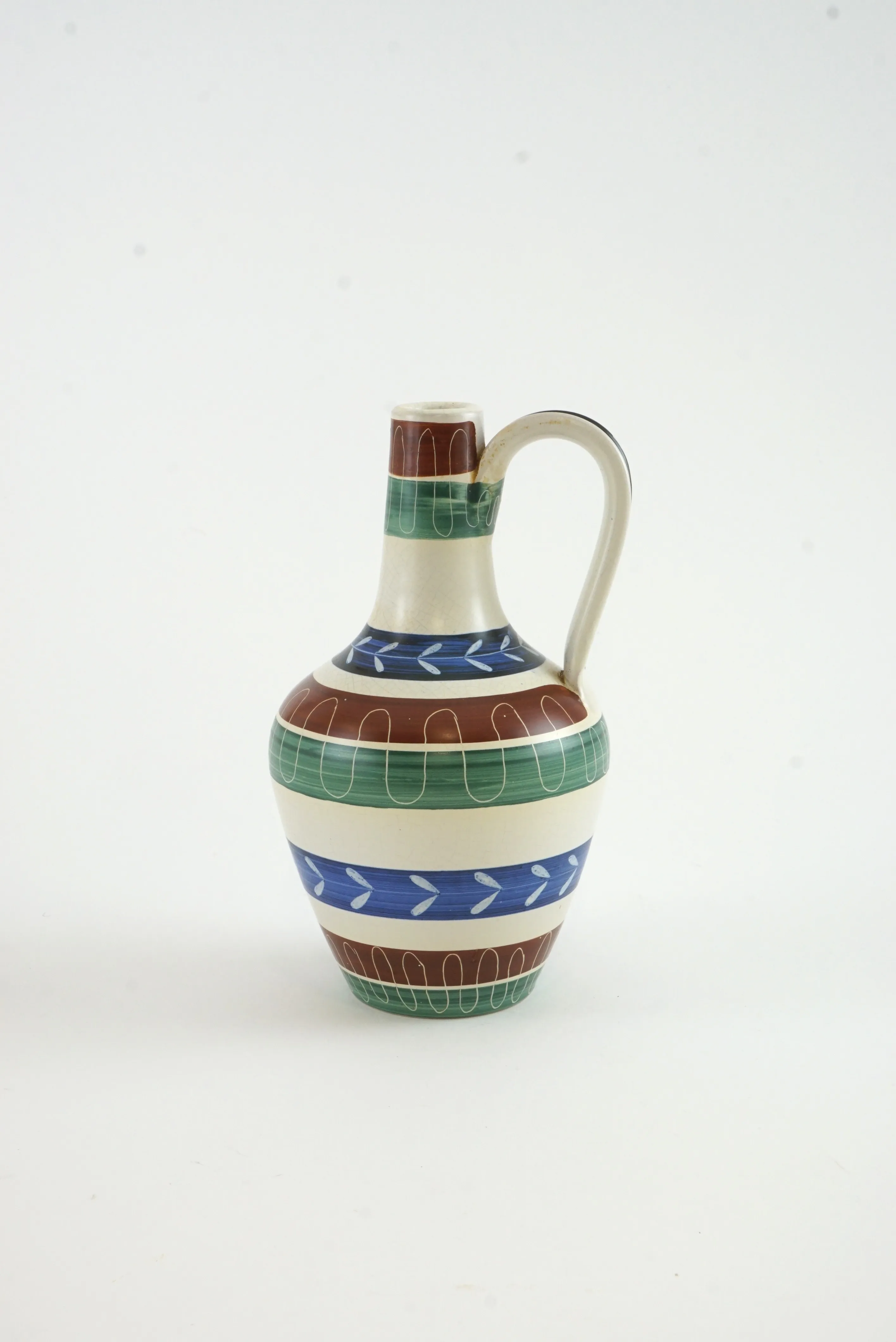 Keramikvas från Nittsjö keramik, med handmålade ränder och bladmönster. Höjd: 20 cm Bredd: 11 cm