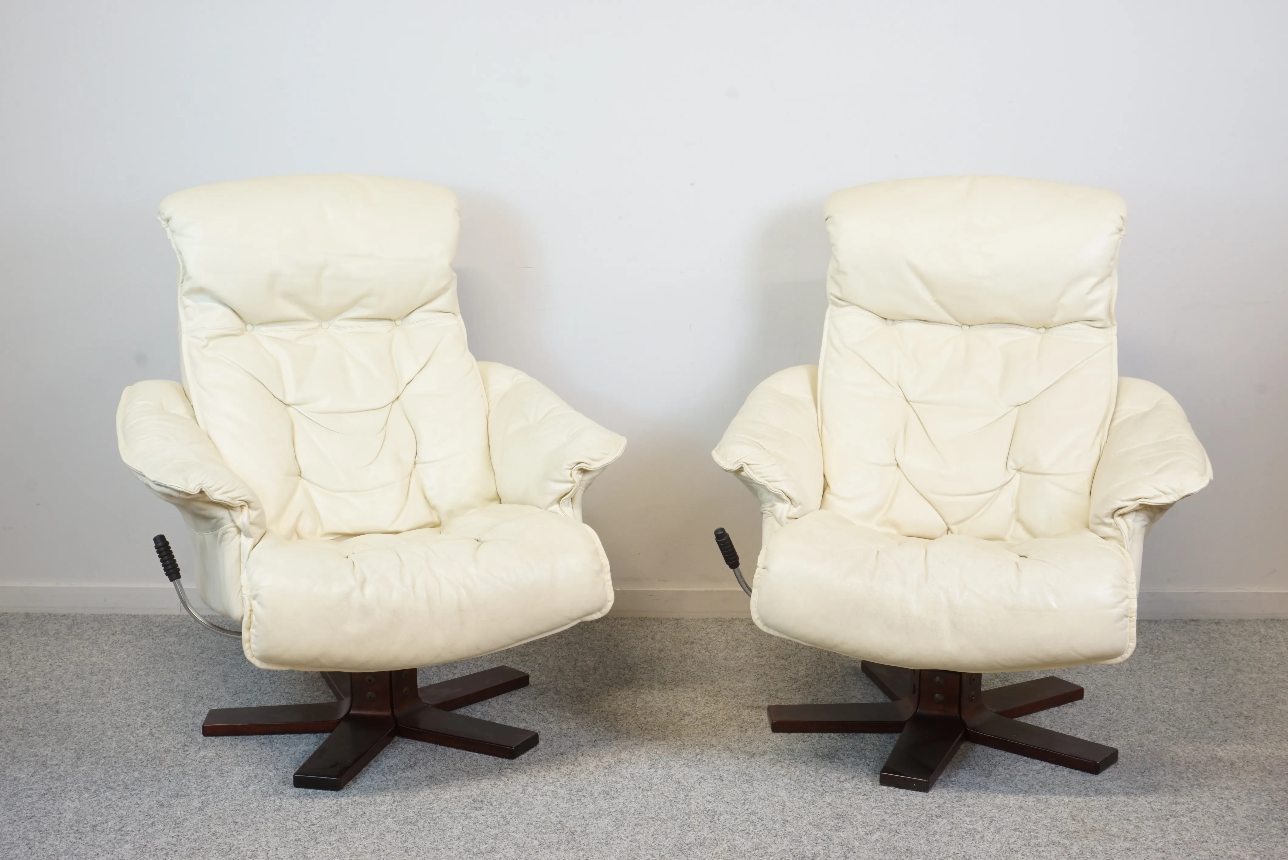 Två stycken snurrfåtöljer med vippfunktion i crémefärgat läder. Smuts förekommer.