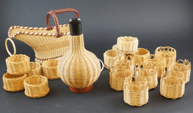 Parti med rottingföremål, lampa och flaskhållare