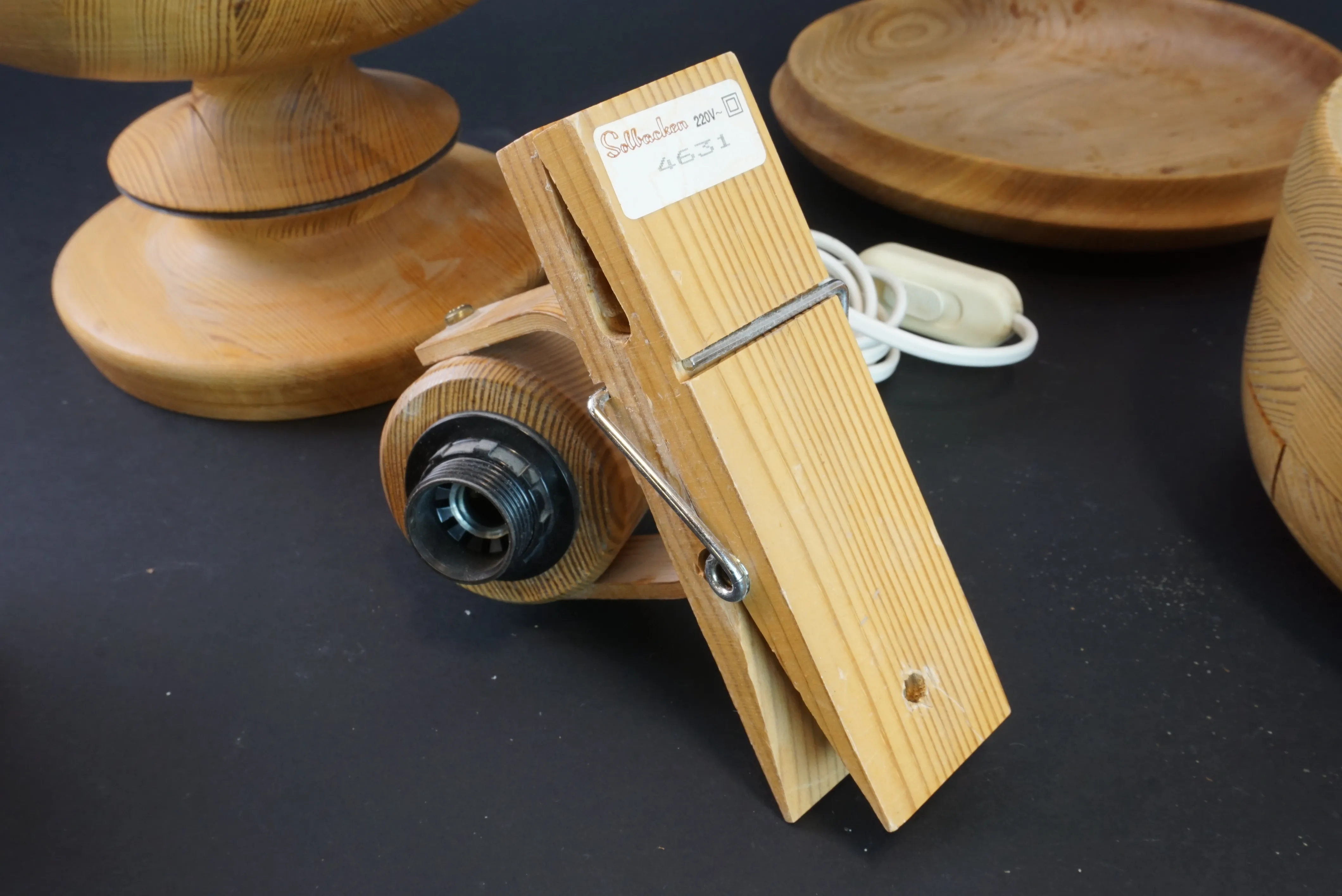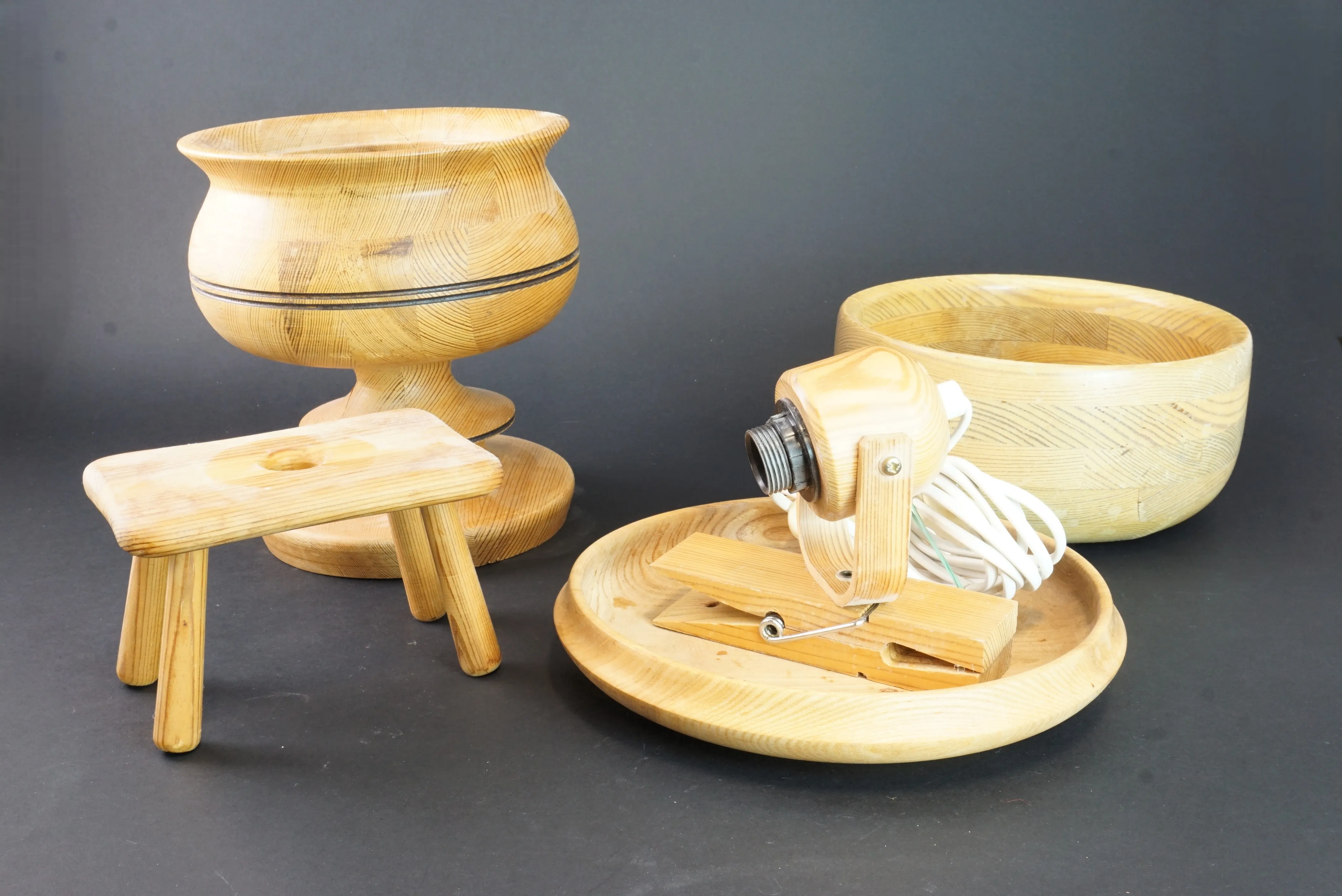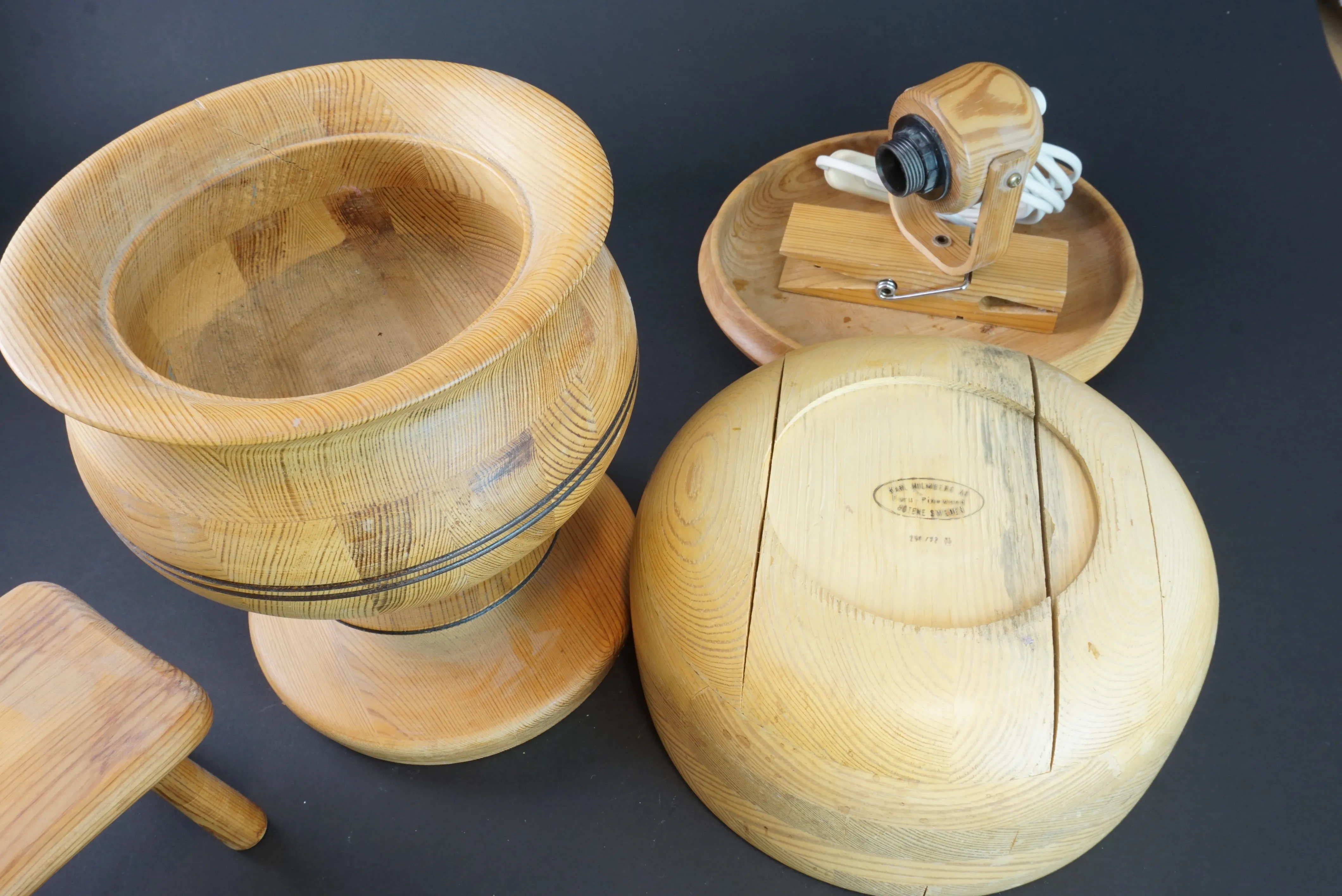 Parti med fem träföremål. Bl.a. furuskål från Karl Holmberg, Götene. Torrsprickor förekommer, se bilder.
