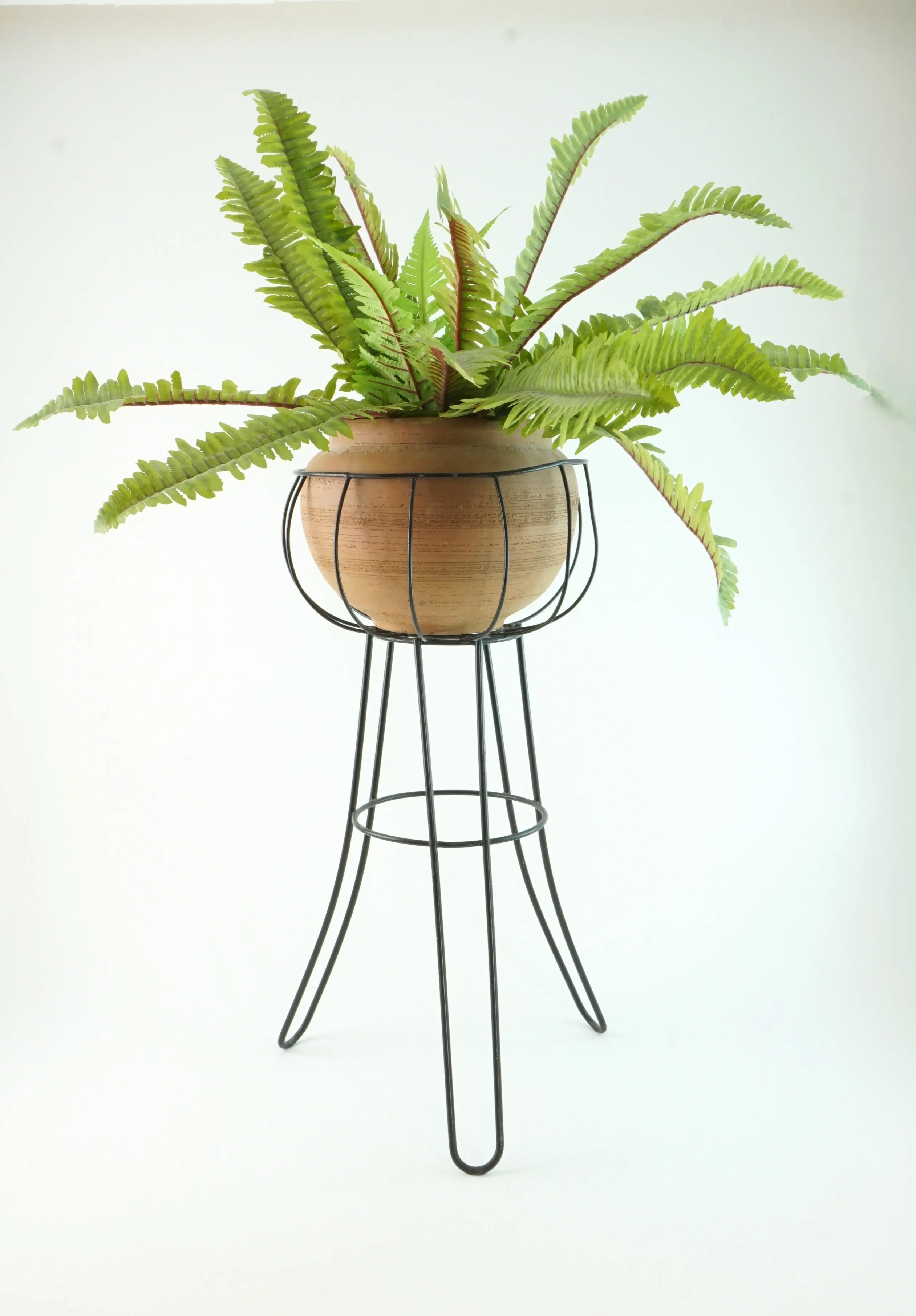 Piedestal med terracottakruka och konstgjord ormbunke. H: 50 cm