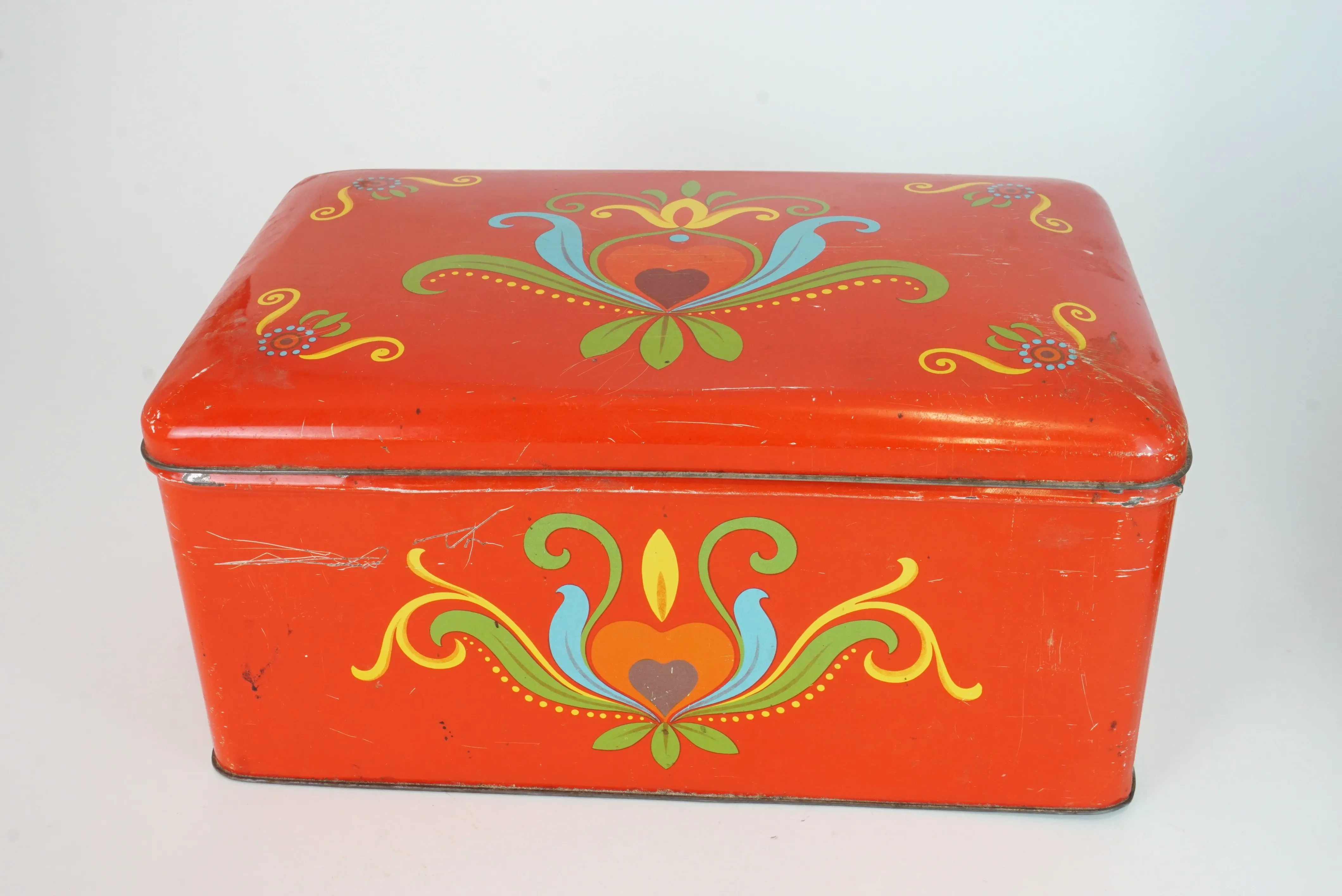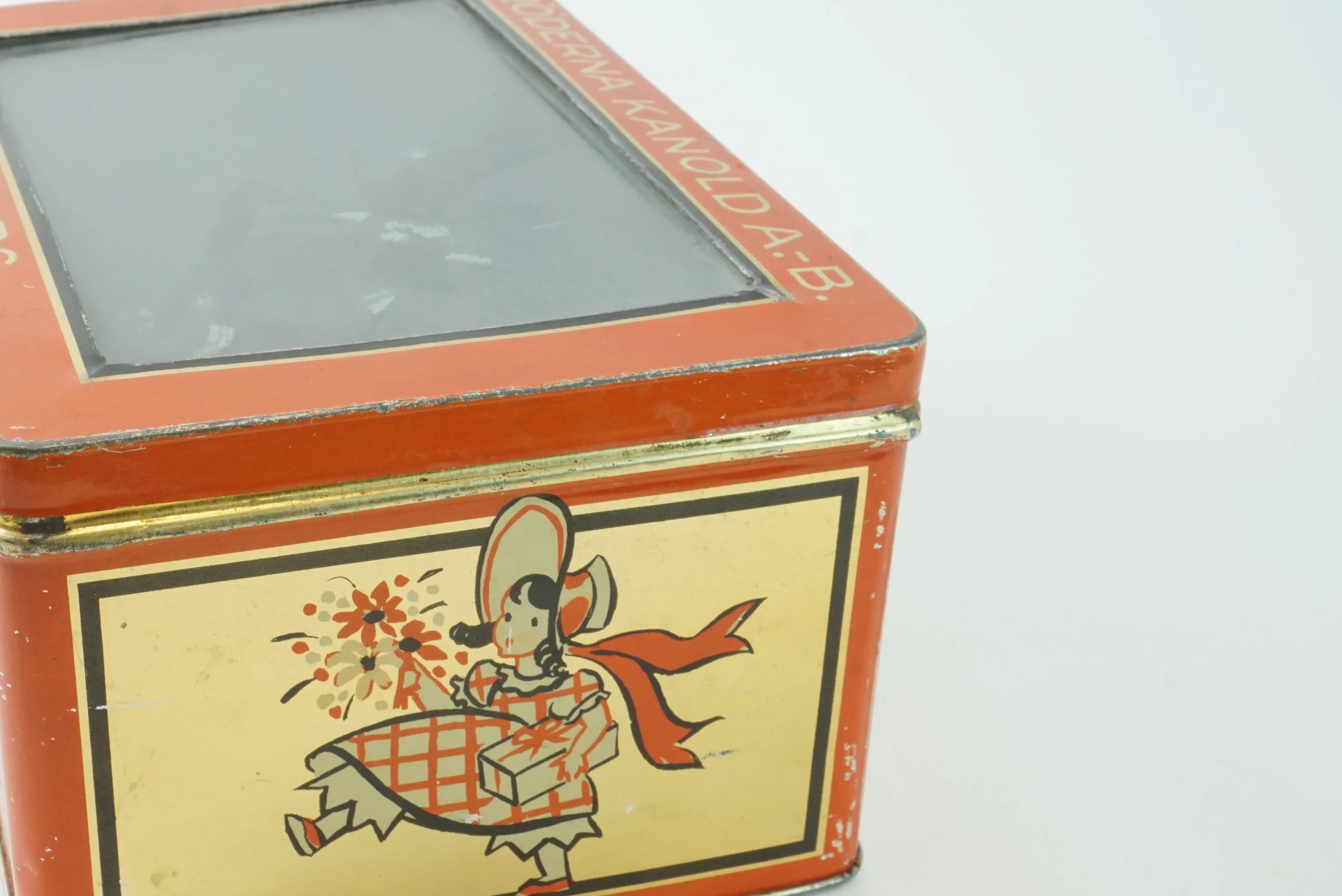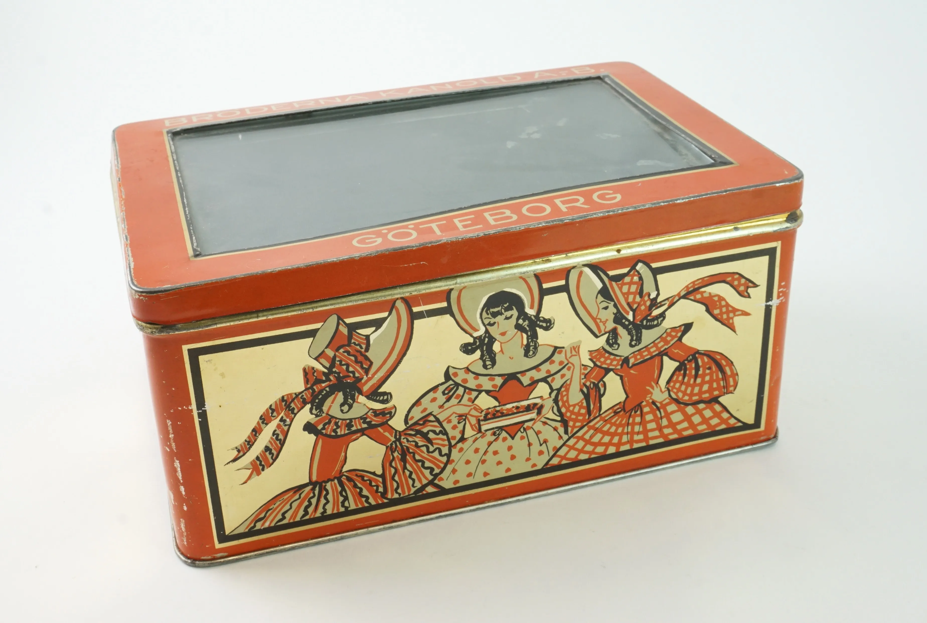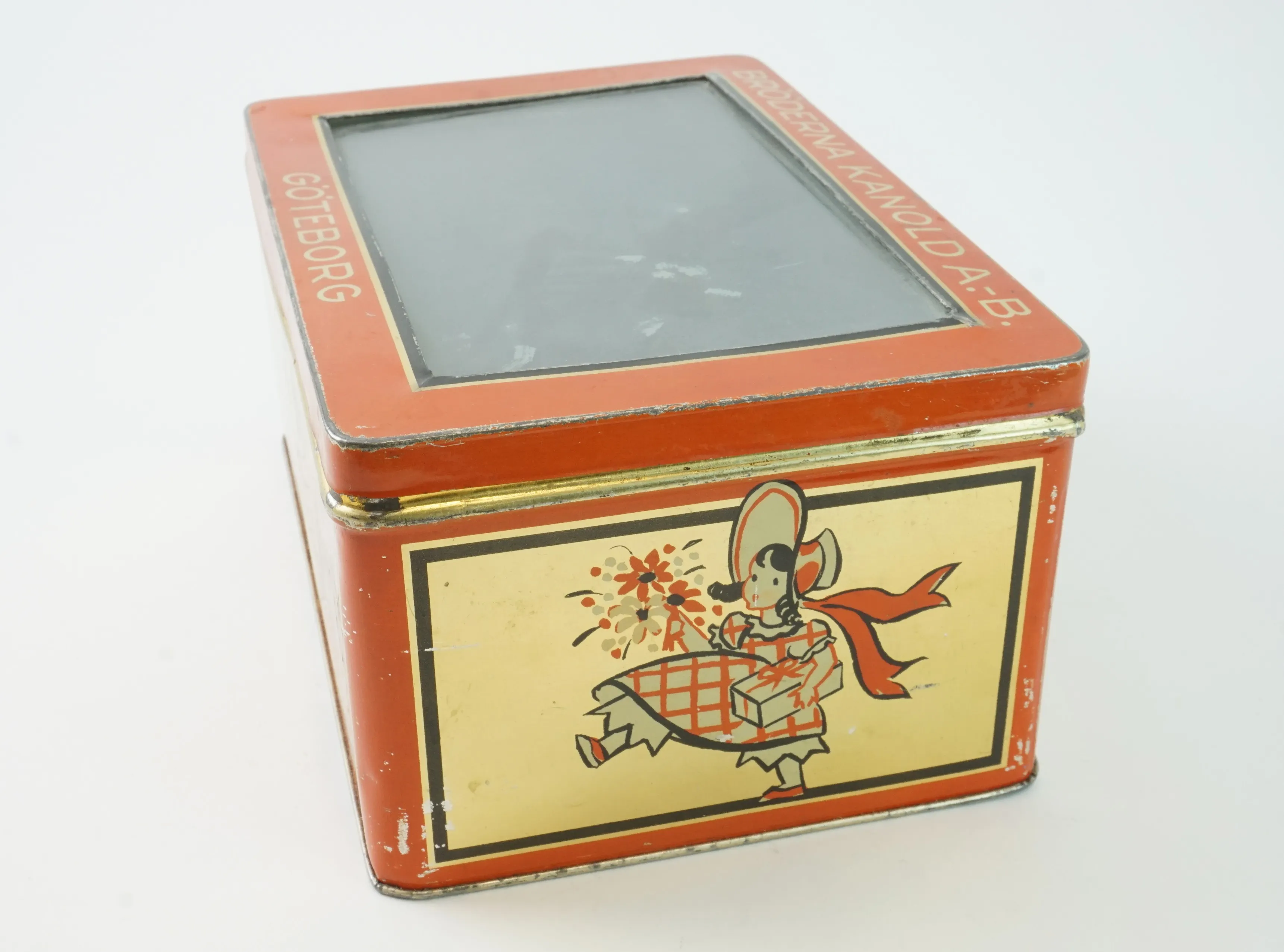 En brödlåda i plåt 32cm x 20cm x 15cm En burk från Bröderna Kanold AB med glasruta 22cm x 15cm x 10cm