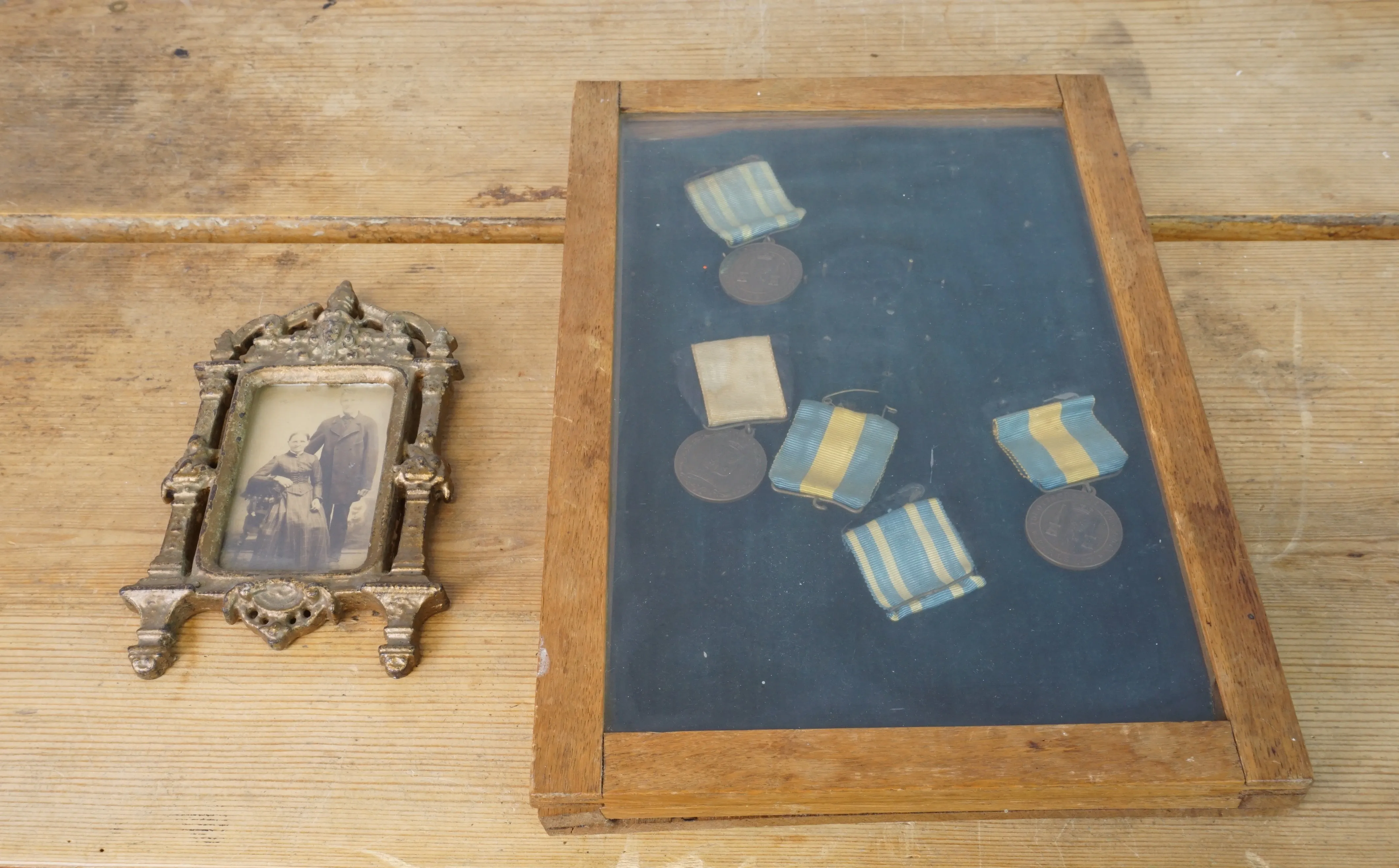 Ram i gjutjärn och medaljtavla i trä och glas