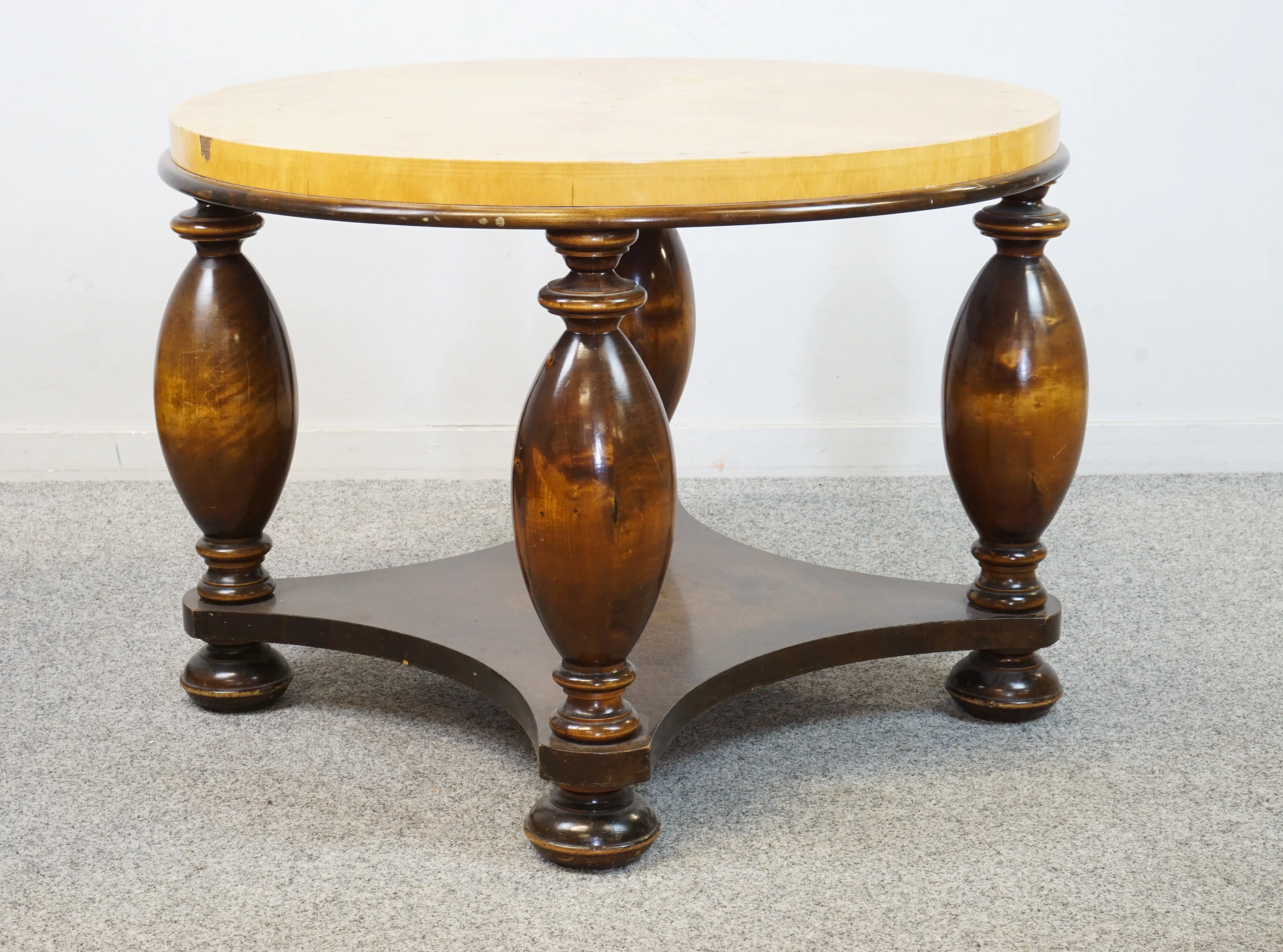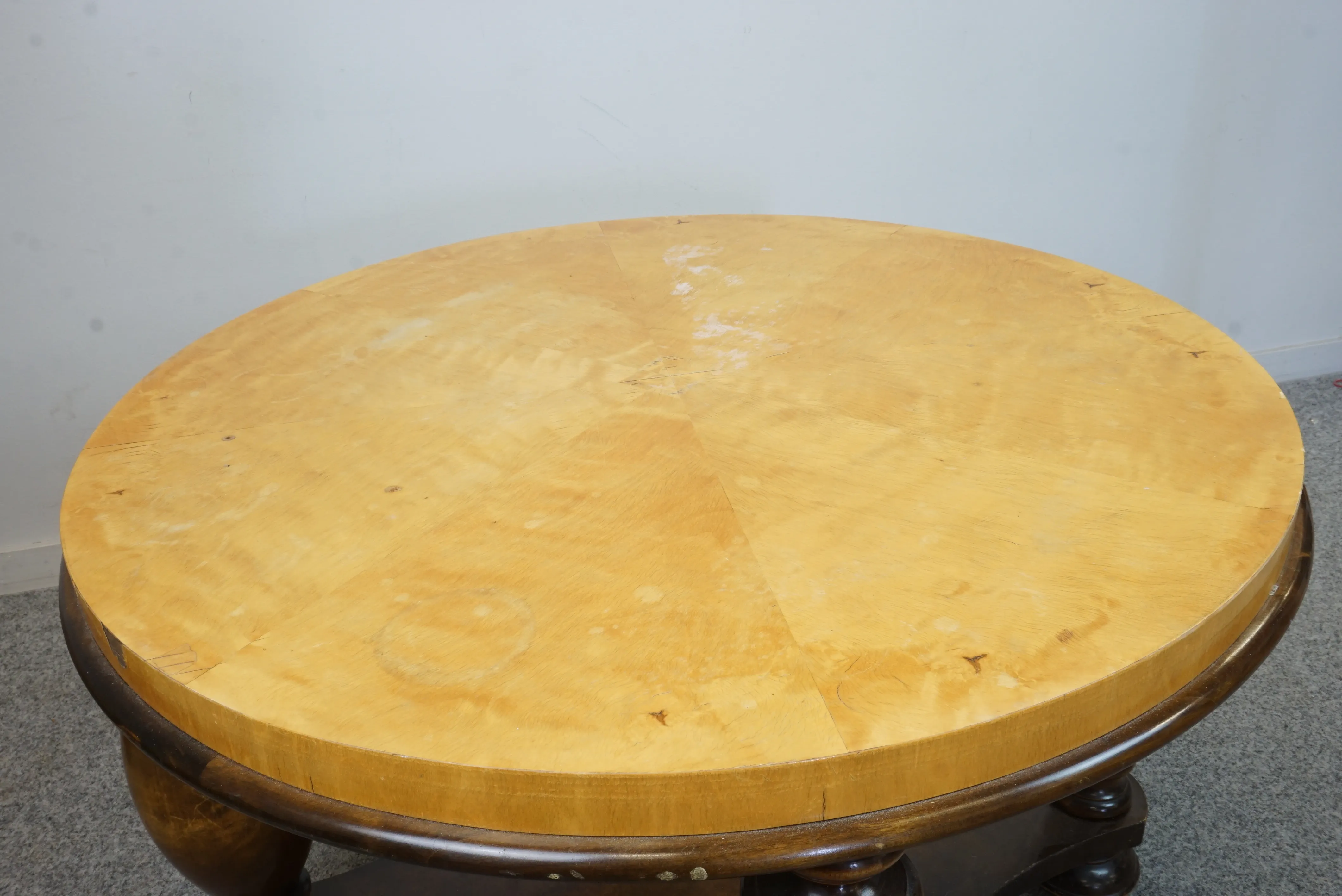 Slitage som fläckar, krackeleringar i lacken samt fanerskador. Höjd. 58cm Diameter 83cm