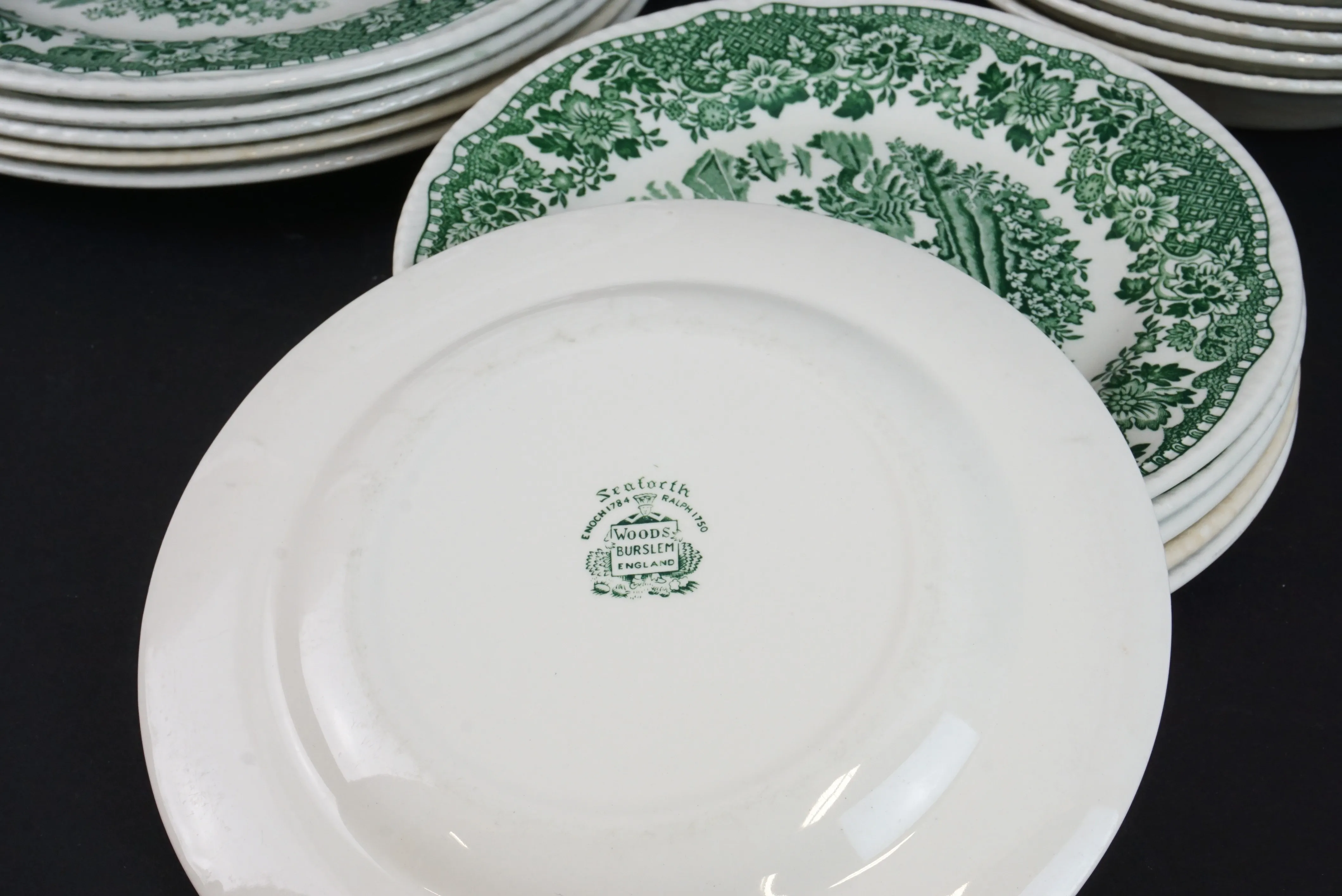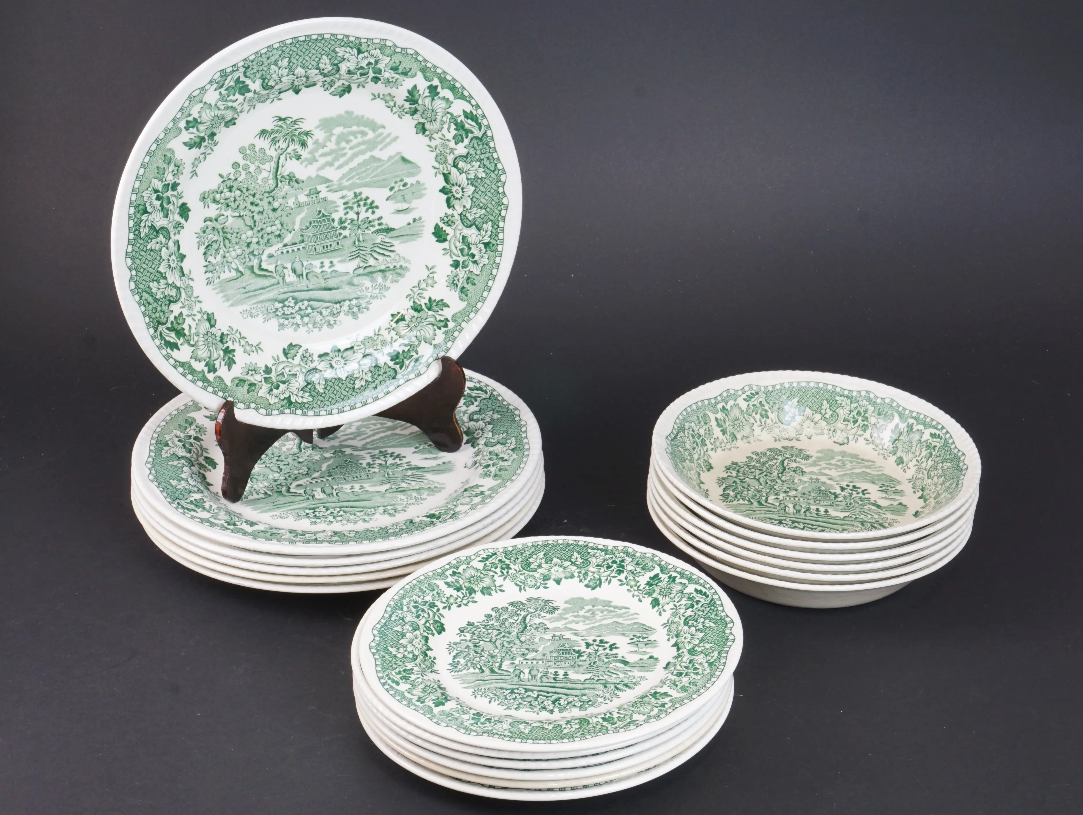 6 tallrikar, 6 assietter, 6 skålar. Diameter 20-25,5cm. Krackelering och missfärgning på skålar, en tallrik, en assiett.