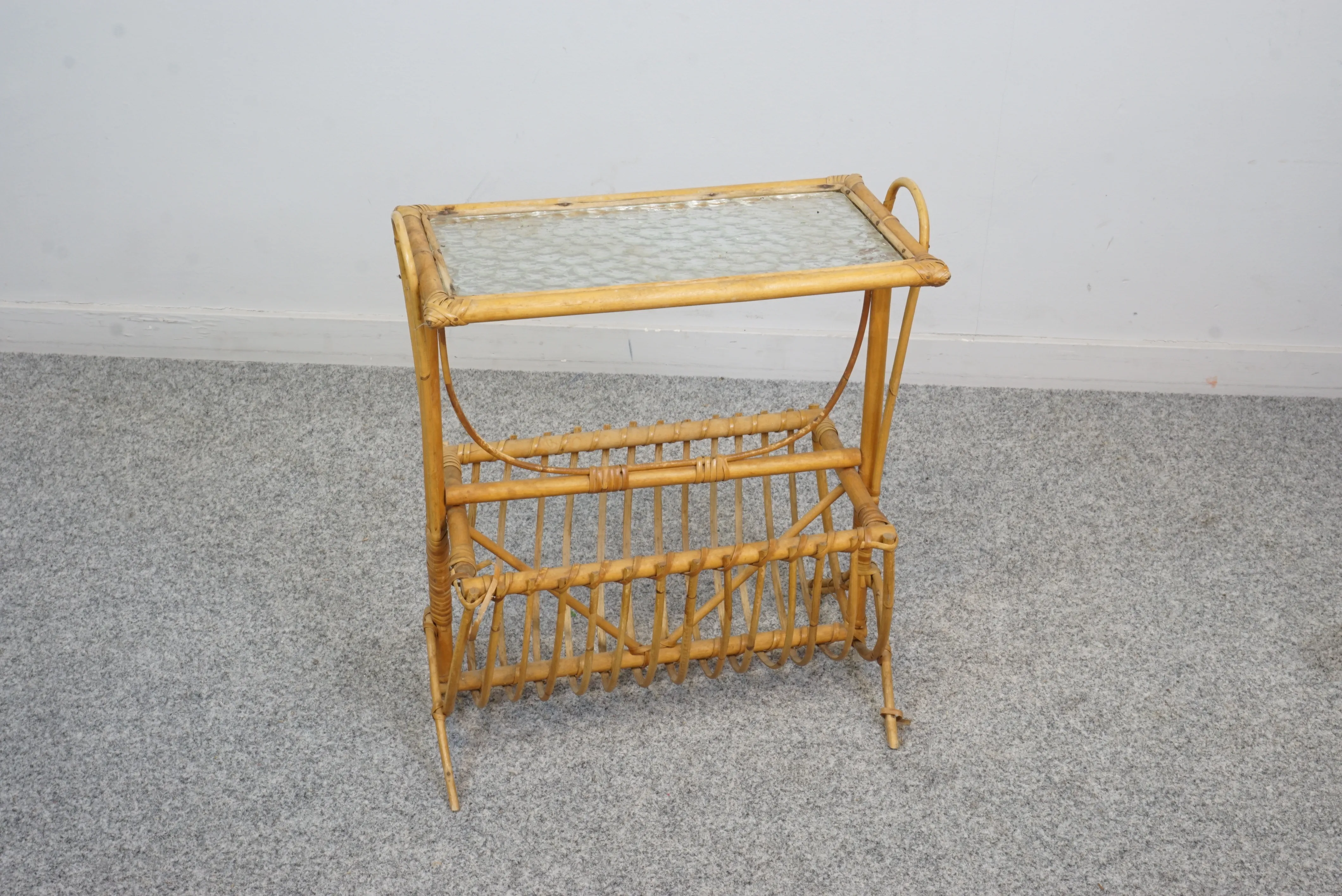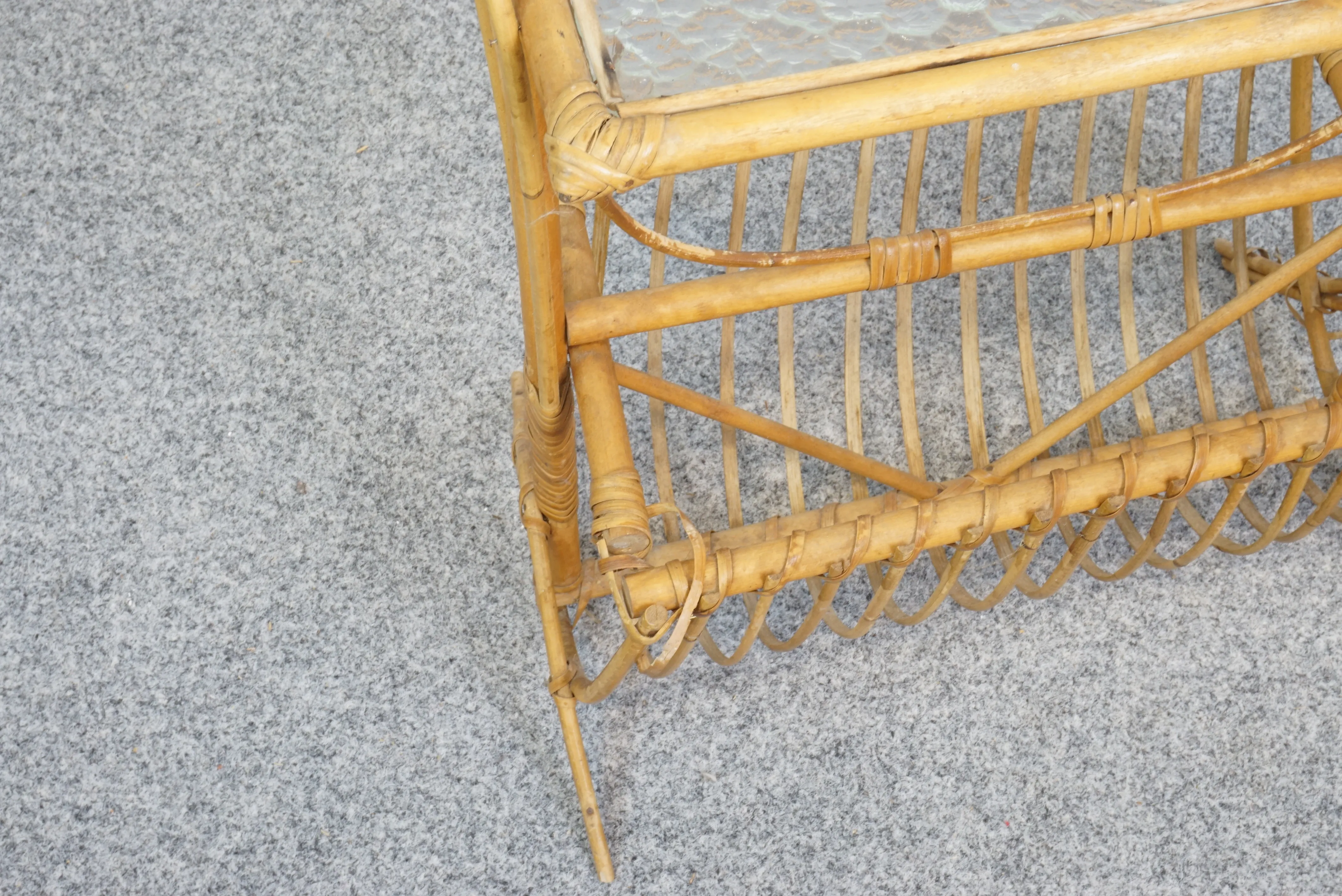 Sidobord med tidningsställ i rotting/ glasskiva. 1900-tal. H: 50x 47x 24 cm