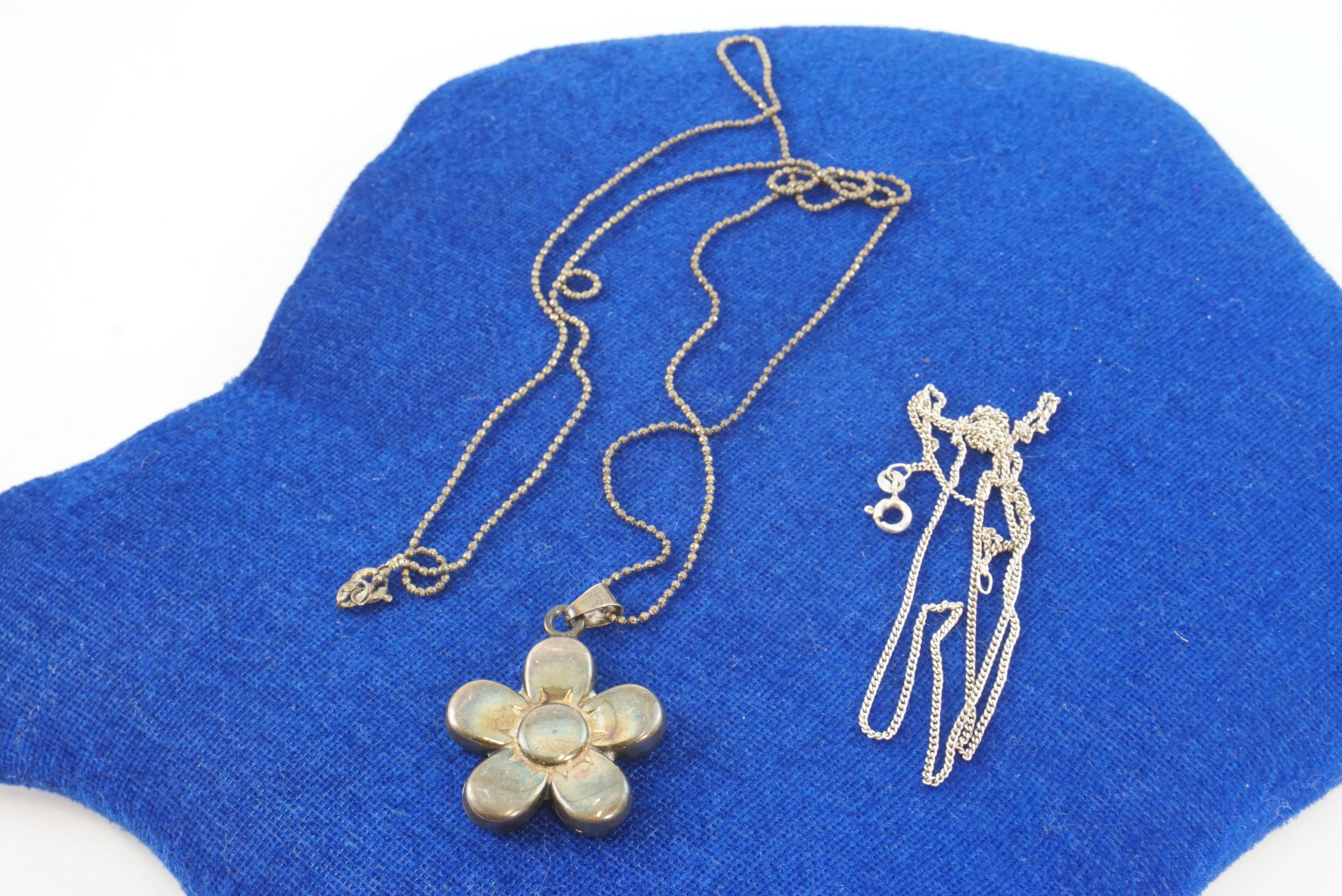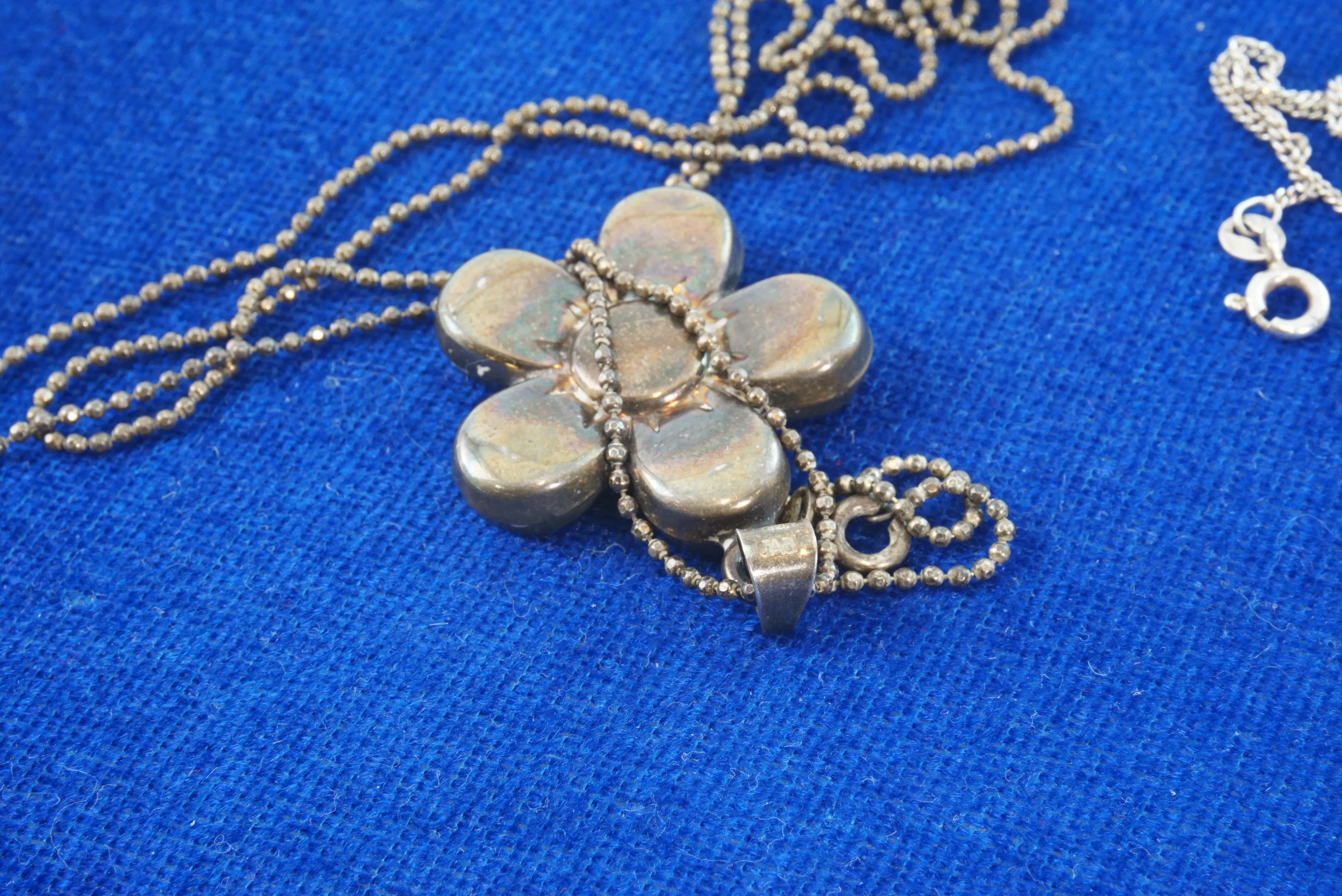 Långt silverhalsband med blomhänge av Jens Aagaard, Danmark märkt 925. Silverkedja märkt 925. Totalt 13,3 gram.