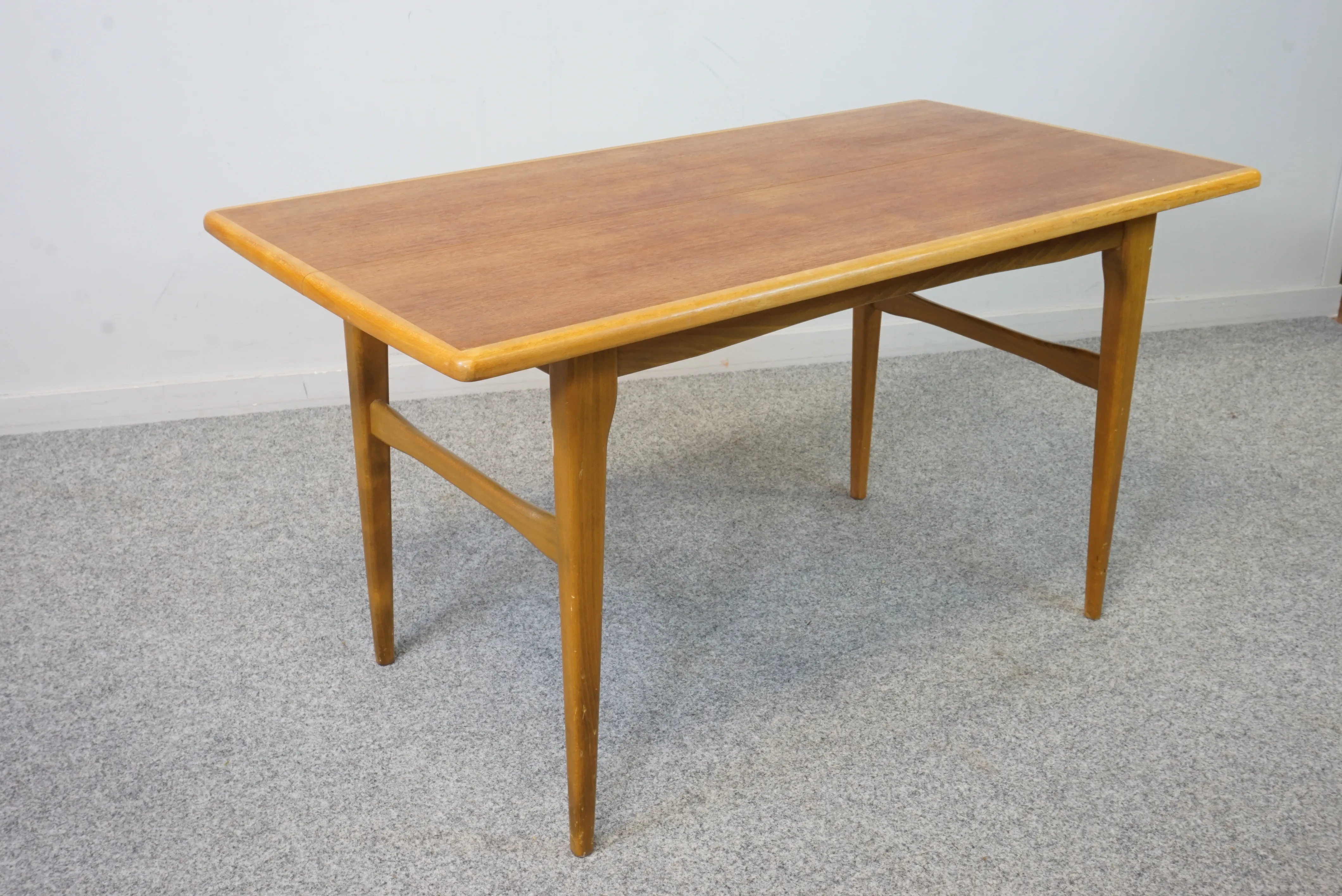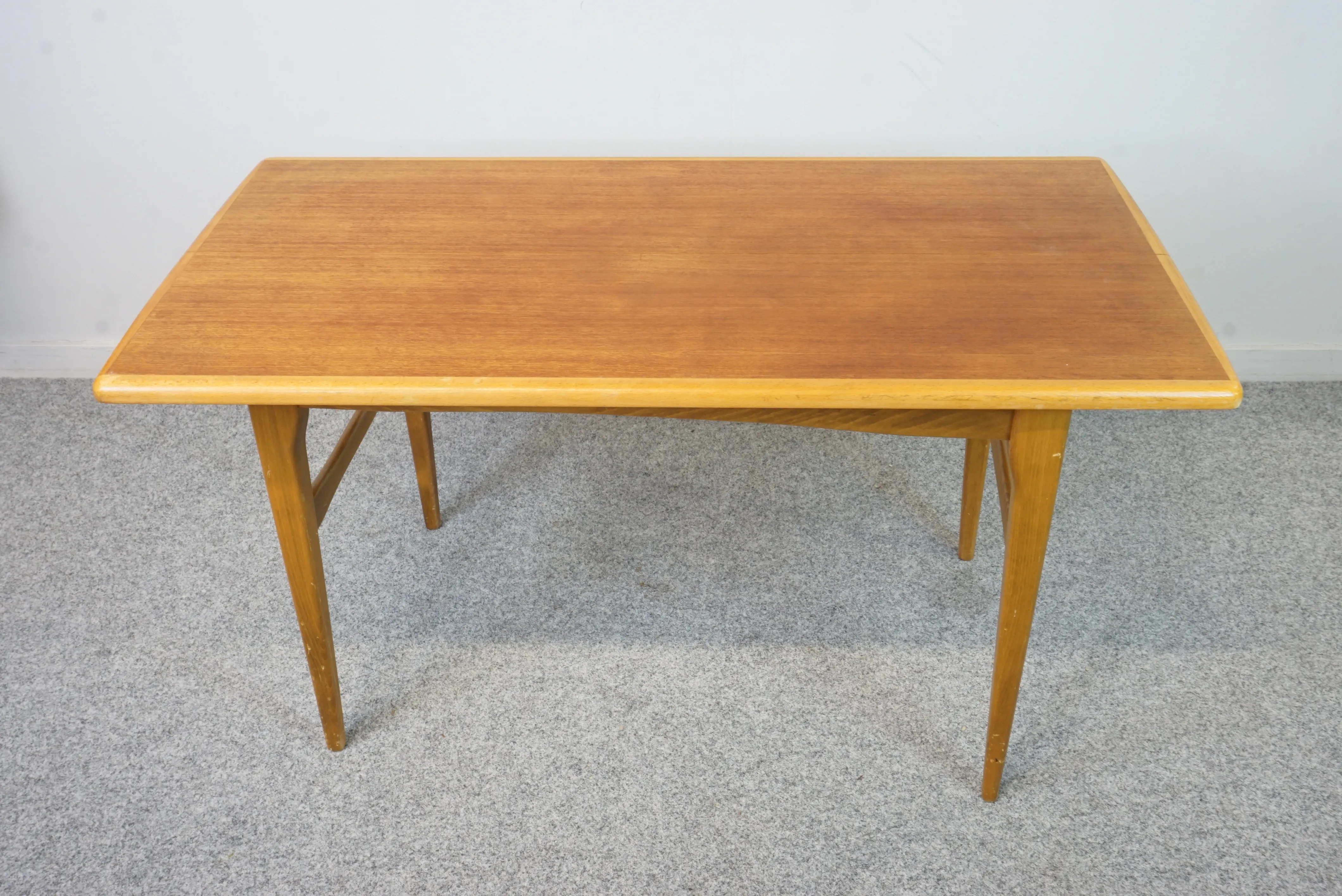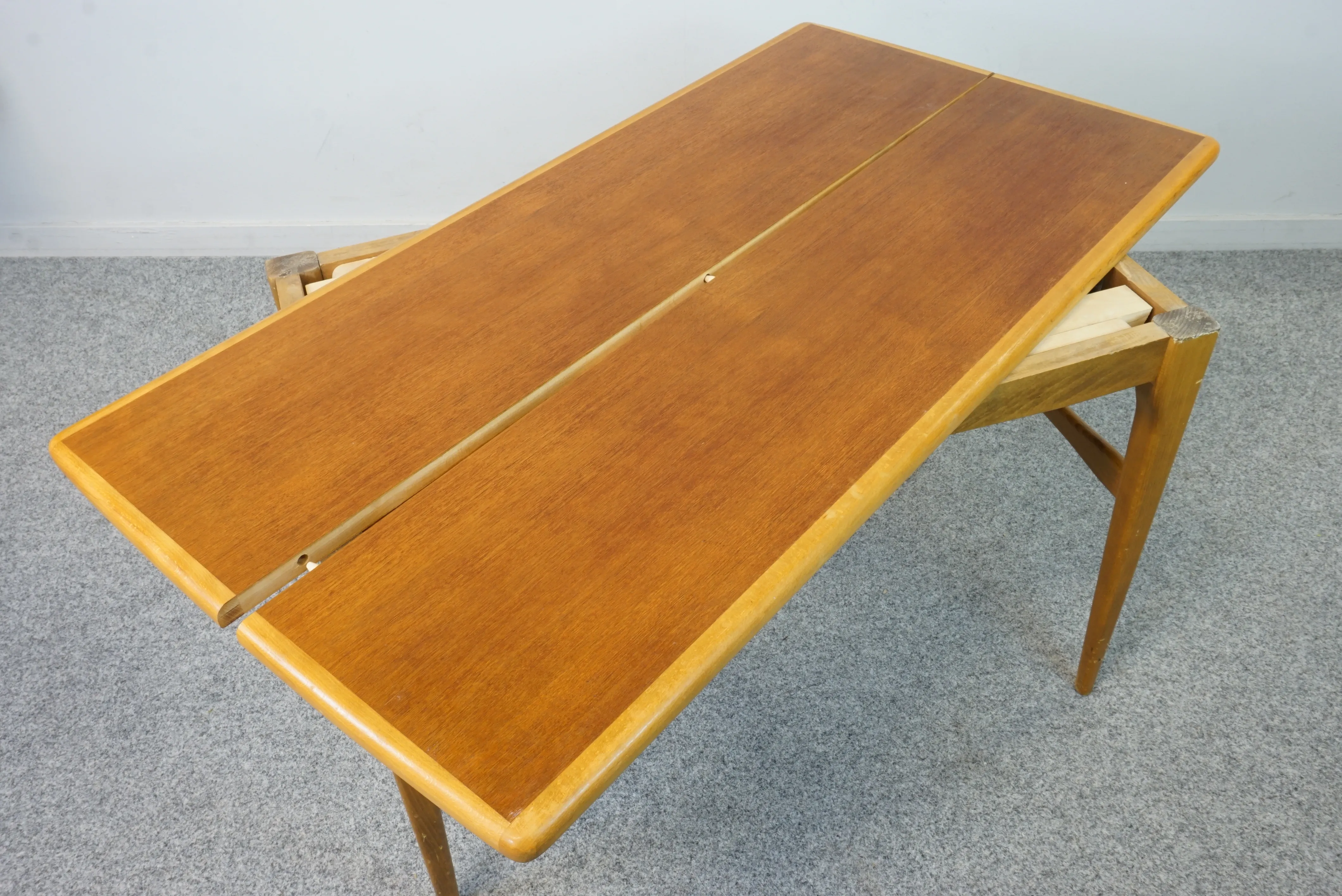 Soffbord i teak med en ram i ek. Bordet är utdragbart men iläggsskiva saknas. Bredd: 57 cm Längd: 109 cm Höjd: 58 cm
