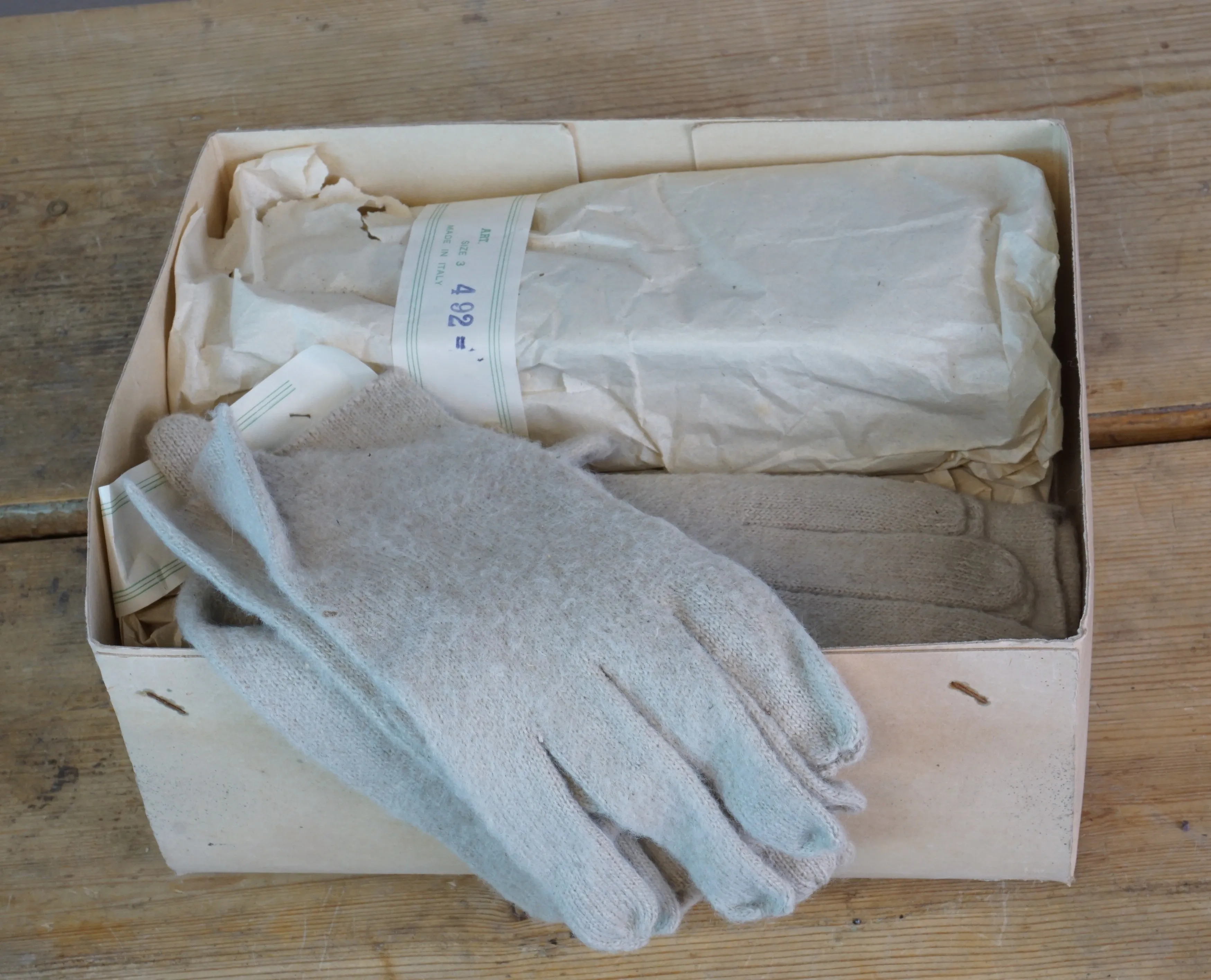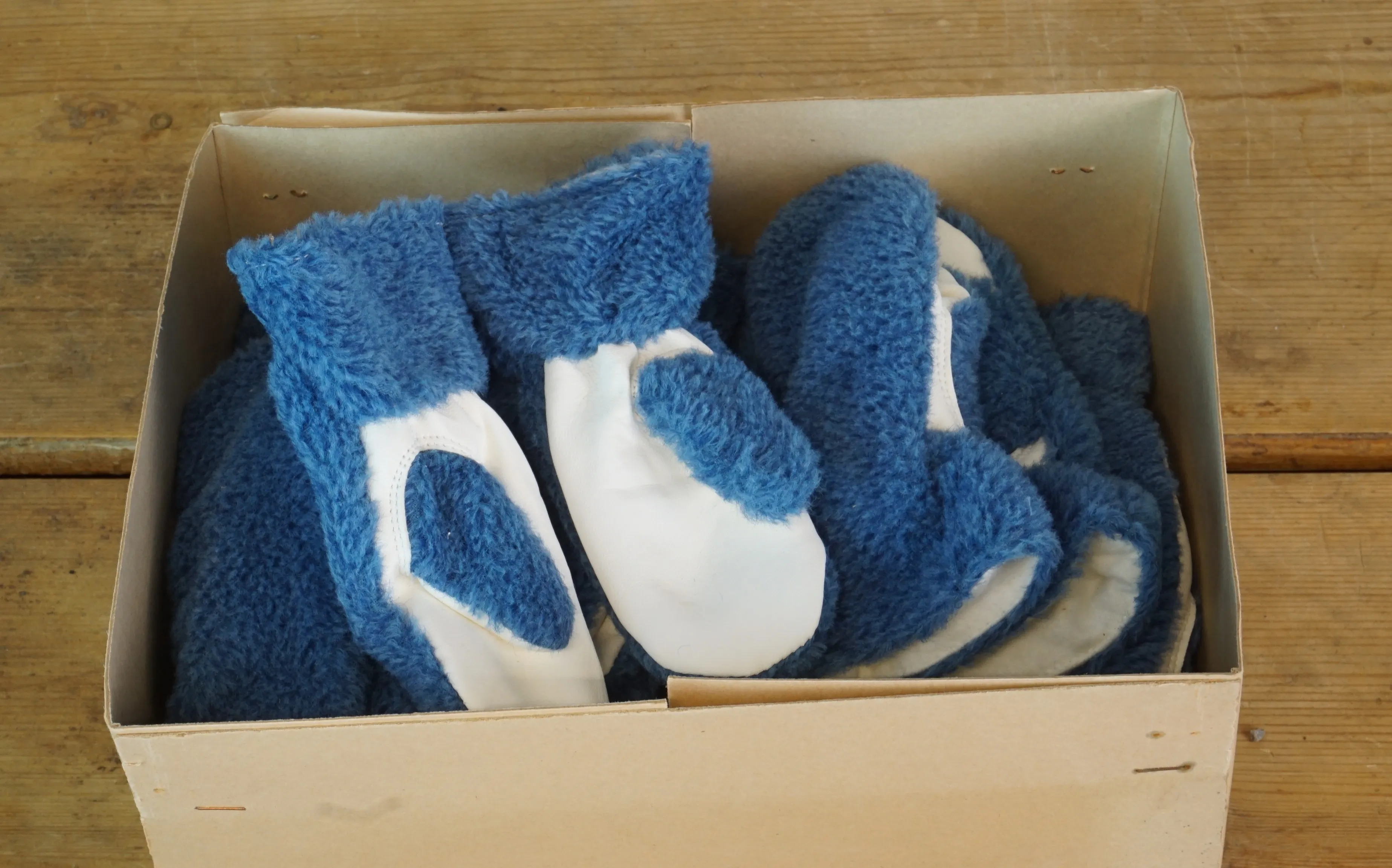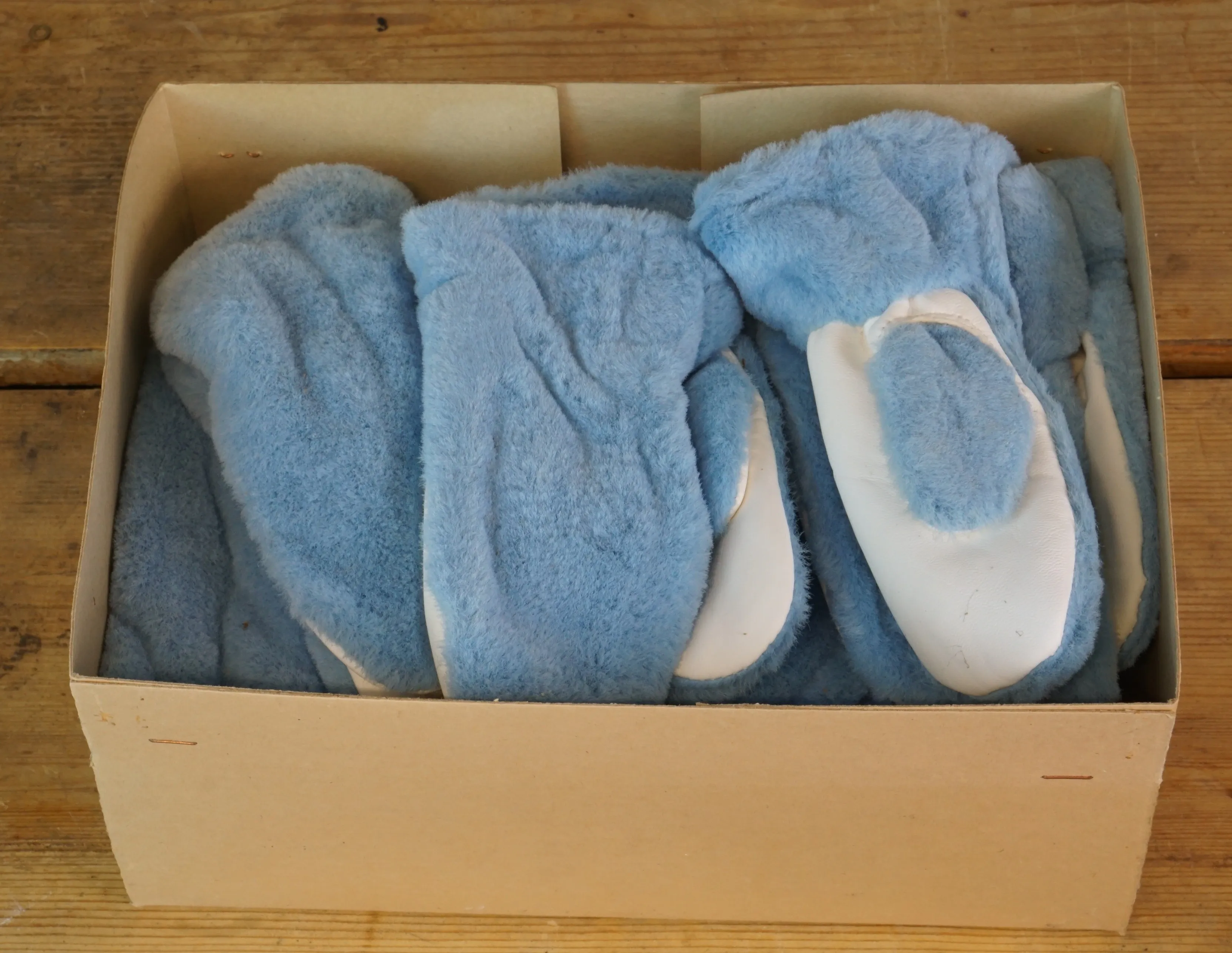 Parti barnvantar i olika storlekar. 7 kartonger. 1 kartong fingervantar vuxen. I oanvänt skick men luktar gammalt. Ej genomgått.