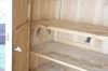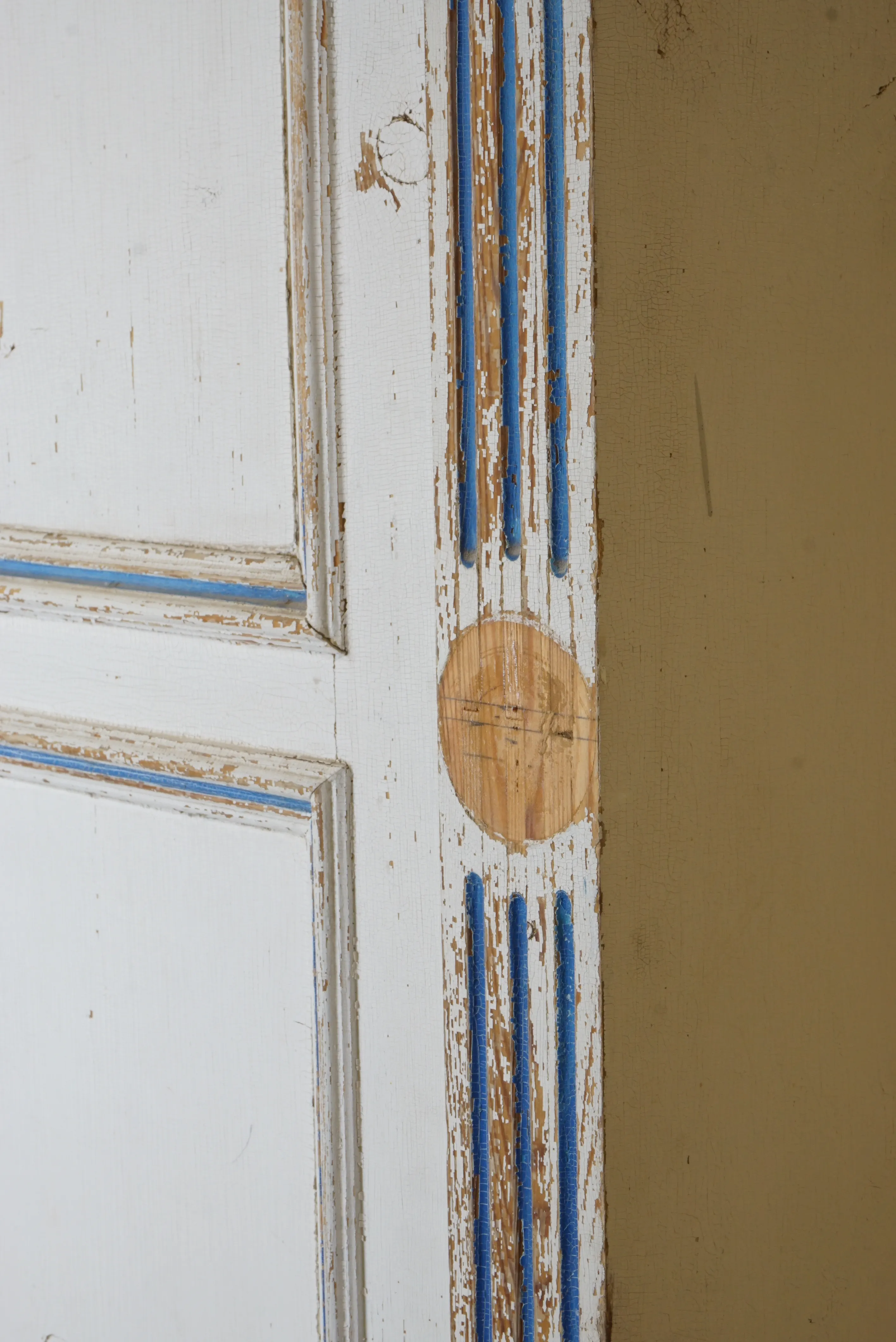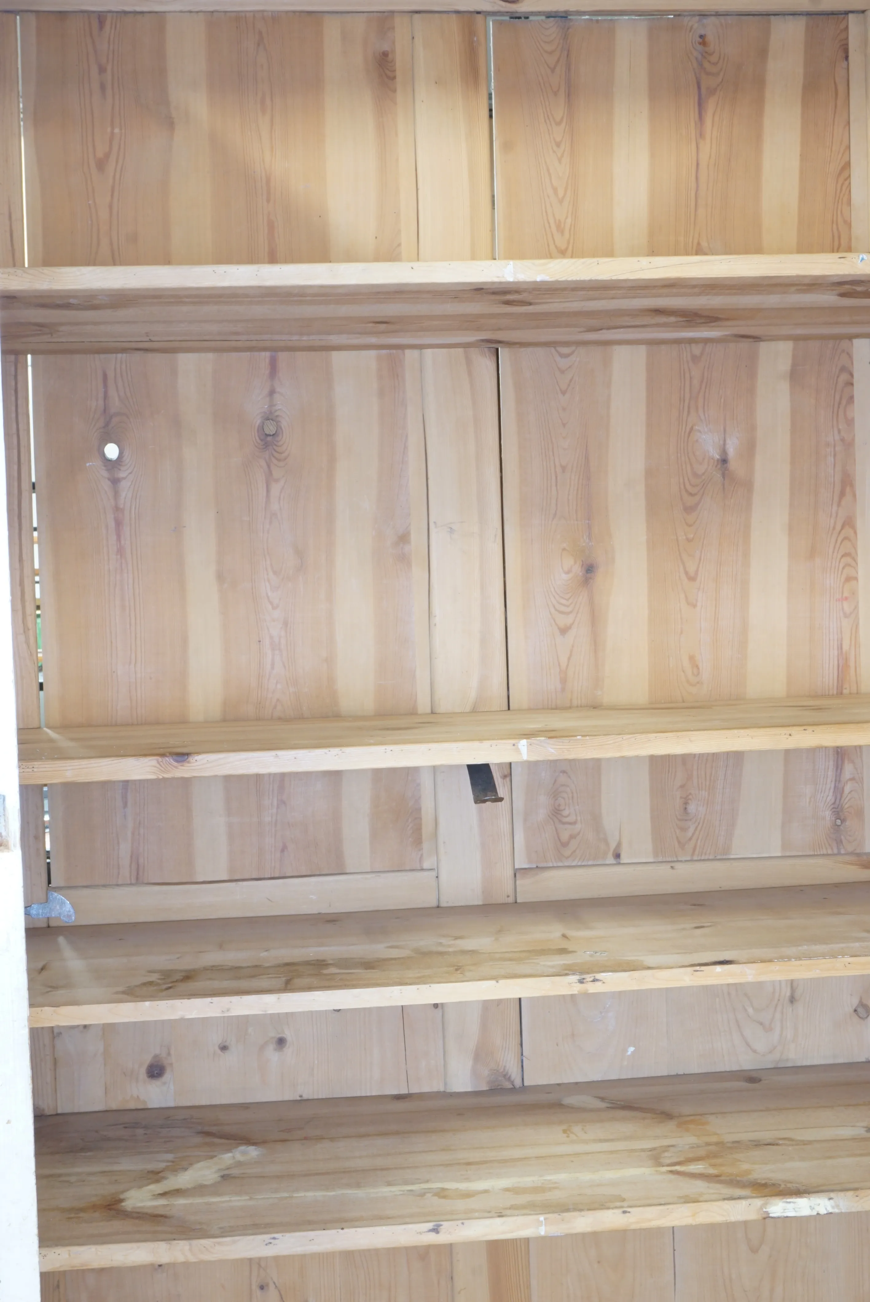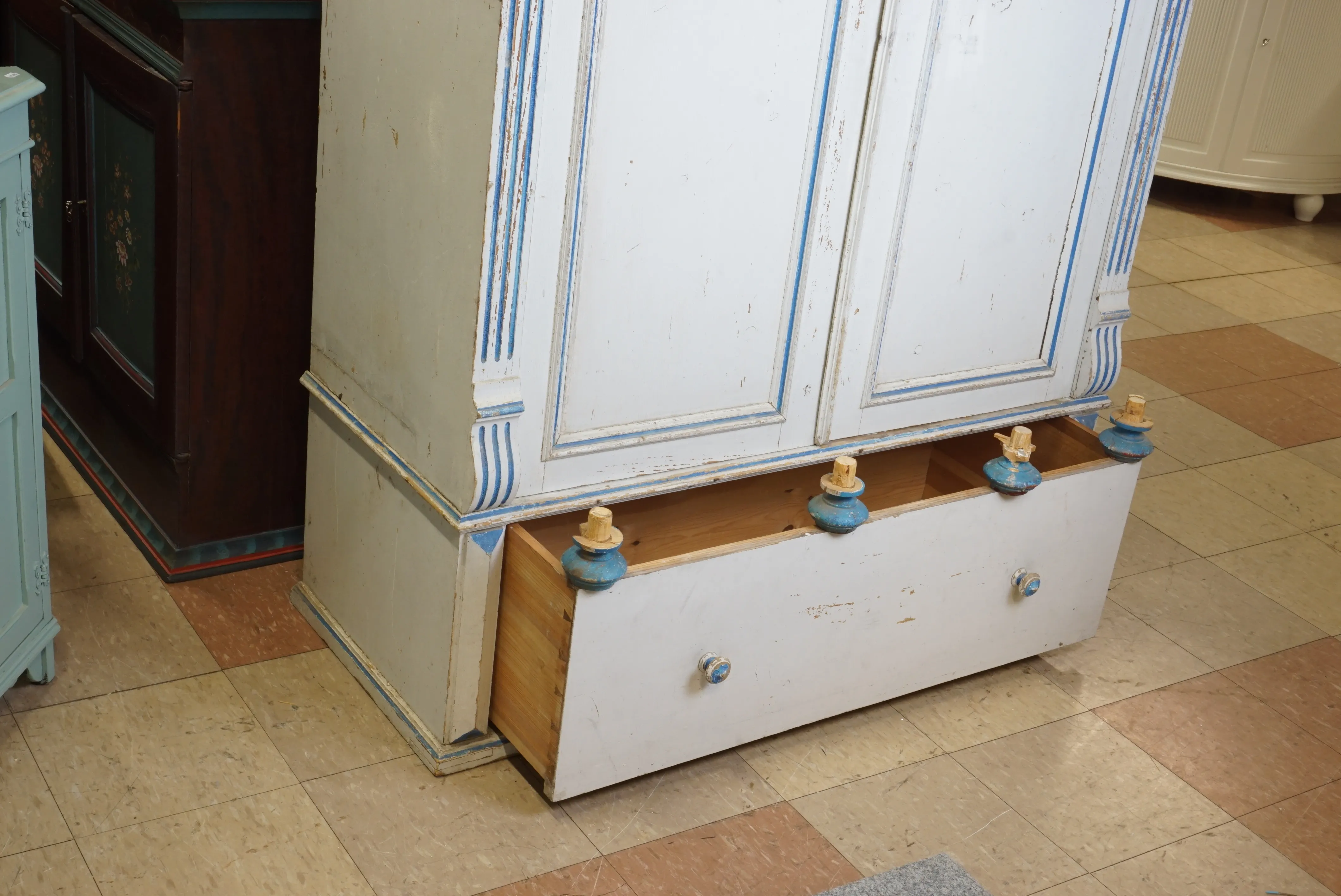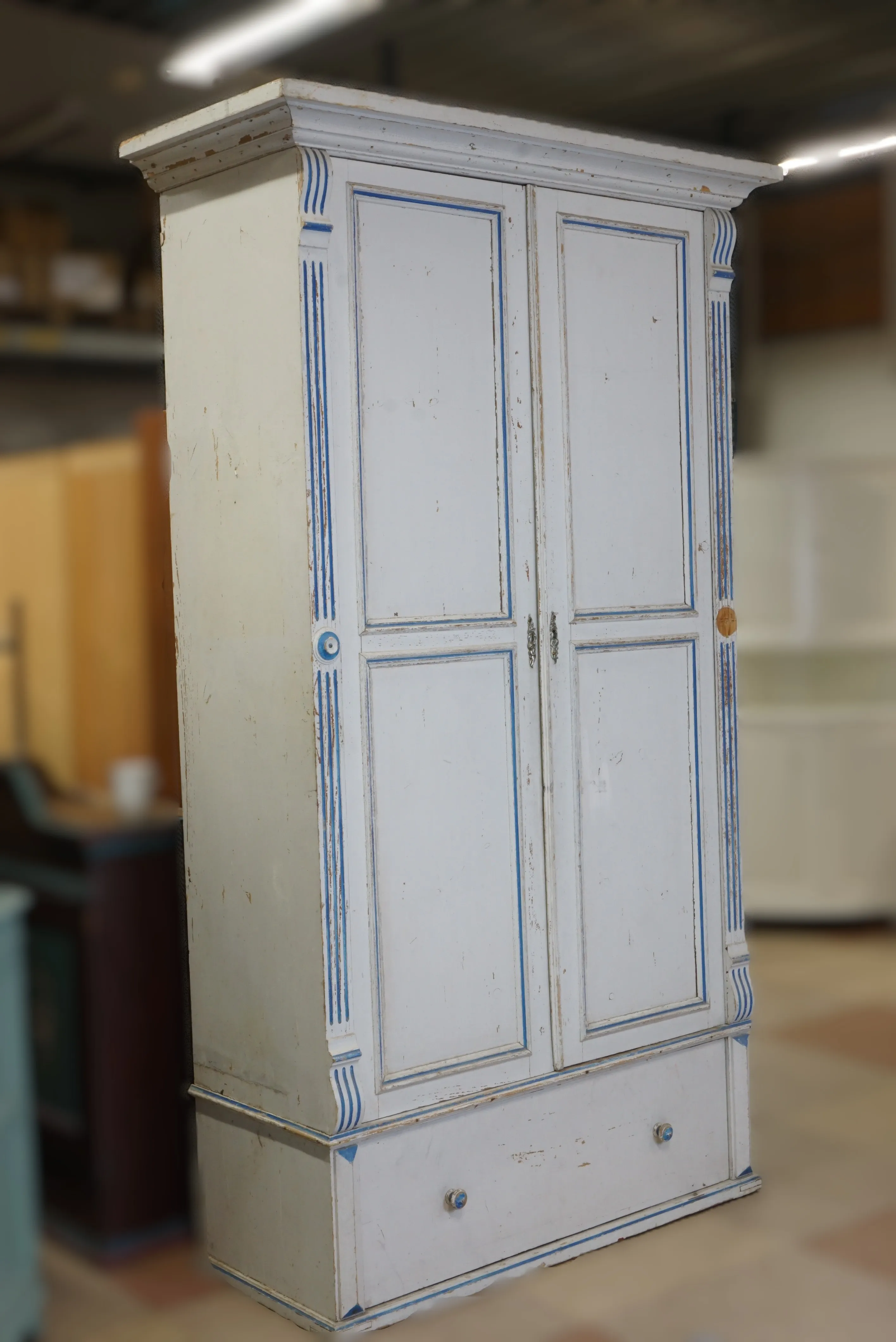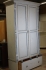 Skåp 1800-tal, vitmålat,åldersslitag, färgbortfall. Saknas ornament, se bild. Total höjd, inkl. fötter: 2m 37 cm B: 120 cm D 52 cm