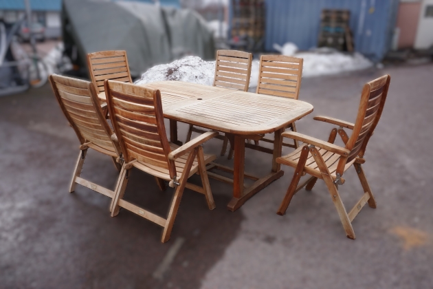 Bord, höjd: 72 cm, bredd: 110 cm, längd: 190 cm Bruksskick. En bräda lite nedsjunken i bordskivan.