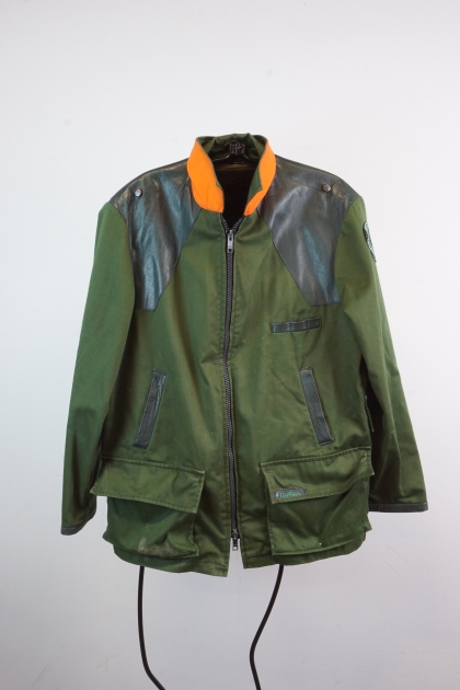 Jaktjacka med teddyfoder. Ej storleksmärkt. Bruksskick. Smuts, källarlukt.